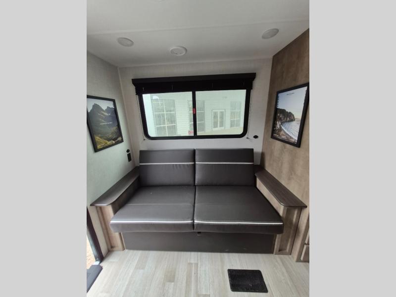 Comfort comes easy in this dual entry travel trailer! You can enter in through the front master bedroom with an Olympic RV queen bed or the rear living area with a sofa. There are also two end tables on either side of the sofa plus a spacious pantry for snacks and dry goods. A three-burner cooktop and air fryer microwave will let you make meals each day, and a booth dinette provides a place to dine together. And don't overlook the walk-through bath that is easily accessible from the bedroom or kitchen!