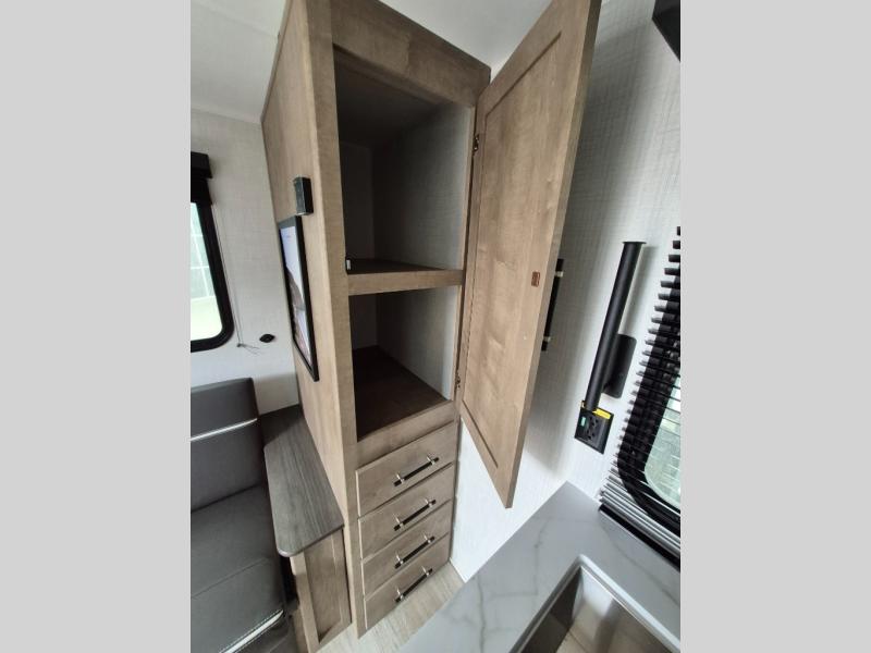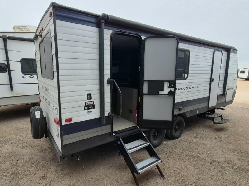 The Springdale travel trailers by Keystone will provide you and your family many great outdoor experiences and at-home comforts. Each one is constructed with a AlphaPly TPO roof membrane, Solid Step entry steps and XL tinted safety glass windows. There are also heavy-duty stabilizer jacks, along with an outside shower, a power awning with LED lights, and each model is SolarFlex ready if you choose to add solar power. Inside, you'll find blackout night shades, pressed membrane premium countertops, a stainless-steel sink, and LED lighting to keep your space well lit.