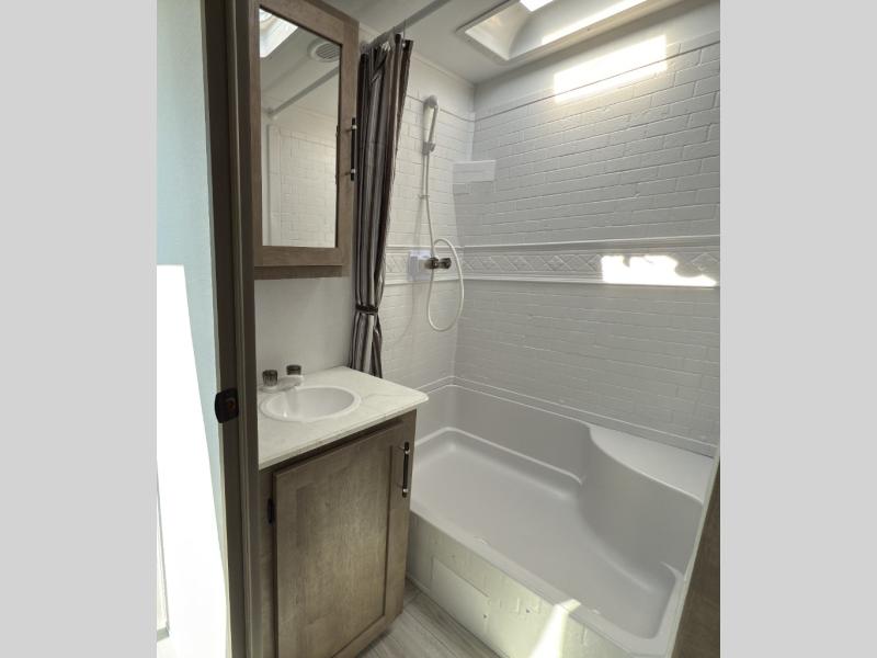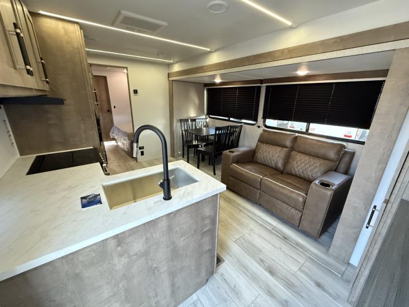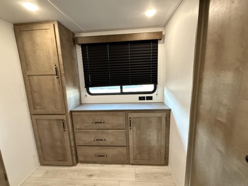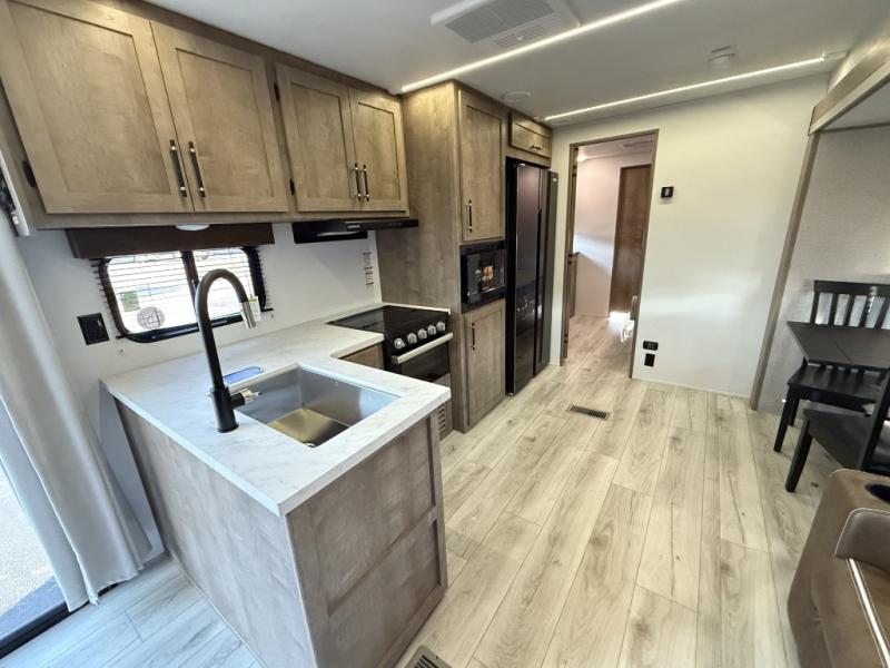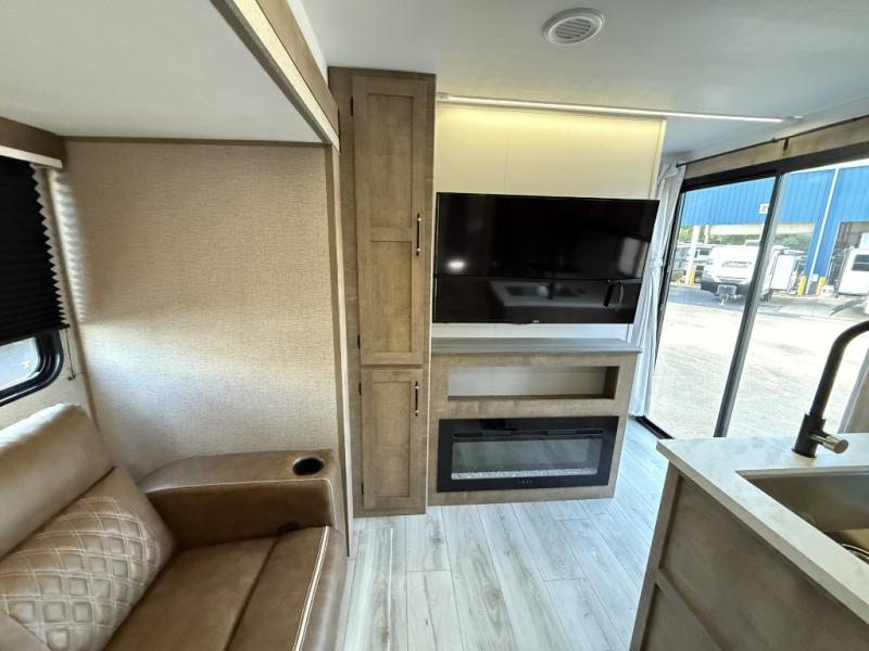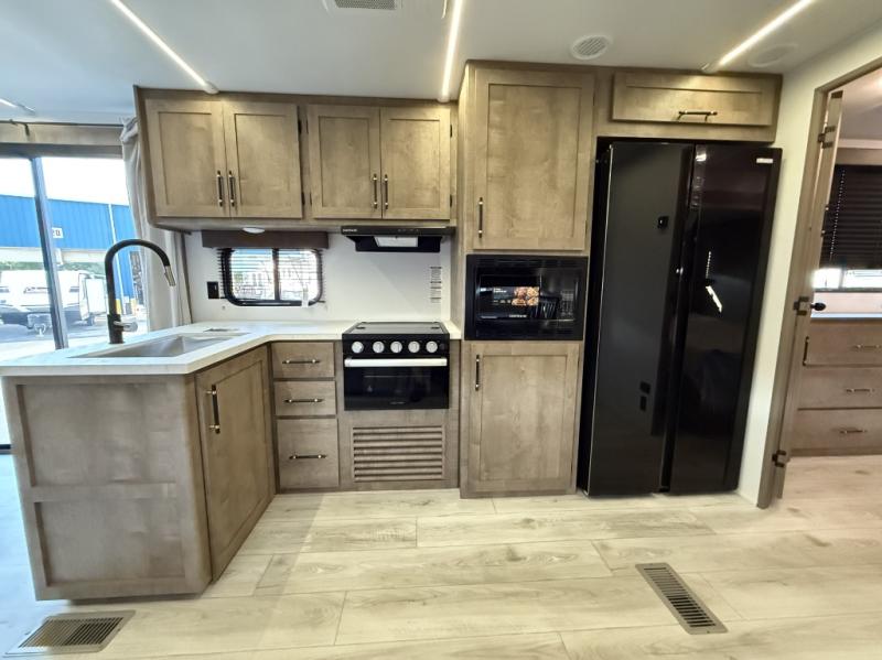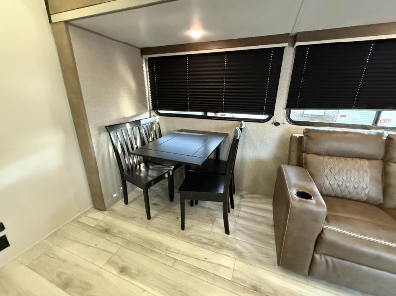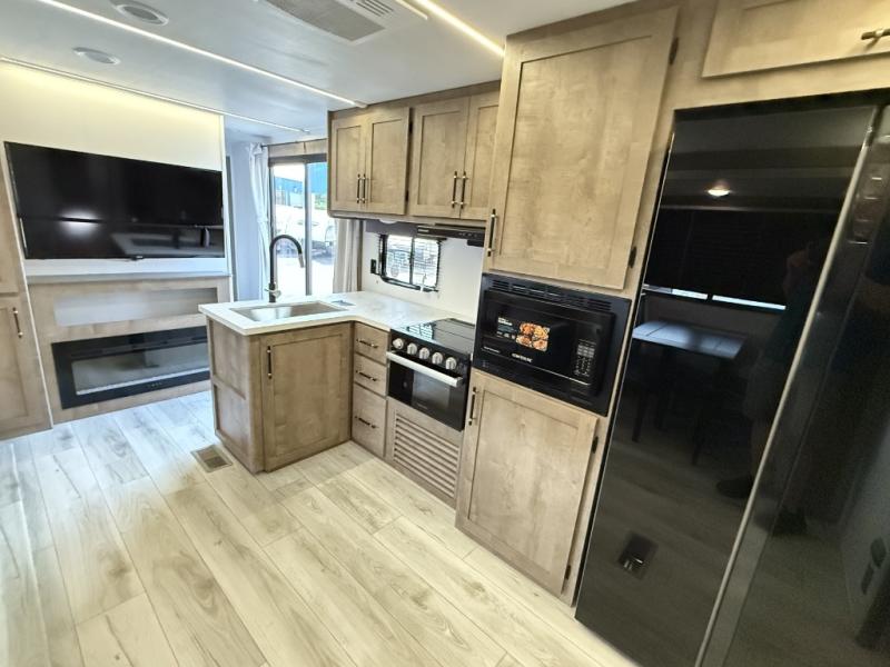 You can't go wrong with this spacious destination travel trailer in tow! Once you arrive at your destination, you can put out the 20' power awning and relax with a cold drink. The full kitchen includes all the appliances needed to make lunch, and you can dine at the flex lounge or relax on the tri-fold sofa. An entertainment center with a fireplace will make this space feel more like home, and the large slide gives the dog space to nap on the floor. The master bedroom towards the back includes a queen bed slide, dual closets and a TV, plus a full rear bath for added convenience. You'll find the second full bath up front by the second bedroom, along with a king bed slide, a spacious closet, plus washer and dryer prep if you choose to add these appliances.
