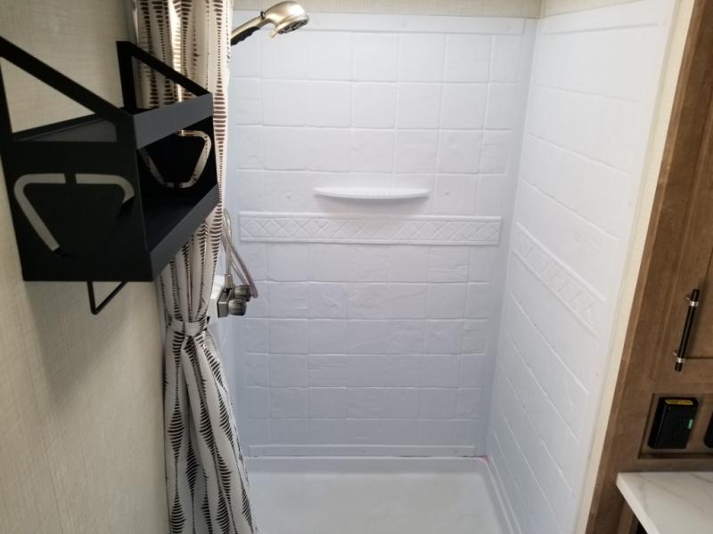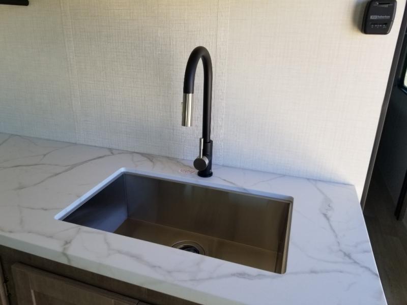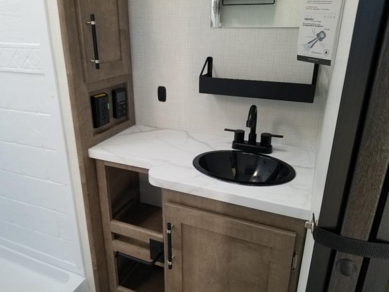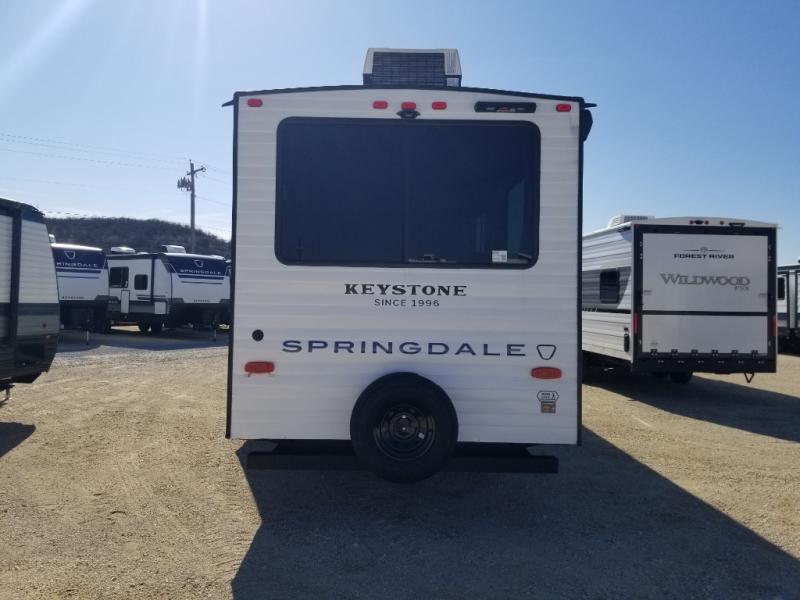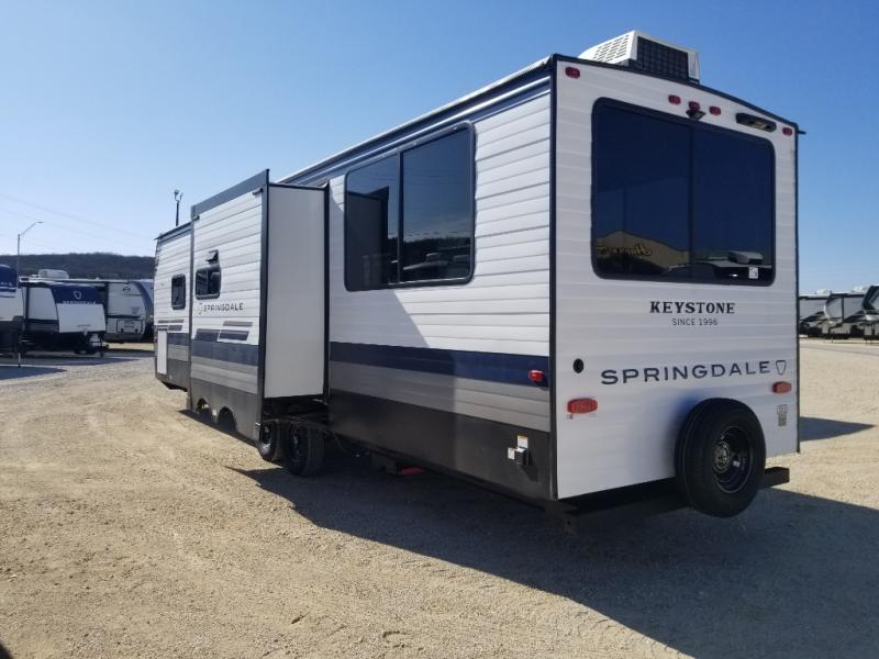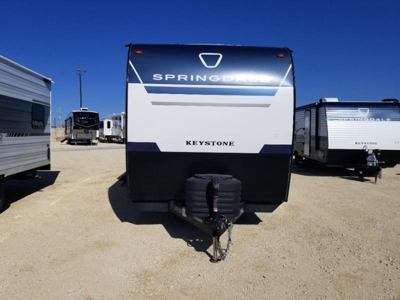 The Springdale MAX travel trailers by Keystone make extended stays easier than ever! Each one is built with an 8' wide construction, along with a flat front metal with tough coat, a fully walkable roof, and XL tinted safety glass windows. The I-beam frame with stamped steel cross-members and outriggers provides added durability, and you'll also appreciate the Tru-Fit slide construction that minimizes functional motor stress and resists leaking. A power tongue jack and power stabilizer jacks are included outside, along with SolidStep entry steps, a power awning with LED lights, and a helpful exterior convenience center. Inside, you'll find generous storage spaces, blackout night shades, USB A and C connections throughout, a hi-rise kitchen faucet, and an upgraded Oxygenics Fury showerhead to name a few comforts!