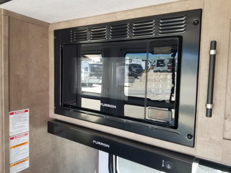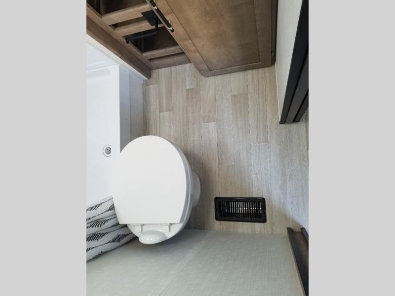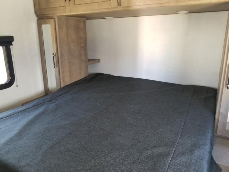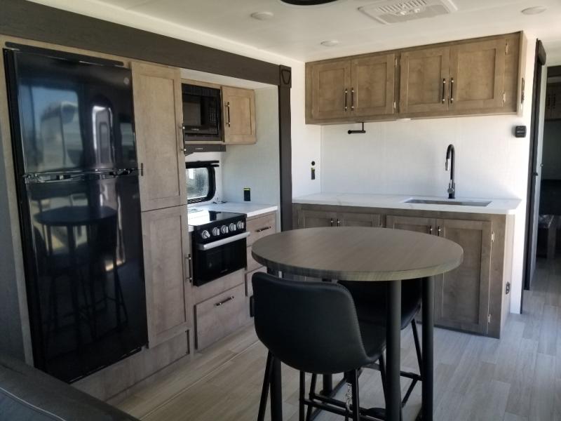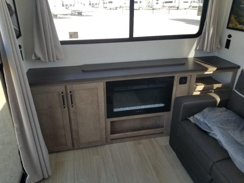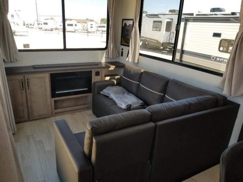 This travel trailer is designed for campers who want residential-style comfort without giving up easy towing, offering a smart and functional layout for everyday living on the road. A sunken living room creates a cozy, separate lounge space, complete with a fireplace and a large sectional sofa that’s perfect for stretching out or hosting friends. In the kitchen area, a bistro table gives you a stylish spot for coffee, meals, or laptops without eating up floor space. At the end of the day, you can retreat to the front bedroom where an Olympic RV queen bed and dual wardrobes provide extra sleeping room and plenty of storage so you can stay organized on every trip.