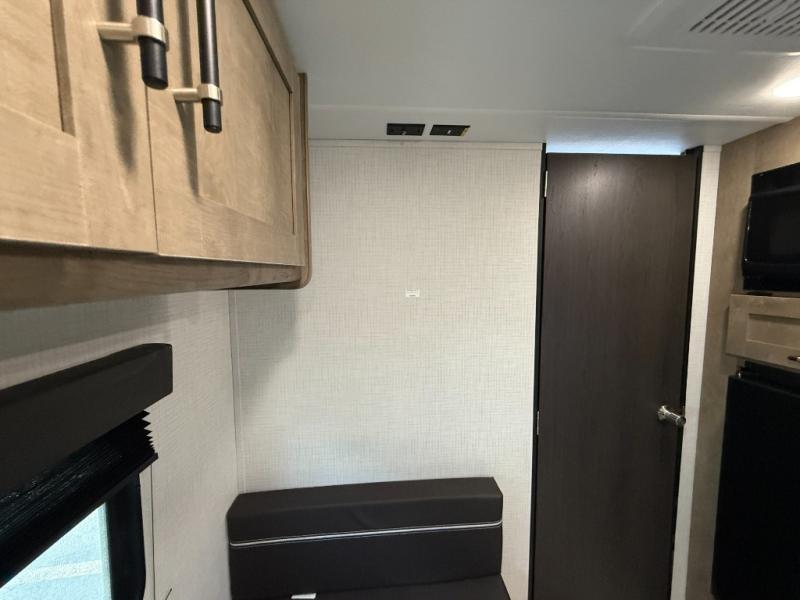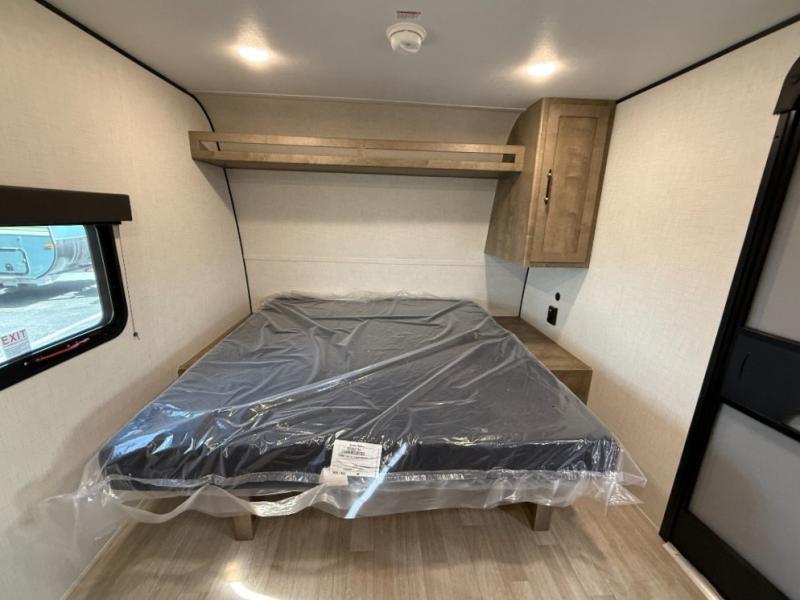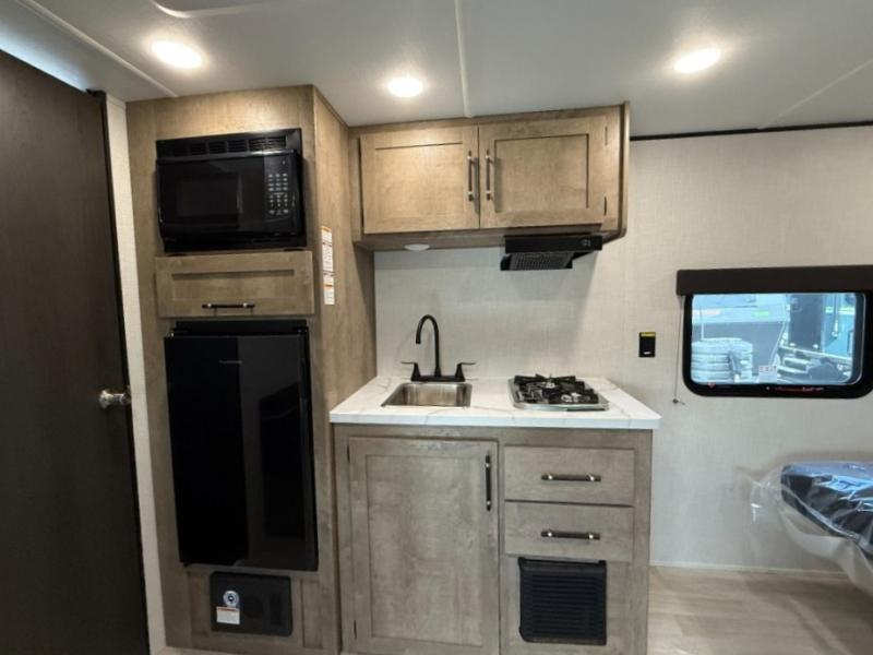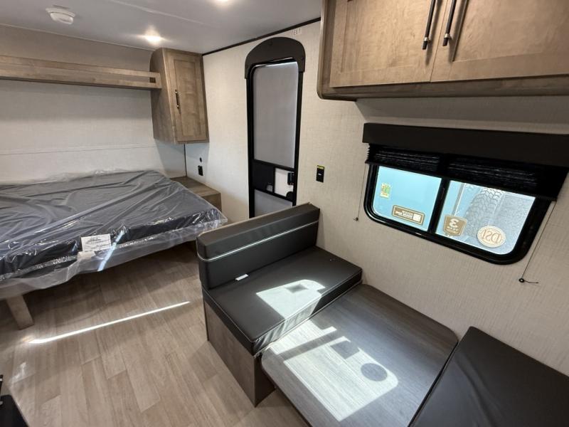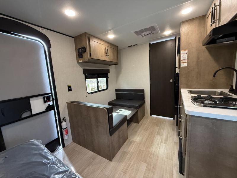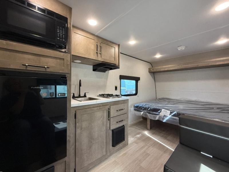 Camping trips just got easier travel trailer that can sleep three to four each night! There is a front Olympic RV queen bed with an overhead shelf and bedside wardrobe for your things. A two-burner cooktop and microwave oven will let you make breakfast for your crew, and a booth dinette provides a place to dine together, as well as convert to sleeping space for a guest or two little ones. This travel trailer also includes a full rear bath, complete with a shower, toilet, and vanity with a sink and overhead cabinet!