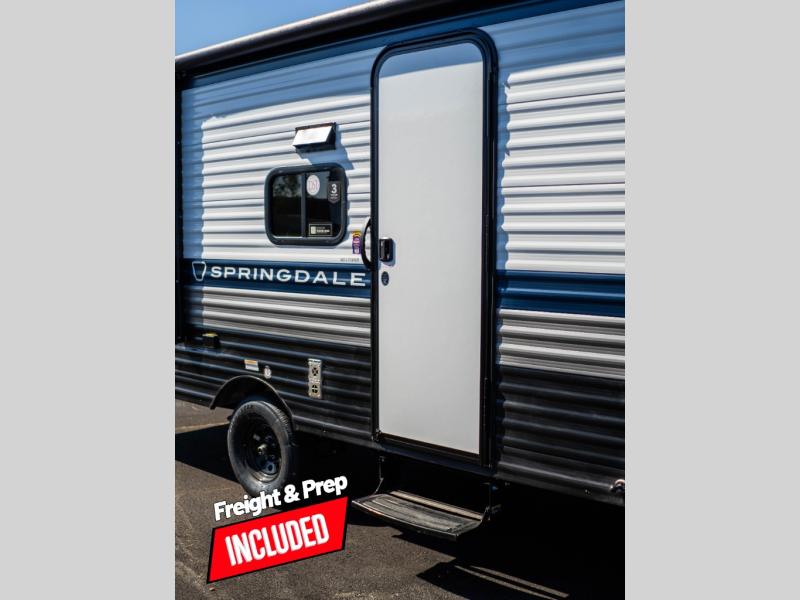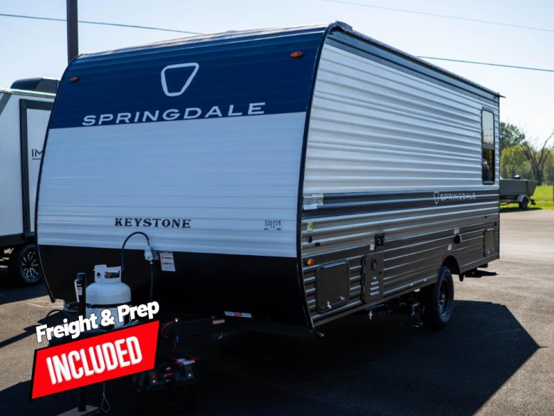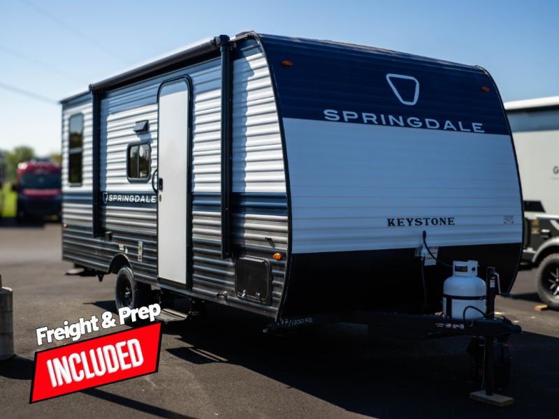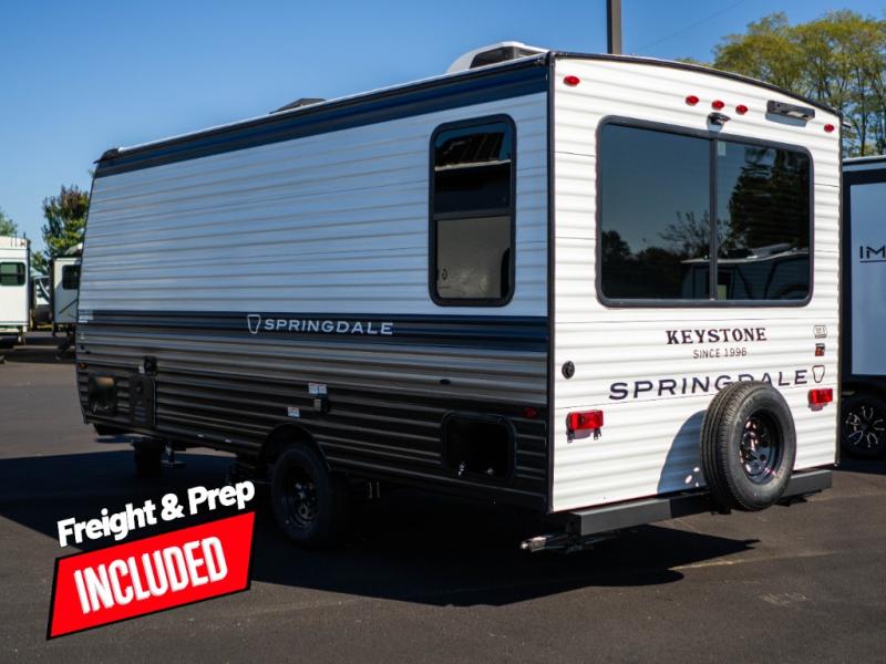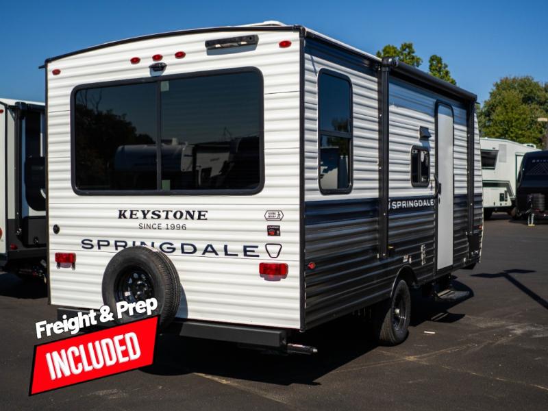 With any Springdale Mini travel trailer by Keystone, you will enjoy lightweight towing thanks to their single-axle! The AlphaPly TPO roof membrane is ultra durable, and the power awning will provide protection from the sun as you relax in your camp chairs outside. Each model includes blackout night shades, LED lighting, plus many more interior comforts. There is also a roof A/C and 20K BTU furnace to keep you comfortable, plus a tankless water heater for endless hot showers!