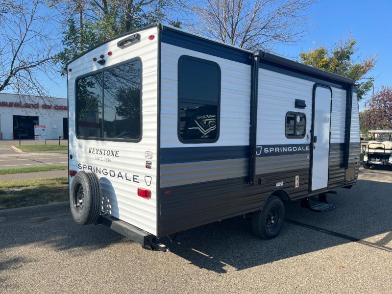 With any Springdale Mini travel trailer by Keystone, you will enjoy lightweight towing thanks to their single-axle! The AlphaPly TPO roof membrane is ultra durable, and the power awning will provide protection from the sun as you relax in your camp chairs outside. Each model includes blackout night shades, LED lighting, plus many more interior comforts. There is also a roof A/C and 20K BTU furnace to keep you comfortable, plus a tankless water heater for endless hot showers!