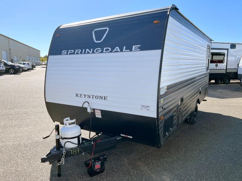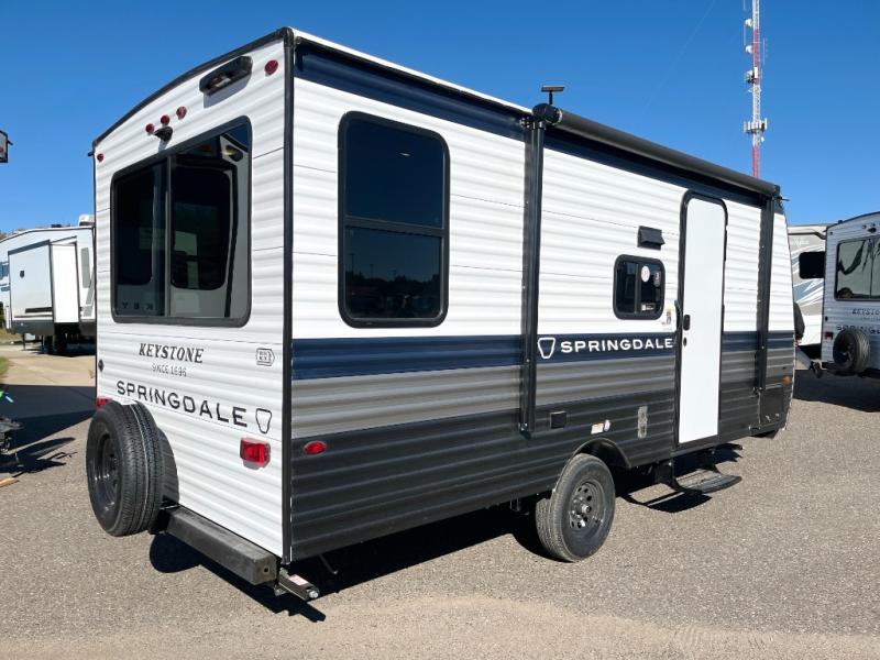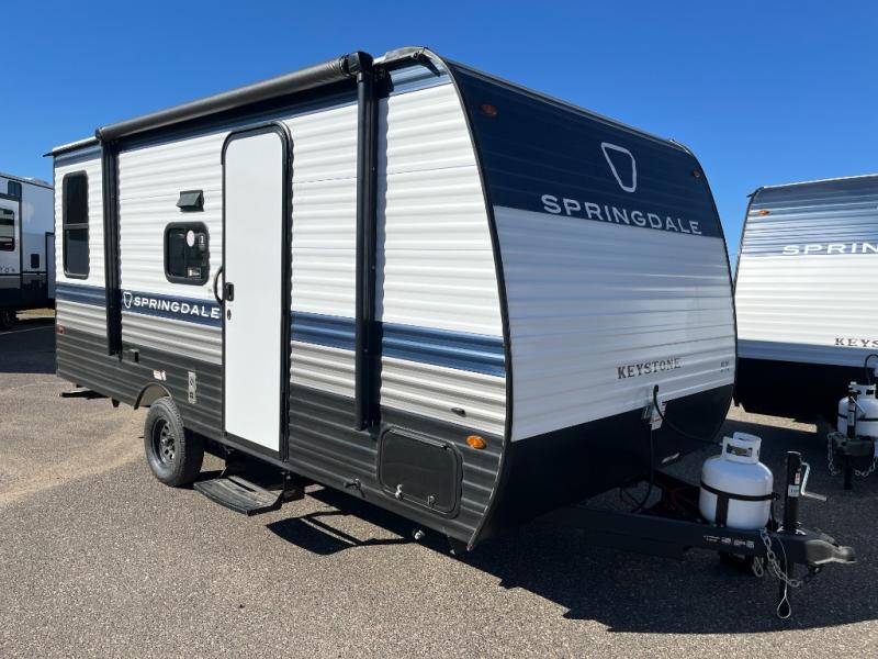 With any Springdale Mini travel trailer by Keystone, you will enjoy lightweight towing thanks to their single-axle! The AlphaPly TPO roof membrane is ultra durable, and the power awning will provide protection from the sun as you relax in your camp chairs outside. Each model includes blackout night shades, LED lighting, plus many more interior comforts. There is also a roof A/C and 20K BTU furnace to keep you comfortable, plus a tankless water heater for endless hot showers!