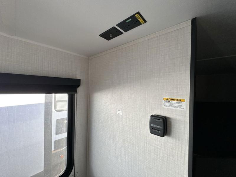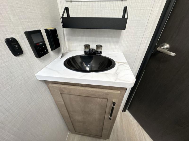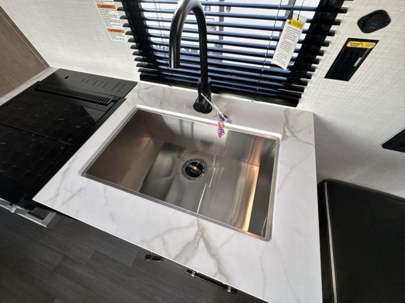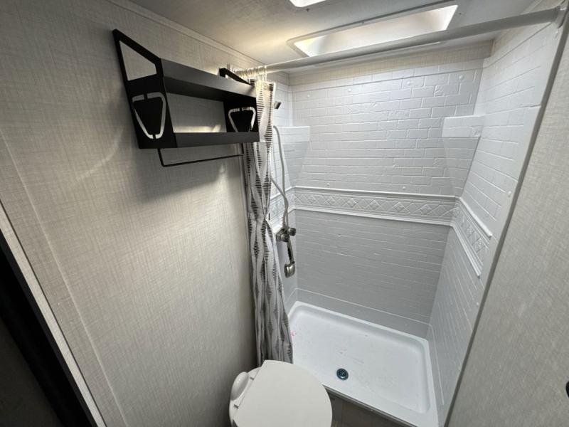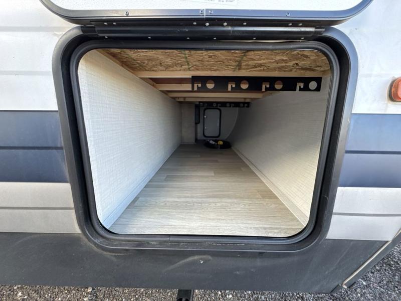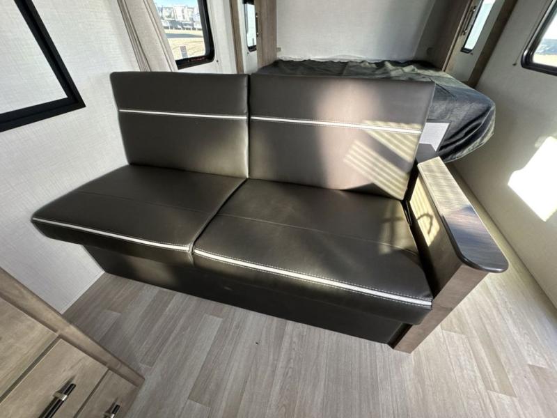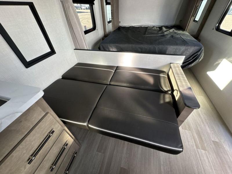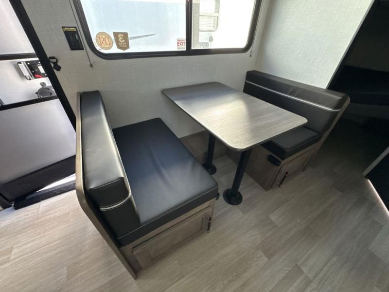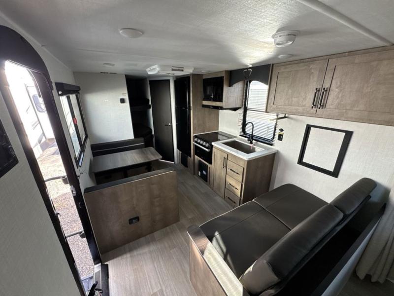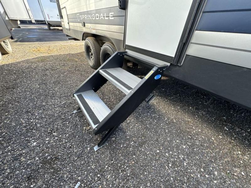 This cute Springdale Mini bunk model will easily sleep seven with the double-size bunks, booth dinette, and queen Murphy bed which features a fold-down sofa at the end. During the daytime, you can have the seating you need and want, and at night the sofa folds to become part of the front bed. The rear corner bath is convenient and features a tub, toilet, and sink. The kitchen is fully equipped to allow you to cook as you travel, and you can enjoy meals while under the 15' power awning.