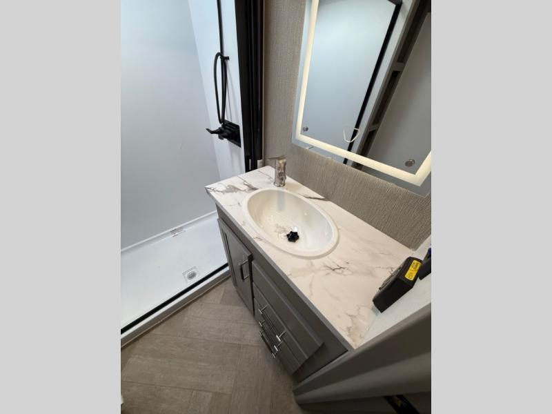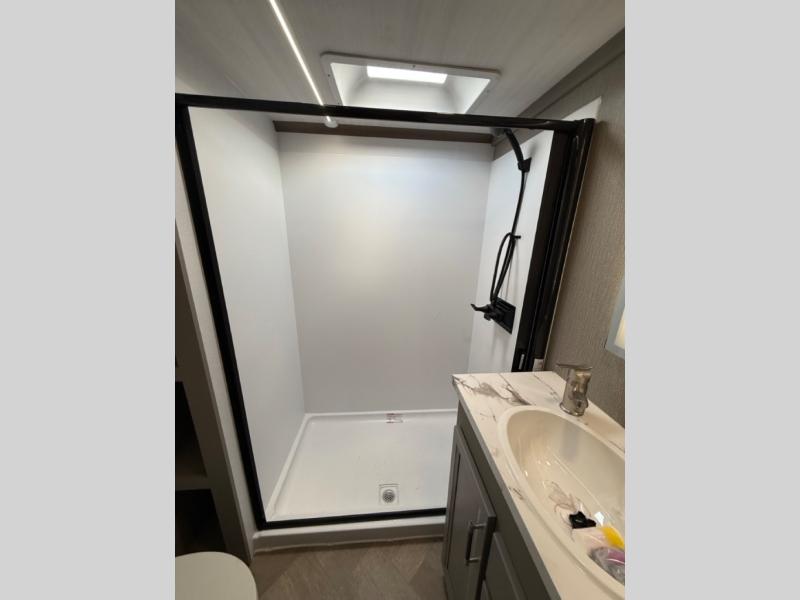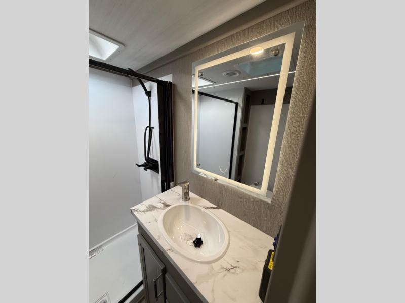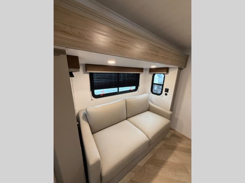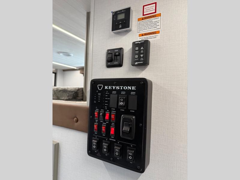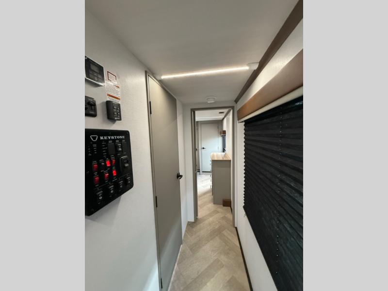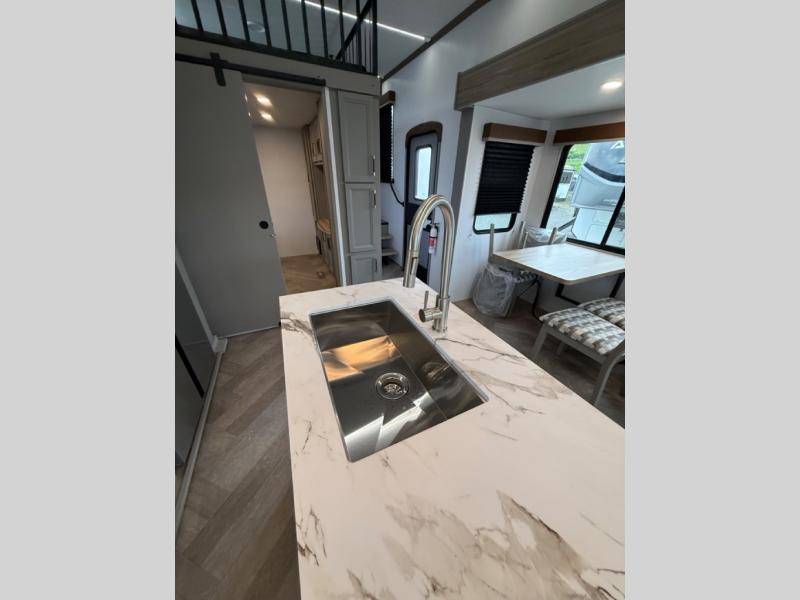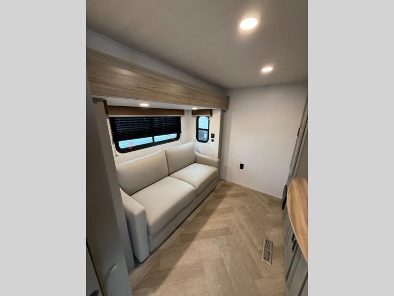 The Sprinter fifth wheels by Keystone feature spacious living areas, plenty of storage, and outstanding towability. Each unit is constructed with 2" aluminum framed and laminated sidewalls, a fully walkable roof, and dual layer insulation to help extend your camping season. The heated pass-through storage includes lockable slam latch baggage doors so you can easily pack your gear, and the one-touch 4-point leveling system features return hookup memory to have you set up in no-time. Head inside to find Congoleum vinyl flooring, Thomas Payne luxury collection furniture, residential style seamless marbled countertops, and an upgraded bedspread to name a few comforts. The Sprinter also includes a Girard tankless on-demand water heater, a central command center, plus a 30k BTU furnace and two A/C units to ensure your comfort!