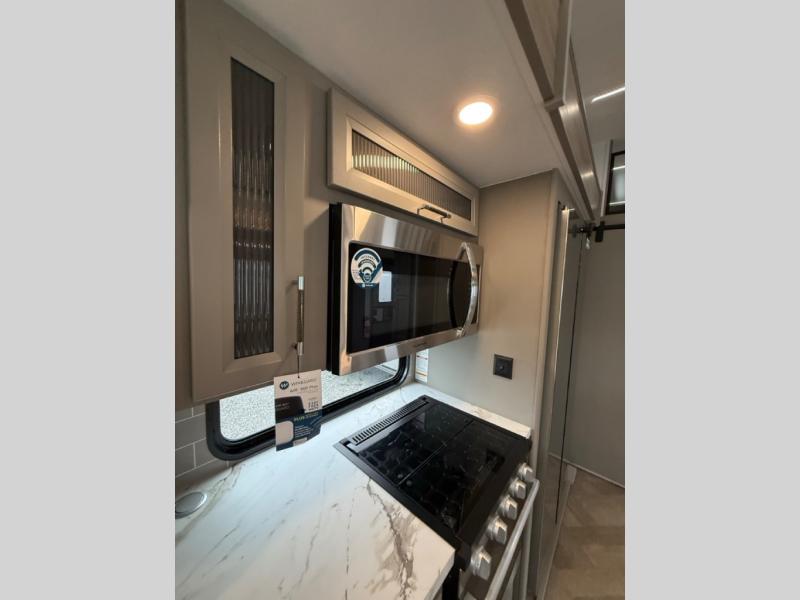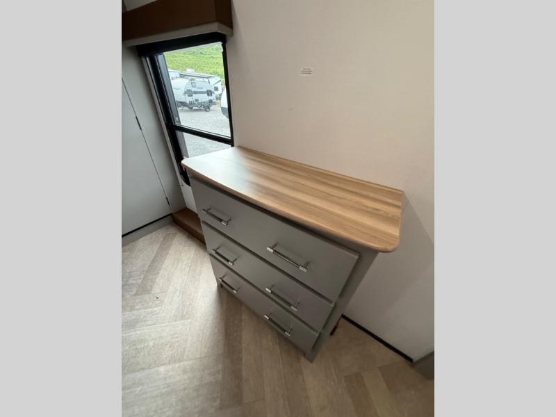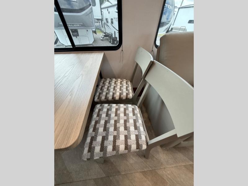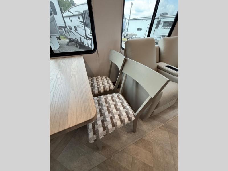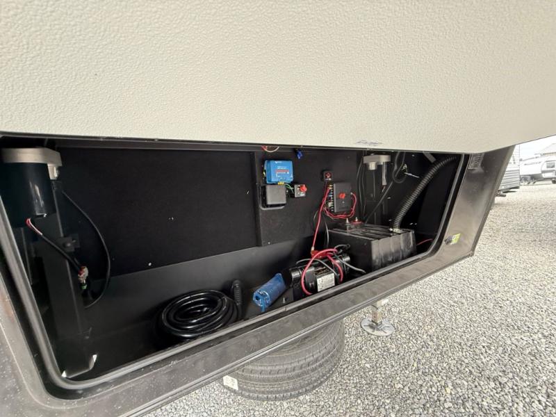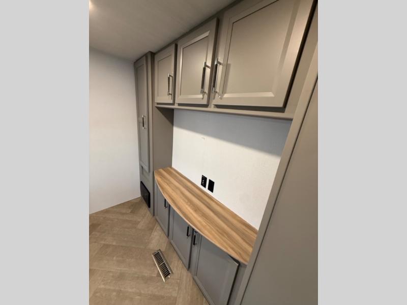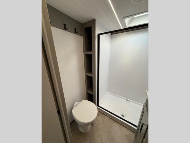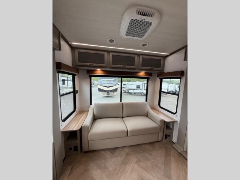 The Sprinter fifth wheels by Keystone feature spacious living areas, plenty of storage, and outstanding towability. Each unit is constructed with 2" aluminum framed and laminated sidewalls, a fully walkable roof, and dual layer insulation to help extend your camping season. The heated pass-through storage includes lockable slam latch baggage doors so you can easily pack your gear, and the one-touch 4-point leveling system features return hookup memory to have you set up in no-time. Head inside to find Congoleum vinyl flooring, Thomas Payne luxury collection furniture, residential style seamless marbled countertops, and an upgraded bedspread to name a few comforts. The Sprinter also includes a Girard tankless on-demand water heater, a central command center, plus a 30k BTU furnace and two A/C units to ensure your comfort!
