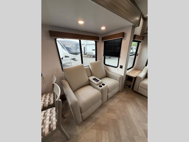 This unit not only has a king-size bed up front in a private bedroom, but it also has a second bedroom with a queen-size tri-fold sofa, making it perfect to invite friends along. Above this second bedroom you'll also have more sleeping space in a loft with storage, and another tired camper can sleep on the 72" sofa out in the main living area. The kitchen offers you an island for more room while cooking and a pantry for your snacks. Sit down and eat a hot meal at the booth dinette with hinged storage access, and get even more comfortable on the full-reclining theater seating with massage, lights, and USB.