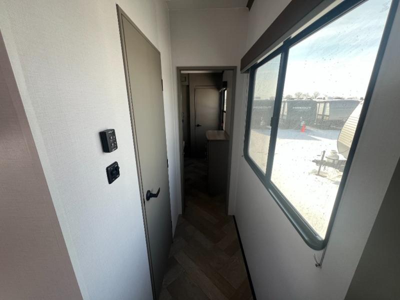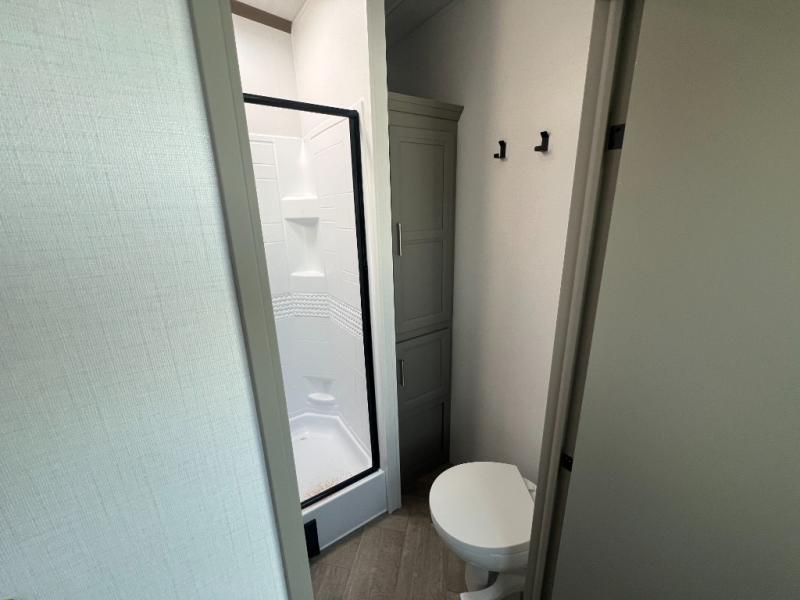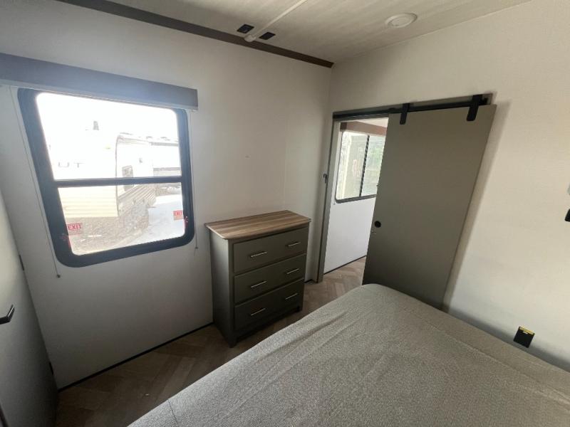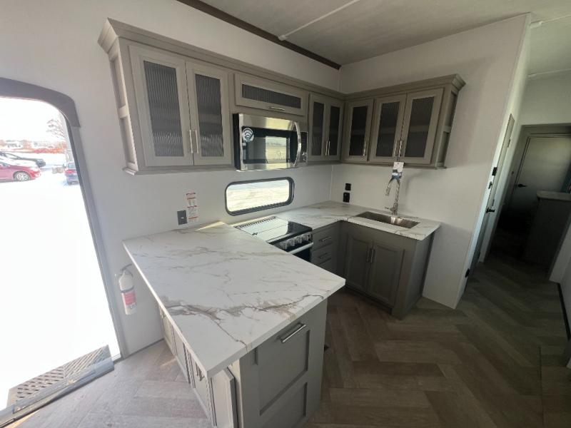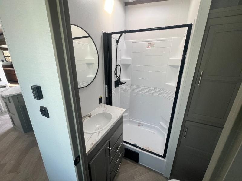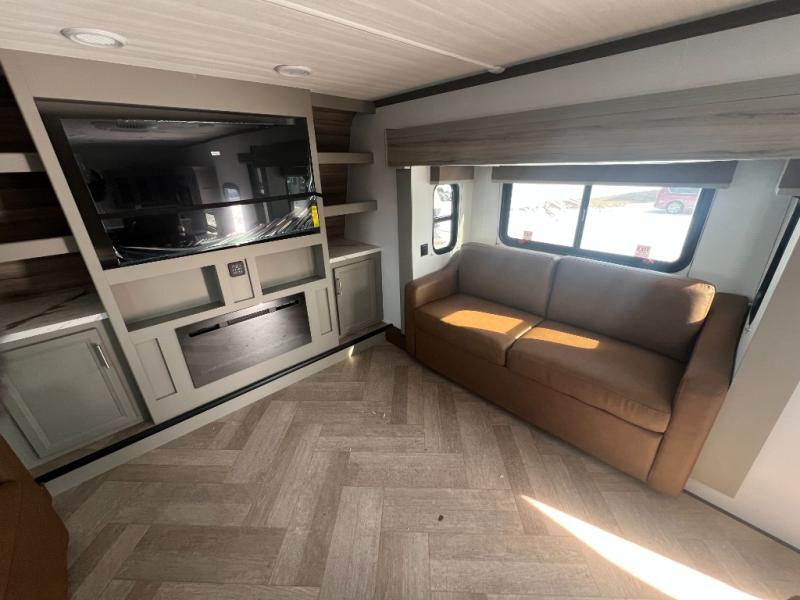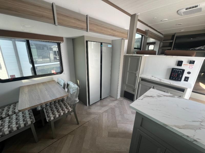 The Sprinter fifth wheels by Keystone feature spacious living areas, plenty of storage, and outstanding towability. Each unit is constructed with 2" thick double welded aluminum frame construction, a fully walkable roof and slide out roof, and dual layer insulation to help extend your camping season. The heated pass-through storage includes lockable slam latch baggage doors so you can easily pack your gear, and the one-touch 4-point leveling system features return hookup memory to have you set up in no-time. Head inside to find DynaSpan Marine Grade floor decking, Thomas Payne luxury collection furniture and residential style seamless marbled countertops to name a few comforts. The Sprinter also includes a Suburban tankless on-demand water heater, black out aluminum wheels, plus a 30k BTU furnace to ensure your comfort!