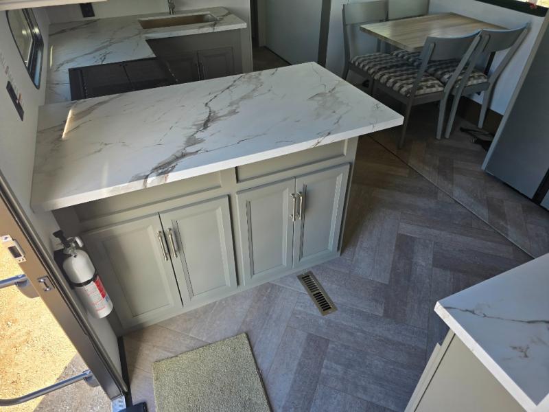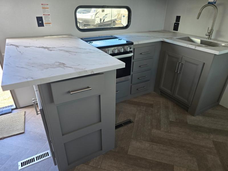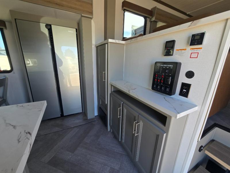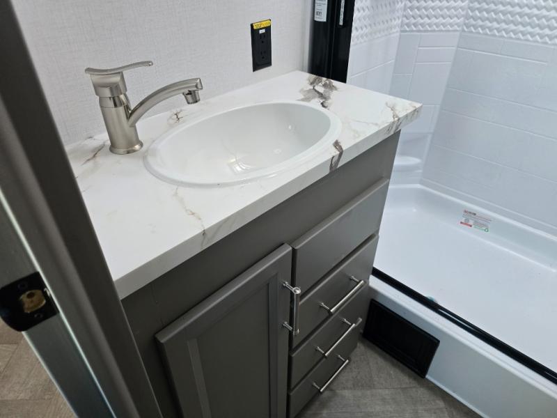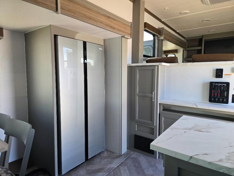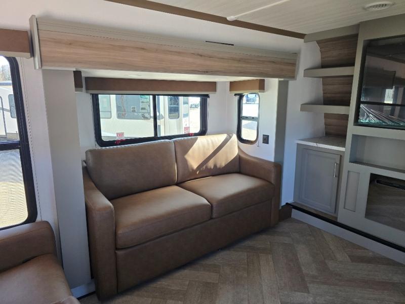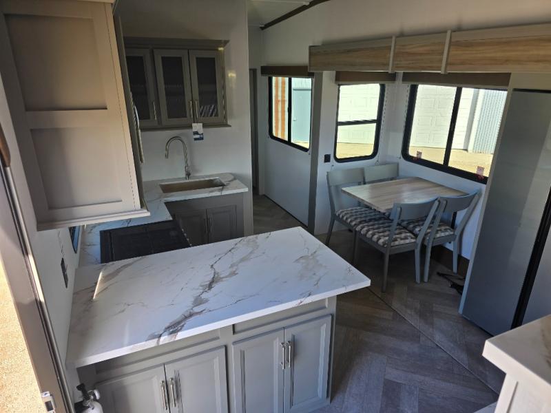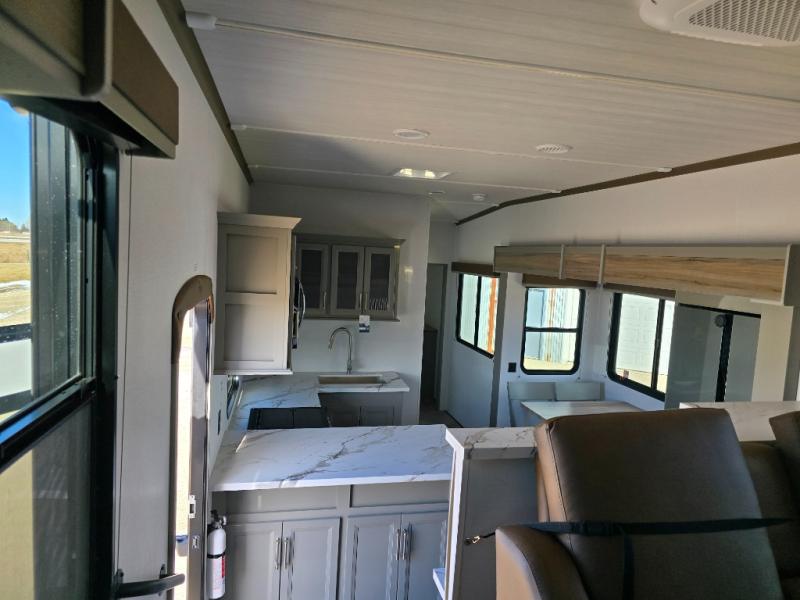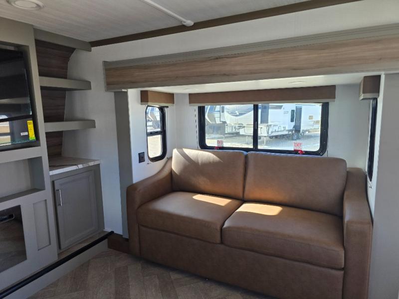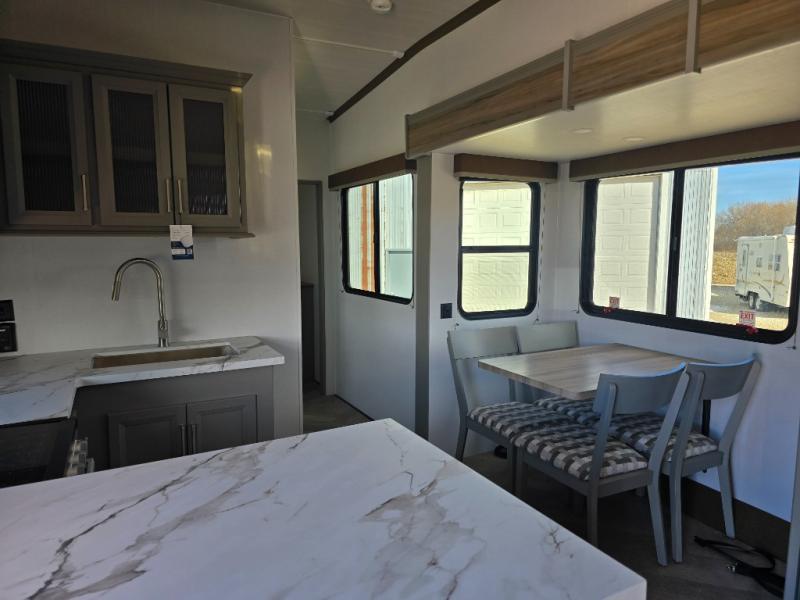 The Sprinter fifth wheels by Keystone feature spacious living areas, plenty of storage, and outstanding towability. Each unit is constructed with 2" thick double welded aluminum frame construction, a fully walkable roof and slide out roof, and dual layer insulation to help extend your camping season. The heated pass-through storage includes lockable slam latch baggage doors so you can easily pack your gear, and the one-touch 4-point leveling system features return hookup memory to have you set up in no-time. Head inside to find DynaSpan Marine Grade floor decking, Thomas Payne luxury collection furniture and residential style seamless marbled countertops to name a few comforts. The Sprinter also includes a Suburban tankless on-demand water heater, black out aluminum wheels, plus a 30k BTU furnace to ensure your comfort!