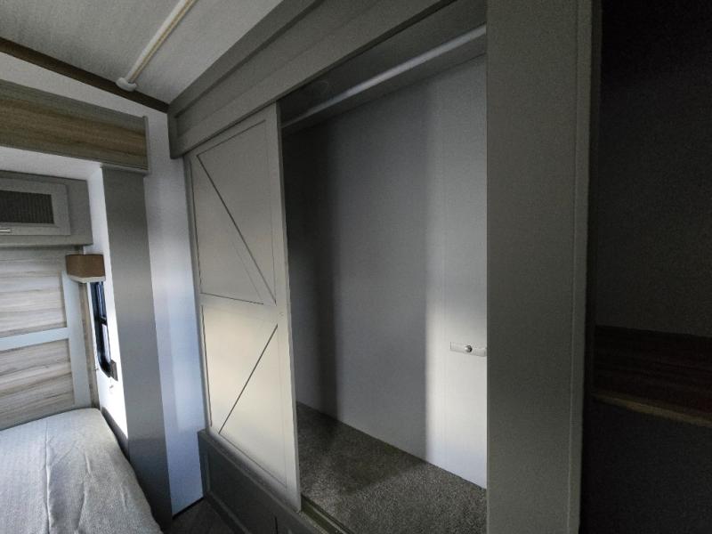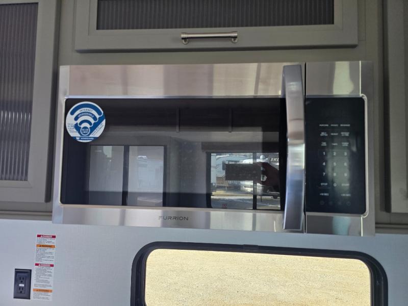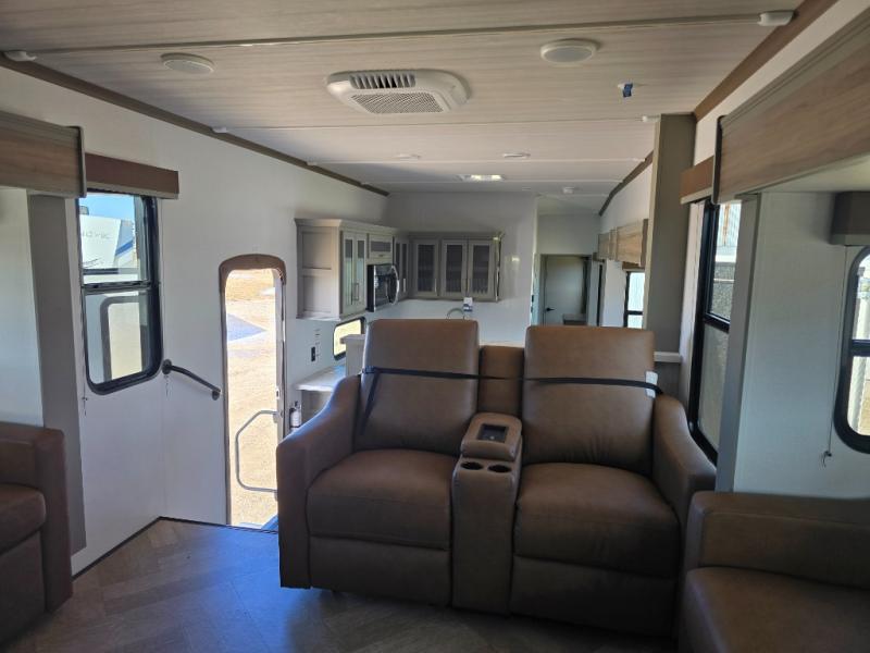 This Sprinter fifth wheel is yours for the taking! You can enter through an XL 30" friction-hinge entry door to find a great kitchen decked out with a range with a glass top, a 30" microwave, a breakfast bar, a 16 cu. ft. refrigerator, a pantry, and a coffee bar. After you whip up dinner and a fabulous dessert, you can enjoy them at the wall-mounted dinette with four chairs. The separate living room has a residential feel with its fireplace, 50" LED HDTV, two queen-size tri-fold sofas, and full-reclining theater seating with massage, lights, and USB. If you find yourself tired out from the day's travels, you can head straight to the rear private bedroom to fall asleep on the 70" x 80" king-size bed after taking a hot shower in the residential shower and change into some comfortable pijamas from the wadrobe and dresser in the bedroom.