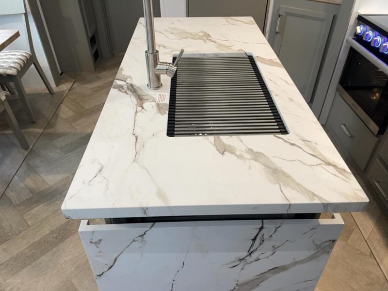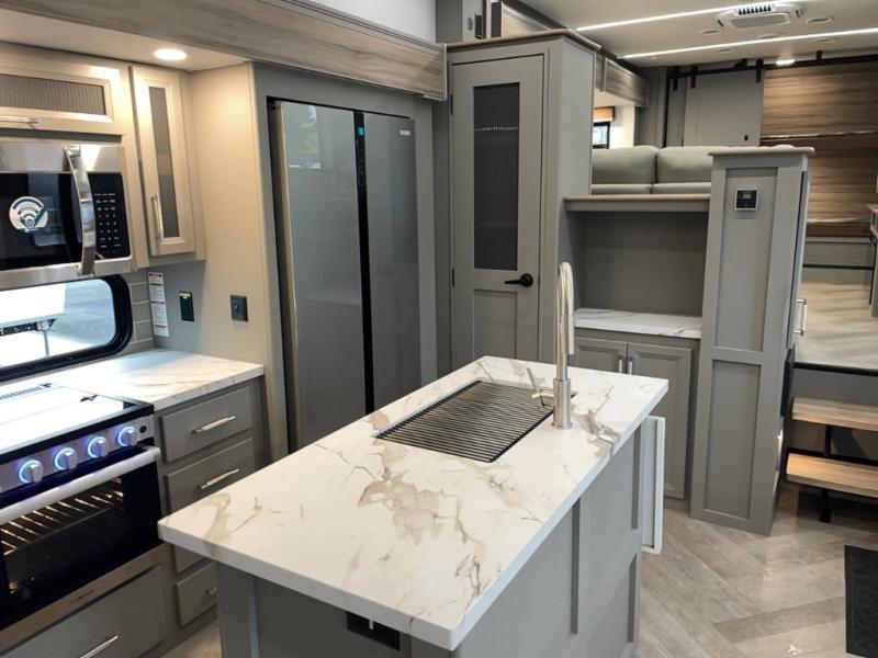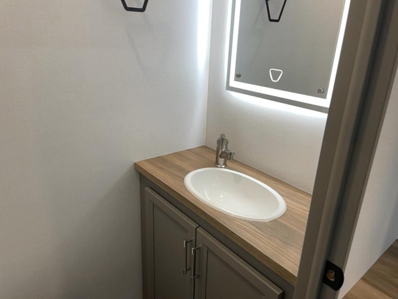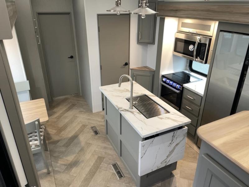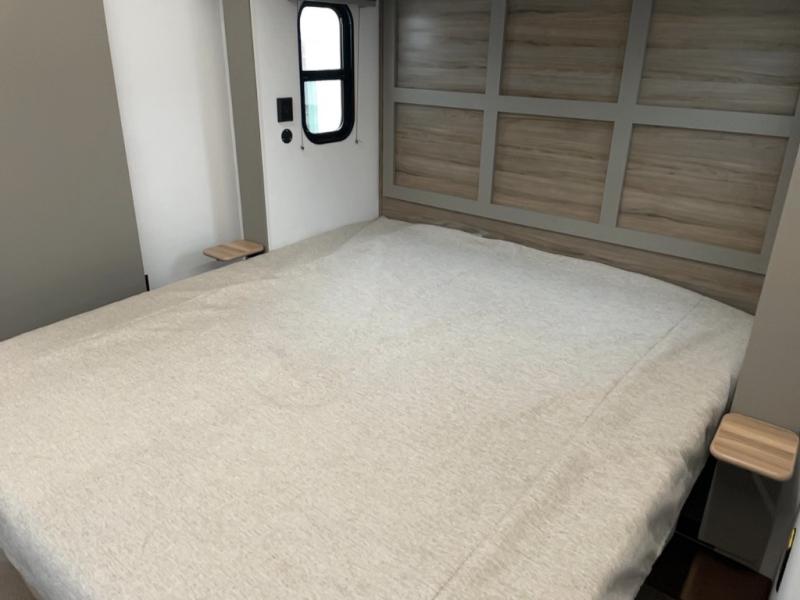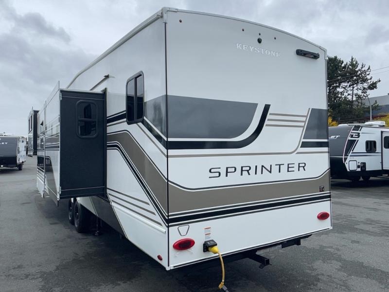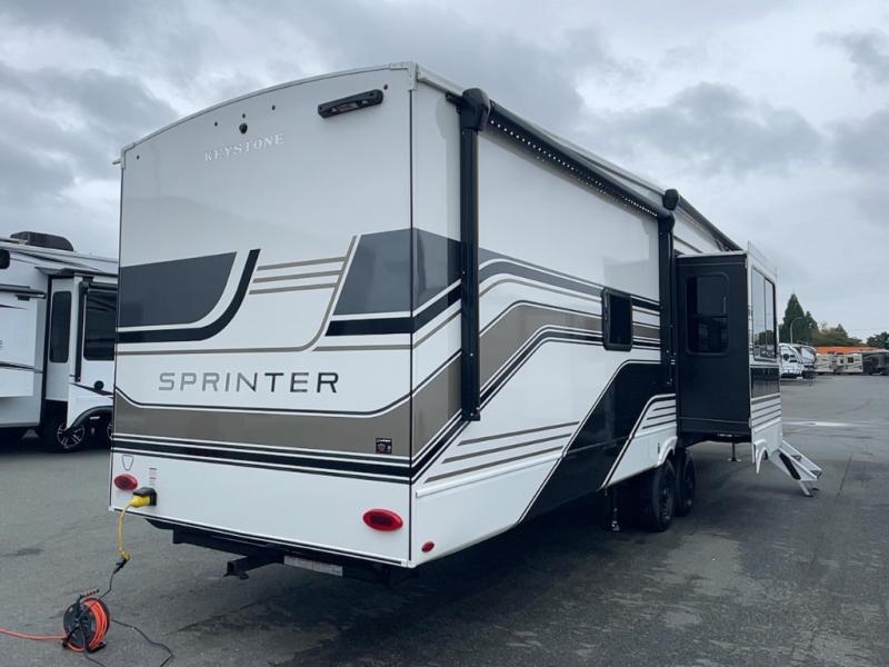 The Sprinter fifth wheels by Keystone feature spacious living areas, plenty of storage, and outstanding towability. Each unit is constructed with 2" aluminum framed and laminated sidewalls, a fully walkable roof, and dual layer insulation to help extend your camping season. The heated pass-through storage includes lockable slam latch baggage doors so you can easily pack your gear, and the one-touch 4-point leveling system features return hookup memory to have you set up in no-time. Head inside to find Congoleum vinyl flooring, Thomas Payne luxury collection furniture, residential style seamless marbled countertops, and an upgraded bedspread to name a few comforts. The Sprinter also includes a Girard tankless on-demand water heater, a central command center, plus a 30k BTU furnace and two A/C units to ensure your comfort!