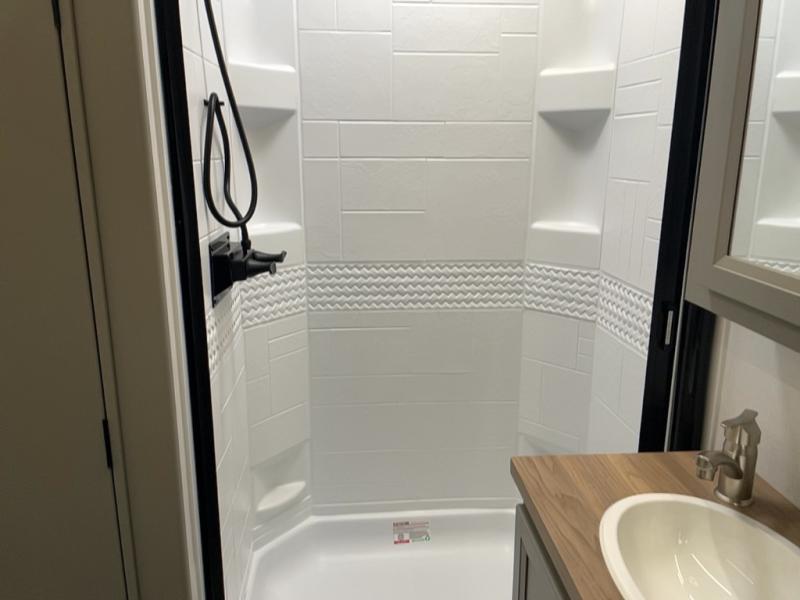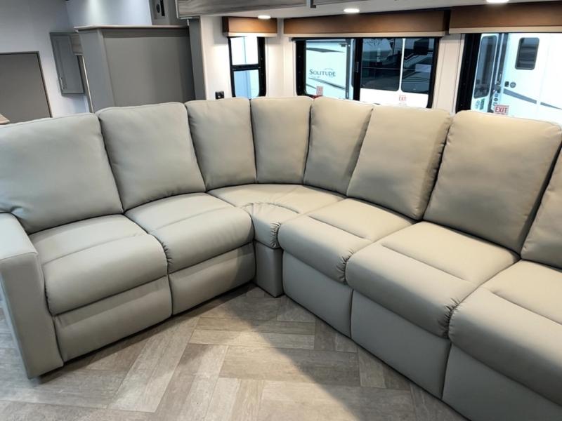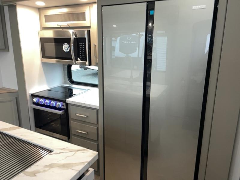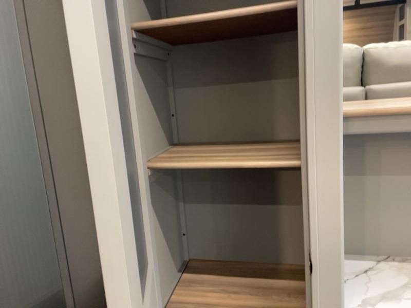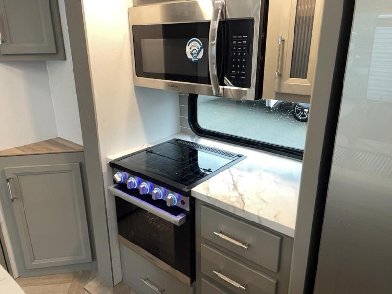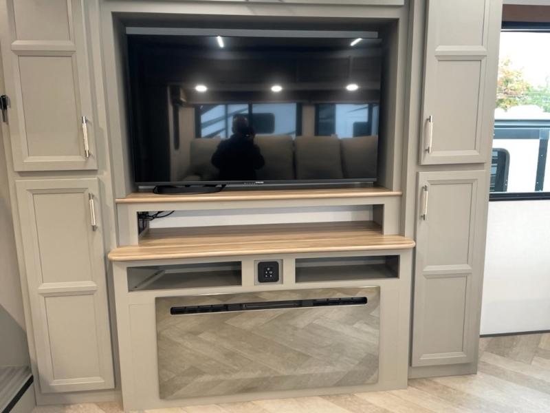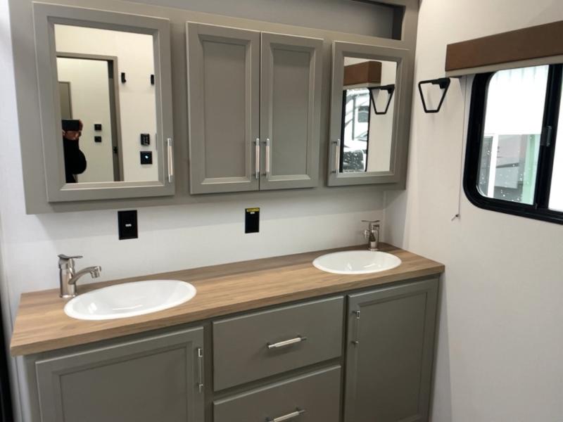 Pack your bags and head to your favorite state park in this four slide out fifth wheel. Up front, the bunkhouse suite includes two bunk beds, a desk, a slide out with a TV hookup, and a half bath for convenience. You'll have the master bedroom all to yourselves with a king bed slide out, plenty of storage, and a full rear bath with dual bath sinks so you both can get ready for bed at once. The chef of your group can make meals on the three burner gas range or in the stainless steel microwave, and food can be stored in the 12V refrigerator and pantry. A booth dinette provides a place to dine, or you can choose the optional free-standing dinette. And the full reclining theater seating across from the fireplace and 50" TV will make movie night cozy!