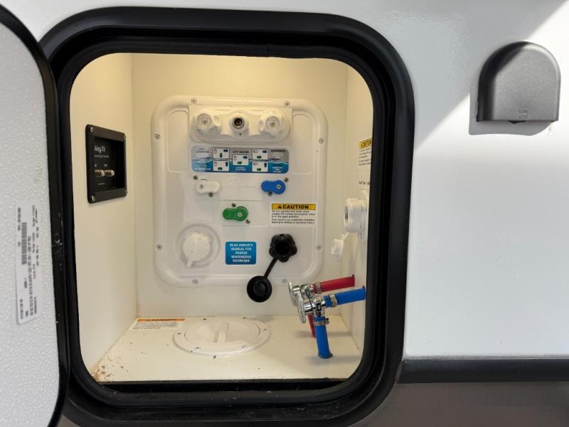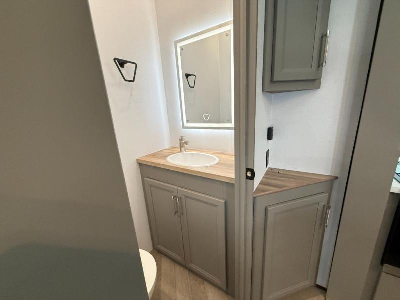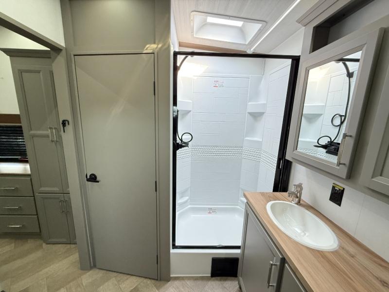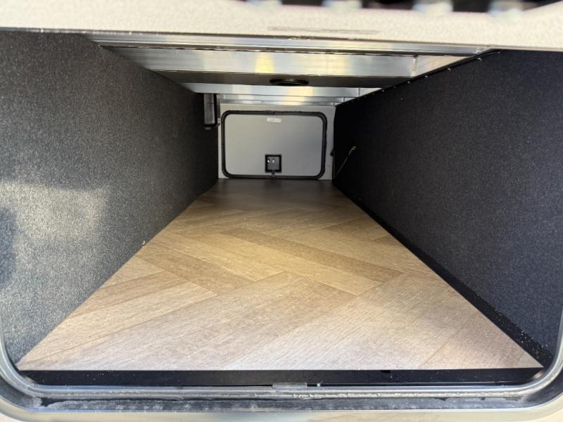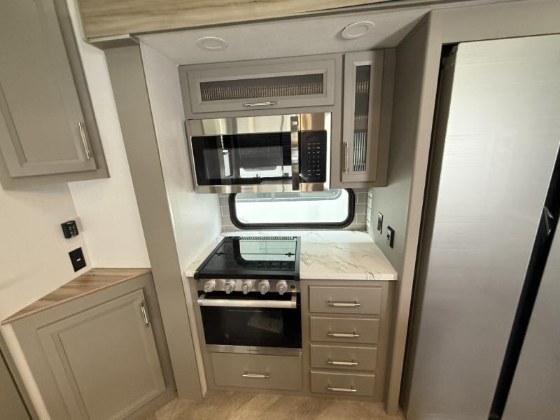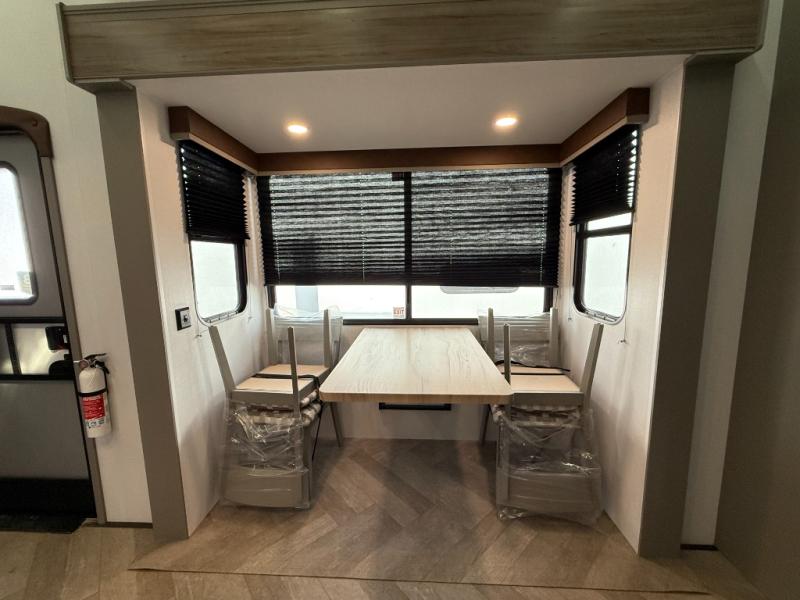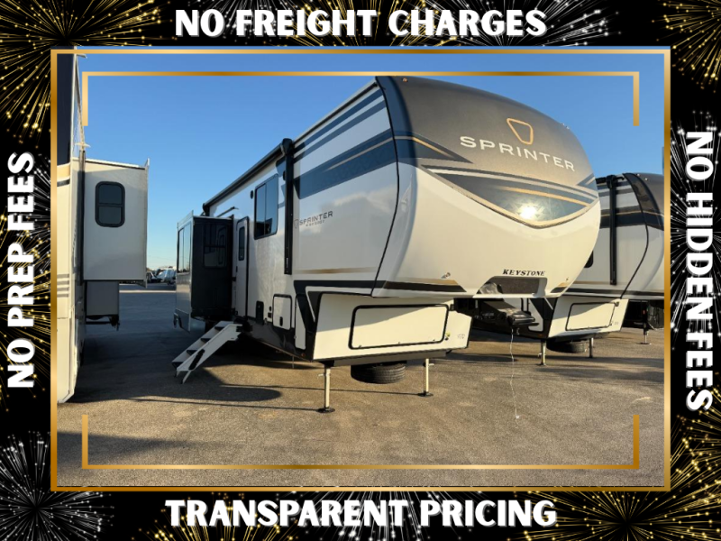 The Sprinter fifth wheels by Keystone feature spacious living areas, plenty of storage, and outstanding towability. Each unit is constructed with 2" thick double welded aluminum frame construction, a fully walkable roof and slide out roof, and dual layer insulation to help extend your camping season. The heated pass-through storage includes lockable slam latch baggage doors so you can easily pack your gear, and the one-touch 4-point leveling system features return hookup memory to have you set up in no-time. Head inside to find DynaSpan Marine Grade floor decking, Thomas Payne luxury collection furniture and residential style seamless marbled countertops to name a few comforts. The Sprinter also includes a Suburban tankless on-demand water heater, black out aluminum wheels, plus a 30k BTU furnace to ensure your comfort!