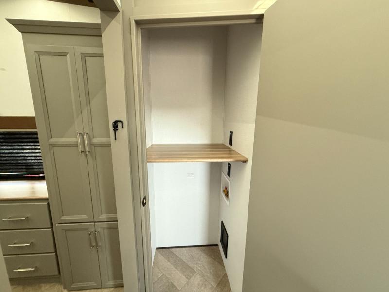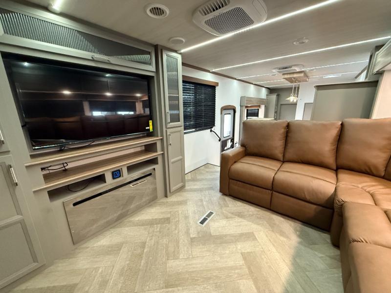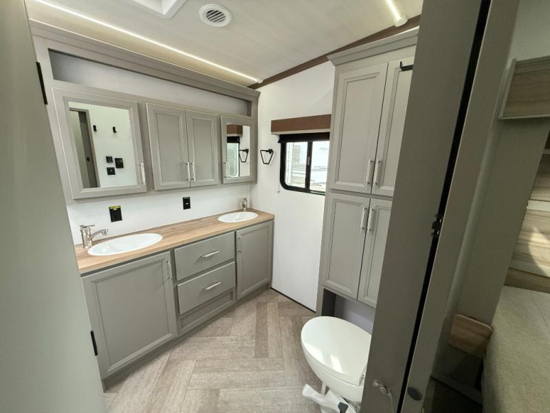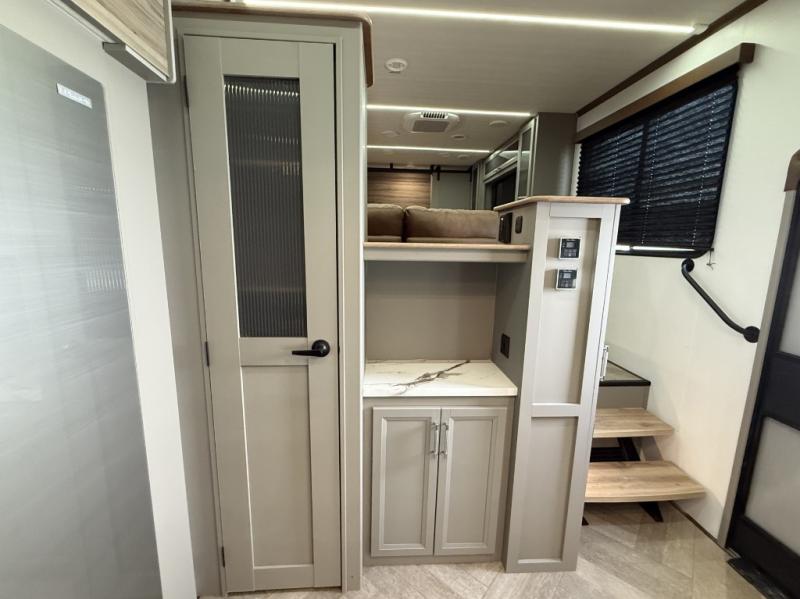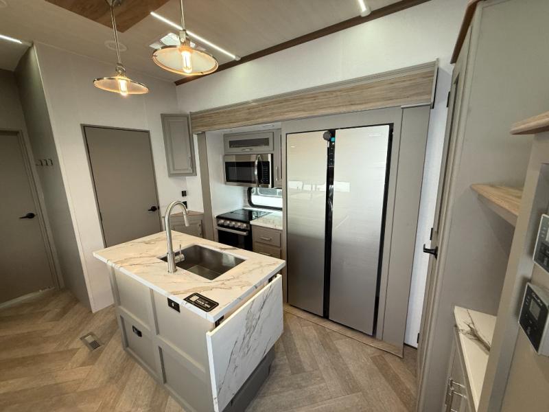 At the front, the inviting living area features a large L-shaped sofa, perfect for relaxing, with a cozy fireplace and 50" TV across from it for enjoyable movie nights. Tucked nearby are hidden bunks and storage cubbies, providing extra sleeping space and convenient organization. In the center of the trailer, the full kitchen opens up with dual slide-outs for added room, including a slide with a Furrion three-burner gas range, overhead cabinetry, and a generous 16 cu. ft. refrigerator for groceries. A nearby pantry and coffee bar keep dry goods organized and make mornings easy. The kitchen island with sink and flip-up counter extension offers ample prep space, while the opposite slide features a free-standing dinette ideal for meals or board games. A conveniently located half bath adds extra practicality. Toward the rear, the private bedroom includes a 70" x 80" king bed in a slide-out, along with wardrobes and a dresser for clothing and essentials. The rear master bathroom completes the layout with dual sinks, making it easy for two to get ready at the same time.