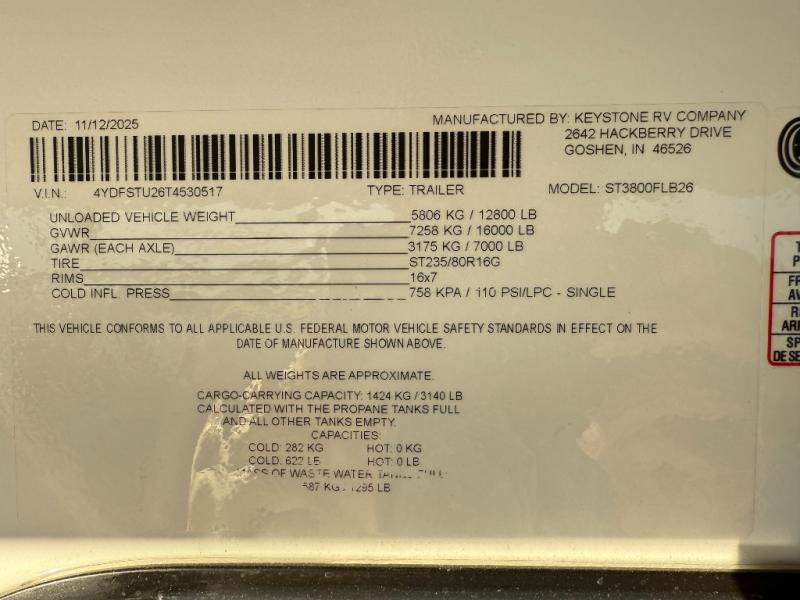 New 2026 Keystone RV Sprinter 3800FLB Fifth Wheel