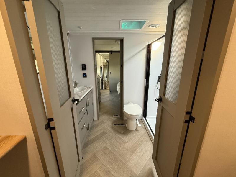 There is much to love about this fifth wheel! Starting with the front full bathroom which has a dual sink vanity for two to get ready at once and heading to the rear kitchen where you will have everything you need to prepare the best home cooked meals. There are also three bar stools at the bar top so guests can socialize with the cook. If you need to get a little work done while you're away, then you can easily get it done at the desk with chair next to the reclining theater seating and the 16 cu. ft. refrigerator for quick access to a snack break. The private bedroom has a king bed slide to lay your head on at night, and if you need an extra sleeping space then you can utilize the sofa slide too. Inside the half bathroom is a countertop with an area prepped for a washer and dryer to be added so you can enjoy clean clothes throughout your entire trip!