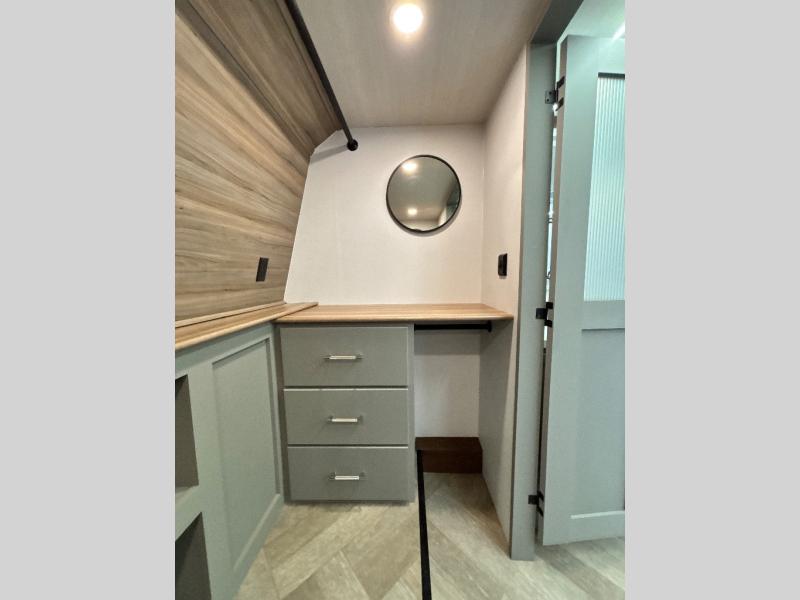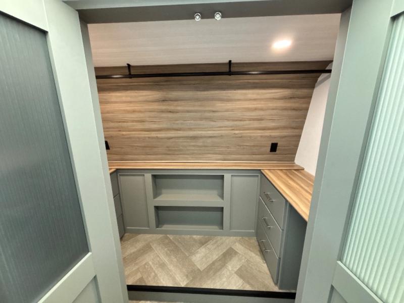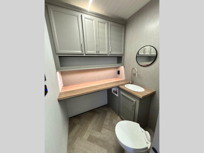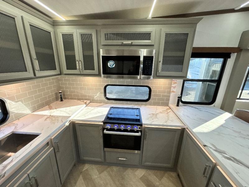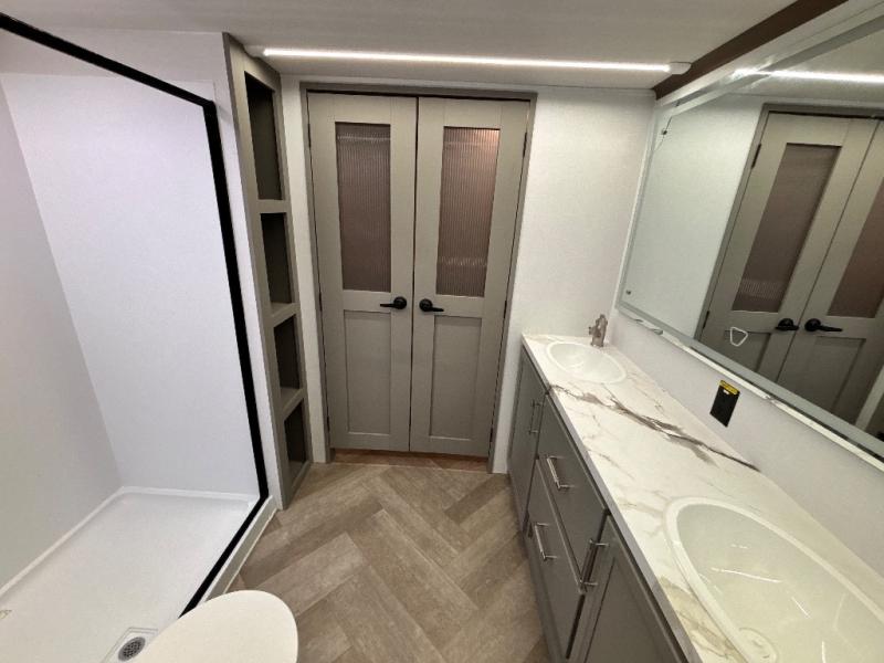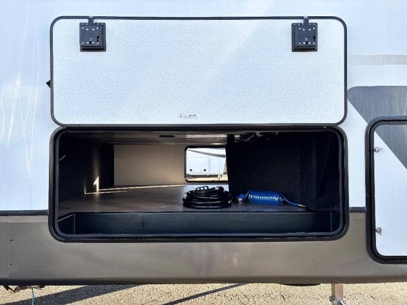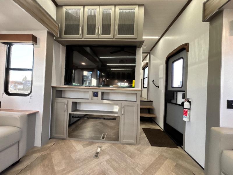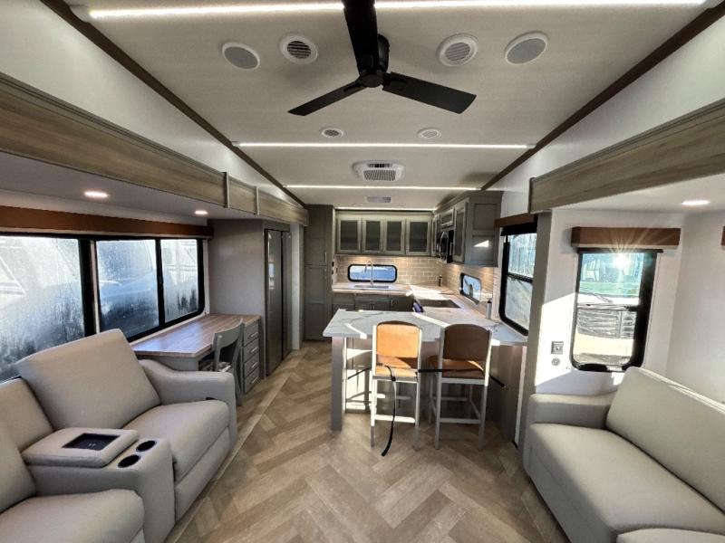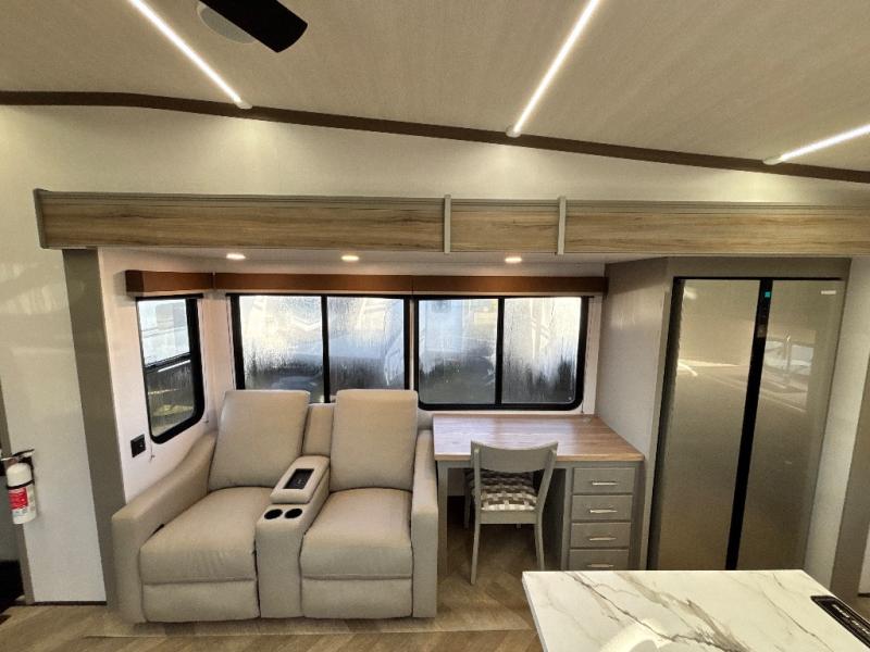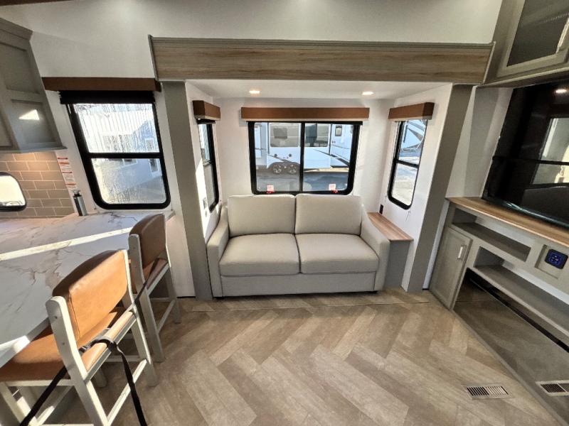 There is much to love about this fifth wheel! Starting with the front full bathroom which has a dual sink vanity for two to get ready at once and heading to the rear kitchen where you will have everything you need to prepare the best home cooked meals. There are also three bar stools at the bar top so guests can socialize with the cook. If you need to get a little work done while you're away, then you can easily get it done at the desk with chair next to the reclining theater seating and the 16 cu. ft. refrigerator for quick access to a snack break. The private bedroom has a king bed slide to lay your head on at night, and if you need an extra sleeping space then you can utilize the sofa slide too. Inside the half bathroom is a countertop with an area prepped for a washer and dryer to be added so you can enjoy clean clothes throughout your entire trip!