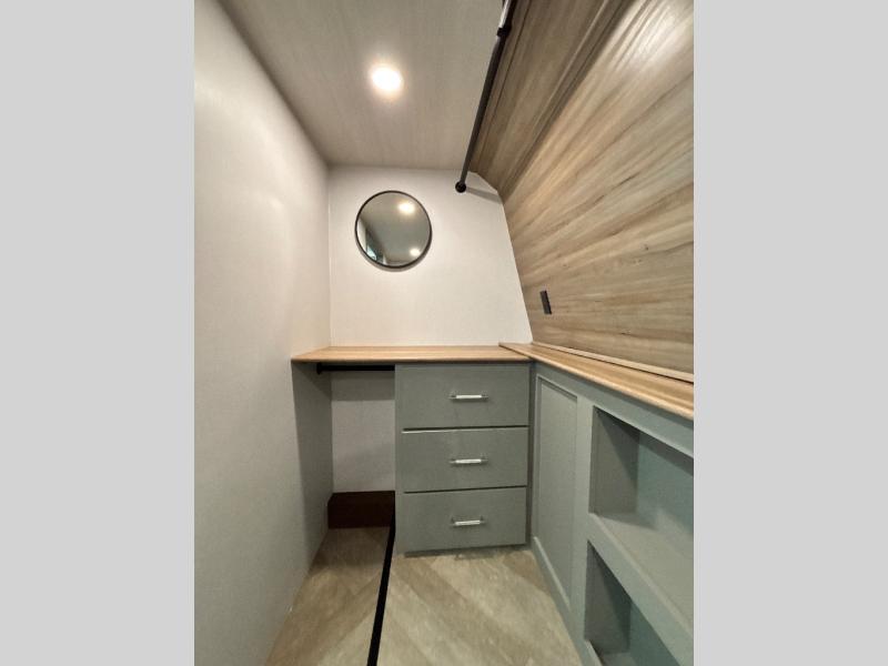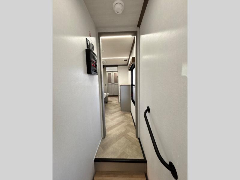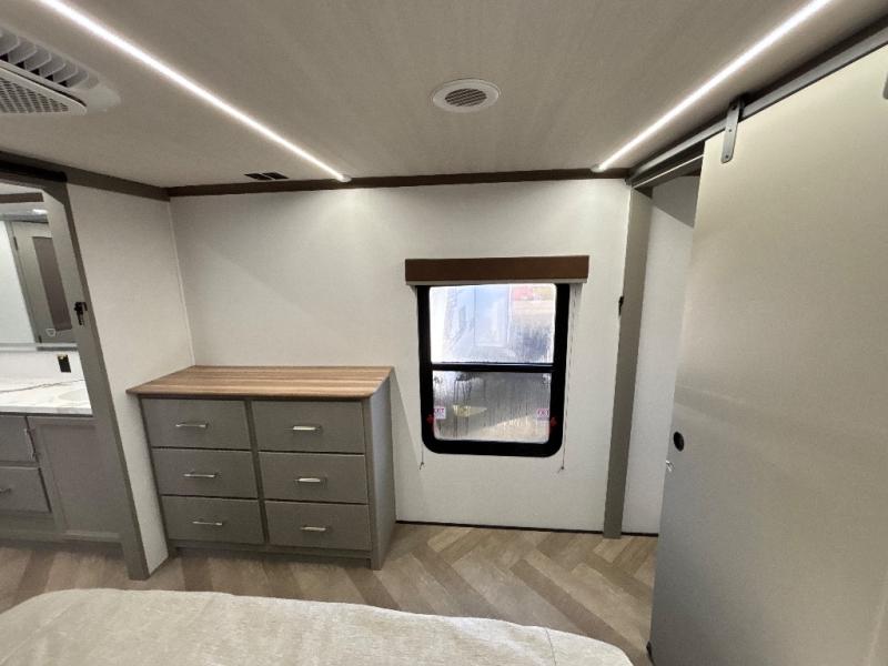 The Sprinter fifth wheels by Keystone feature spacious living areas, plenty of storage, and outstanding towability. Each unit is constructed with 2" aluminum framed and laminated sidewalls, a fully walkable roof, and dual layer insulation to help extend your camping season. The heated pass-through storage includes lockable slam latch baggage doors so you can easily pack your gear, and the one-touch 4-point leveling system features return hookup memory to have you set up in no-time. Head inside to find Congoleum vinyl flooring, Thomas Payne luxury collection furniture, residential style seamless marbled countertops, and an upgraded bedspread to name a few comforts. The Sprinter also includes a Girard tankless on-demand water heater, a central command center, plus a 30k BTU furnace and two A/C units to ensure your comfort!