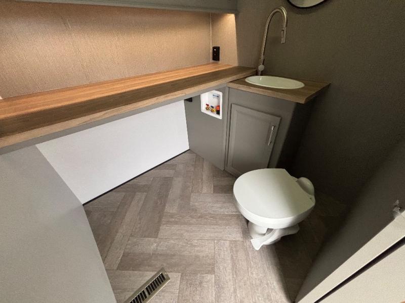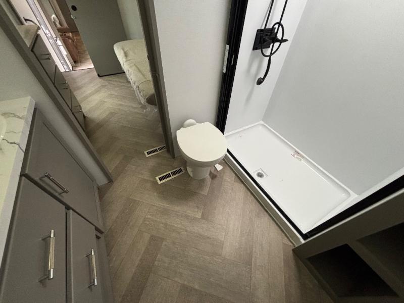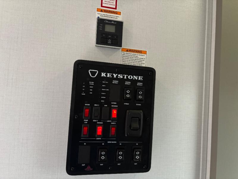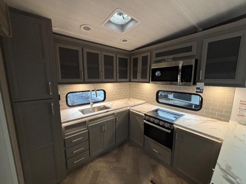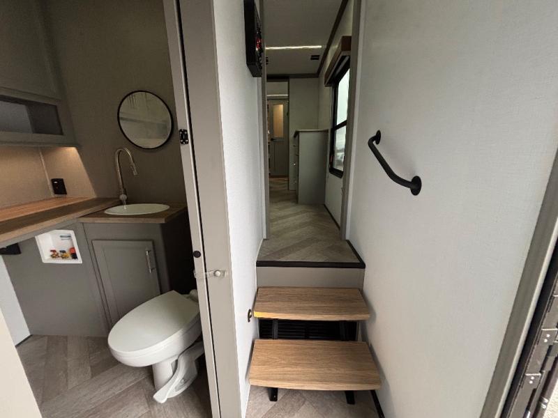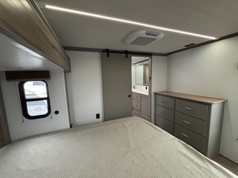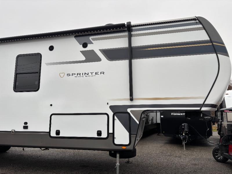 The Sprinter fifth wheels by Keystone feature spacious living areas, plenty of storage, and outstanding towability. Each unit is constructed with 2" aluminum framed and laminated sidewalls, a fully walkable roof, and dual layer insulation to help extend your camping season. The heated pass-through storage includes lockable slam latch baggage doors so you can easily pack your gear, and the one-touch 4-point leveling system features return hookup memory to have you set up in no-time. Head inside to find Congoleum vinyl flooring, Thomas Payne luxury collection furniture, residential style seamless marbled countertops, and an upgraded bedspread to name a few comforts. The Sprinter also includes a Girard tankless on-demand water heater, a central command center, plus a 30k BTU furnace and two A/C units to ensure your comfort!