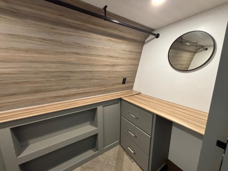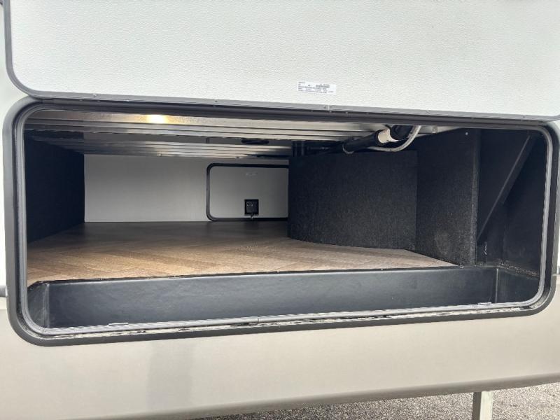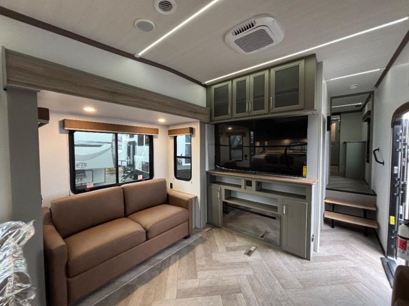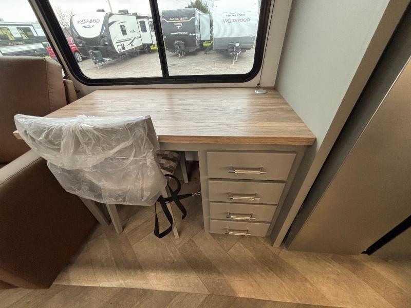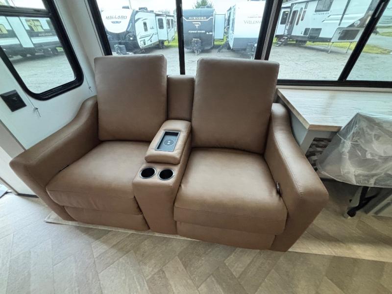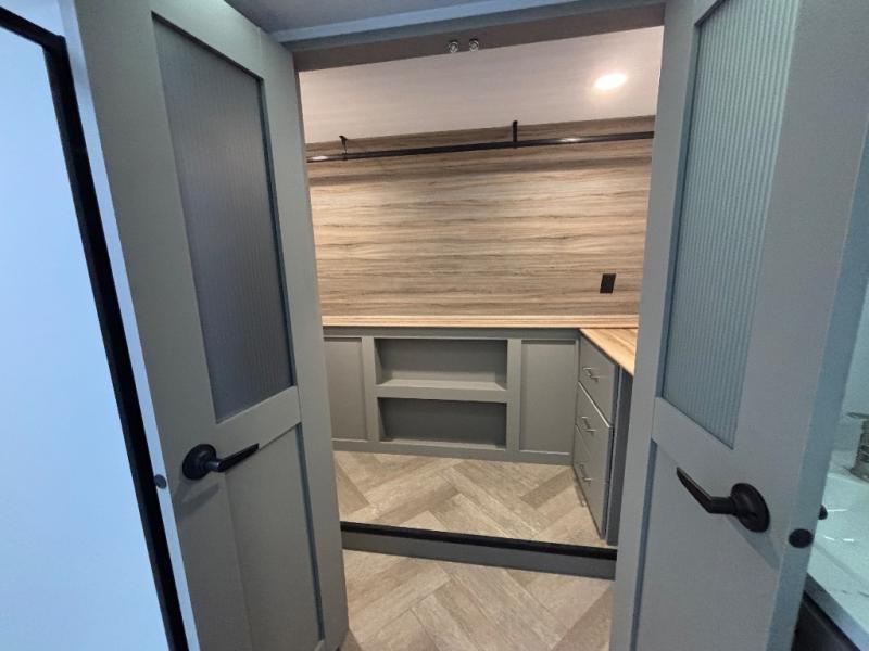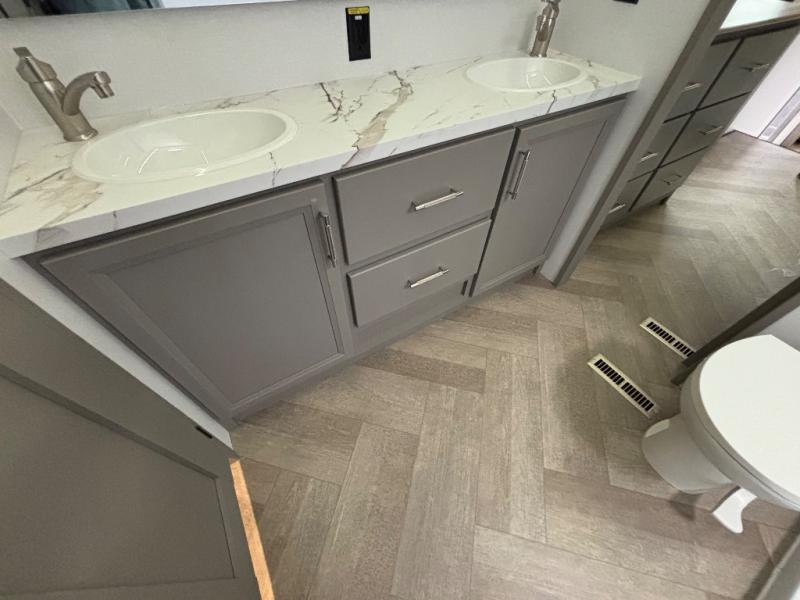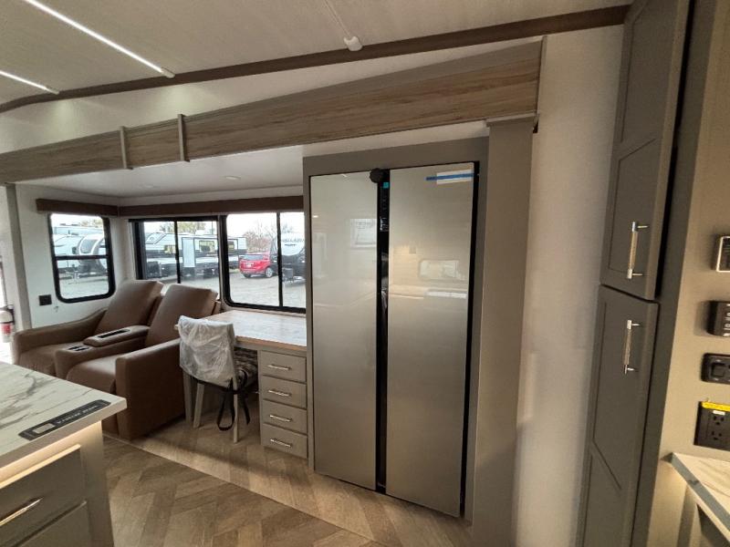 There is much to love about this fifth wheel! Starting with the front full bathroom which has a dual sink vanity for two to get ready at once and heading to the rear kitchen where you will have everything you need to prepare the best home cooked meals. There are also three bar stools at the bar top so guests can socialize with the cook. If you need to get a little work done while you're away, then you can easily get it done at the desk with chair next to the reclining theater seating and the 16 cu. ft. refrigerator for quick access to a snack break. The private bedroom has a king bed slide to lay your head on at night, and if you need an extra sleeping space then you can utilize the sofa slide too. Inside the half bathroom is a countertop with an area prepped for a washer and dryer to be added so you can enjoy clean clothes throughout your entire trip!