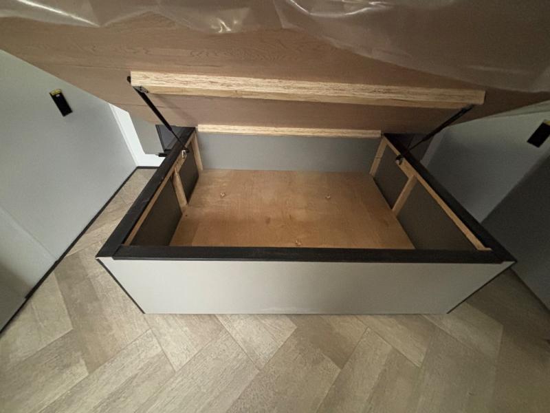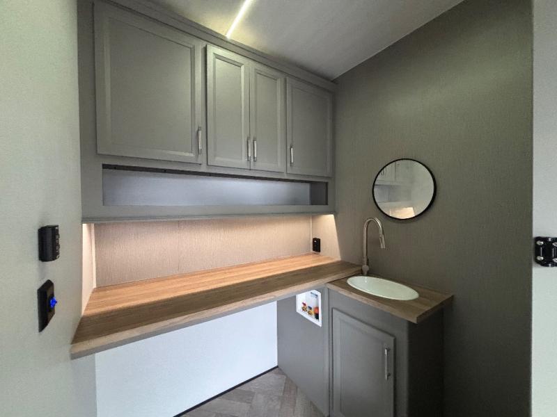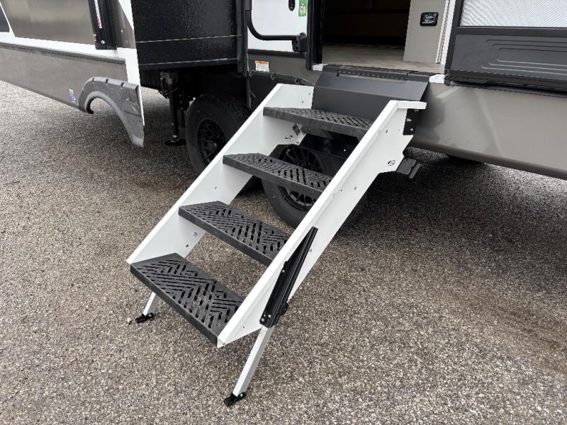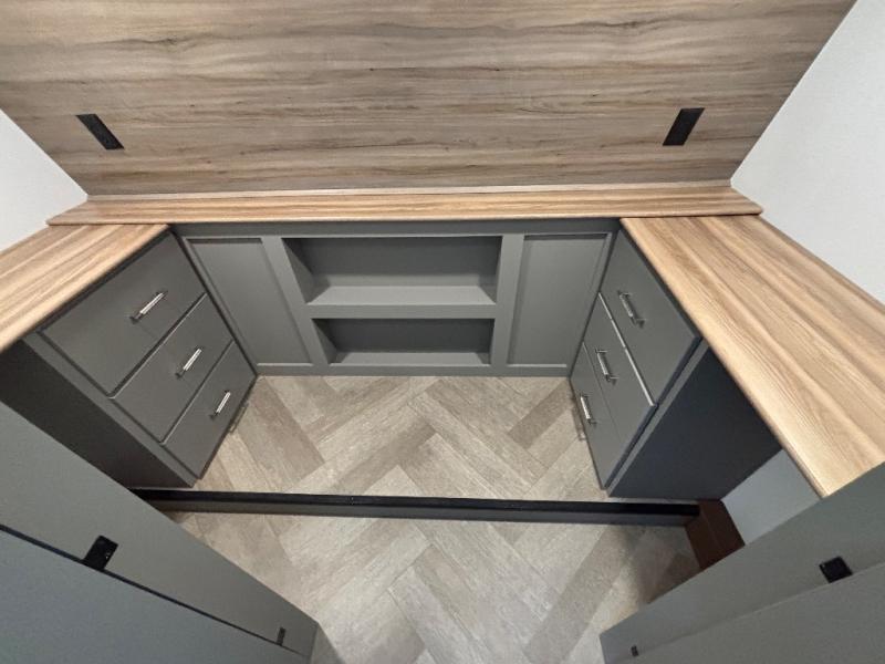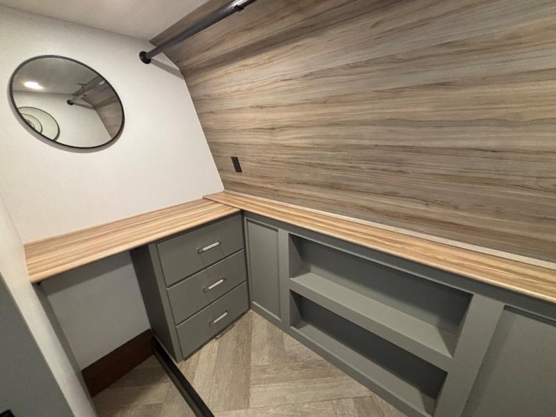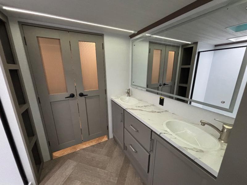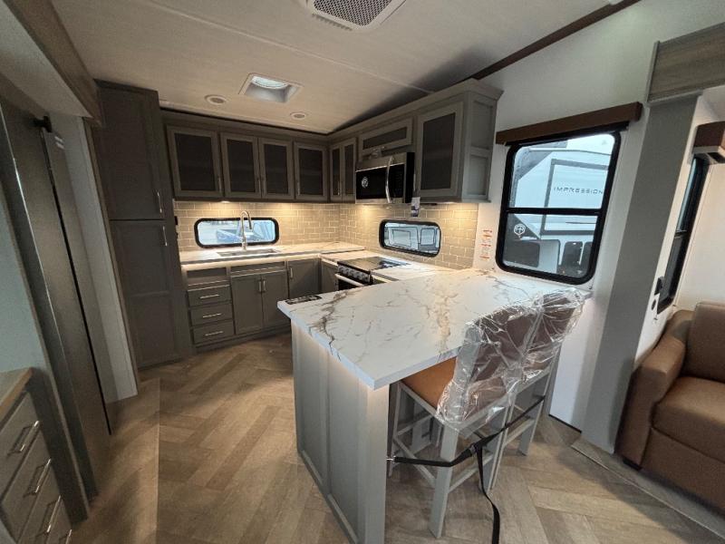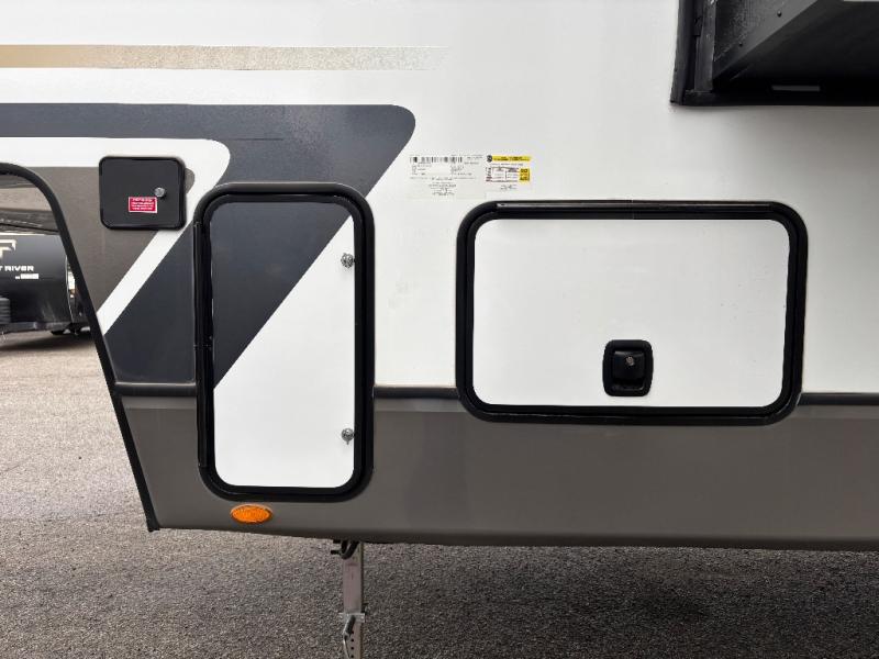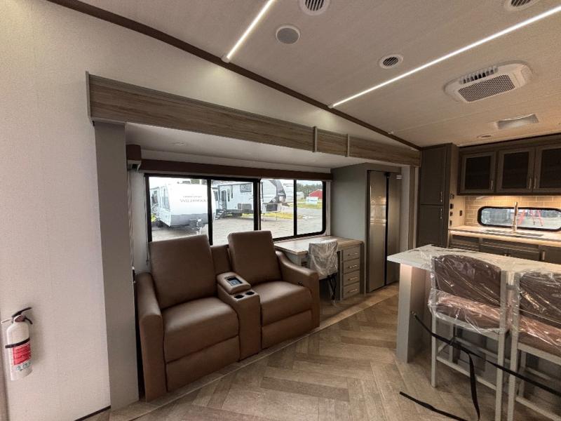 There is much to love about this fifth wheel! Starting with the front full bathroom which has a dual sink vanity for two to get ready at once and heading to the rear kitchen where you will have everything you need to prepare the best home cooked meals. There are also three bar stools at the bar top so guests can socialize with the cook. If you need to get a little work done while you're away, then you can easily get it done at the desk with chair next to the reclining theater seating and the 16 cu. ft. refrigerator for quick access to a snack break. The private bedroom has a king bed slide to lay your head on at night, and if you need an extra sleeping space then you can utilize the sofa slide too. Inside the half bathroom is a countertop with an area prepped for a washer and dryer to be added so you can enjoy clean clothes throughout your entire trip!