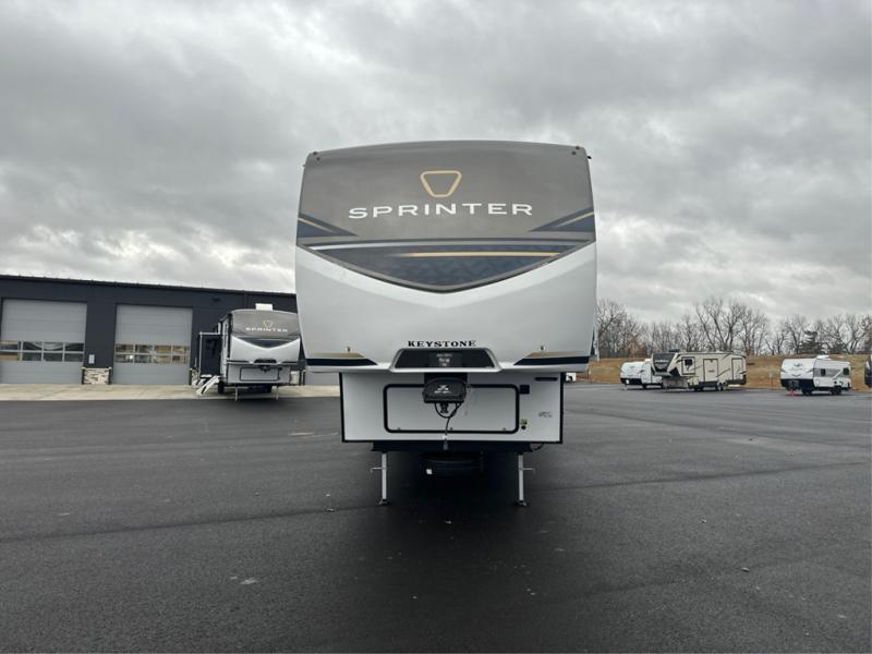 The Sprinter fifth wheels by Keystone feature spacious living areas, plenty of storage, and outstanding towability. Each unit is constructed with 2" aluminum framed and laminated sidewalls, a fully walkable roof, and dual layer insulation to help extend your camping season. The heated pass-through storage includes lockable slam latch baggage doors so you can easily pack your gear, and the one-touch 4-point leveling system features return hookup memory to have you set up in no-time. Head inside to find Congoleum vinyl flooring, Thomas Payne luxury collection furniture, residential style seamless marbled countertops, and an upgraded bedspread to name a few comforts. The Sprinter also includes a Girard tankless on-demand water heater, a central command center, plus a 30k BTU furnace and two A/C units to ensure your comfort!