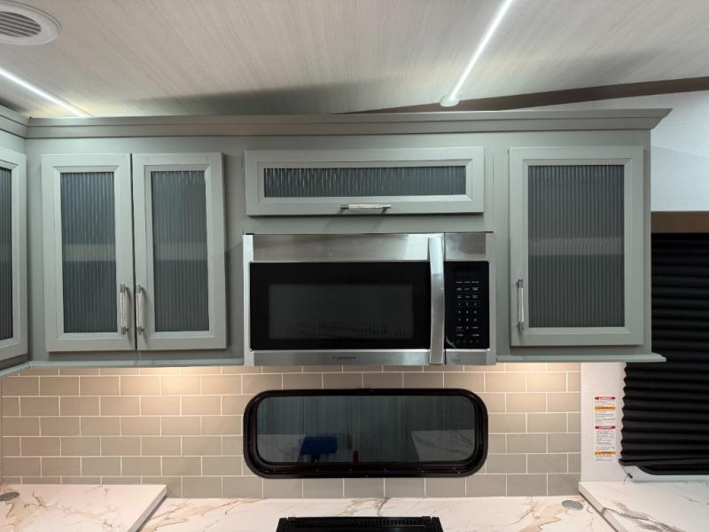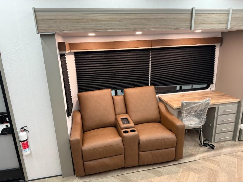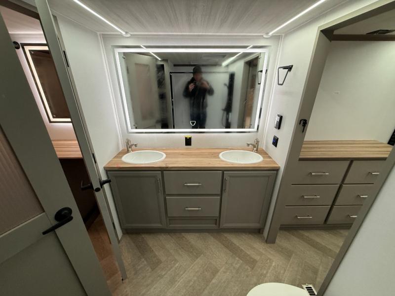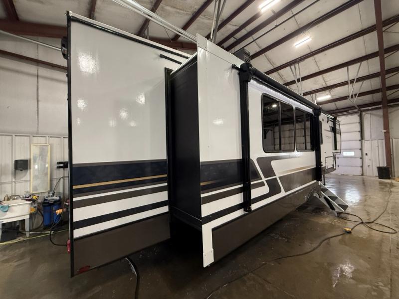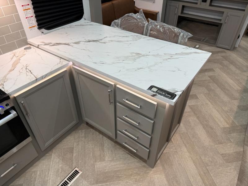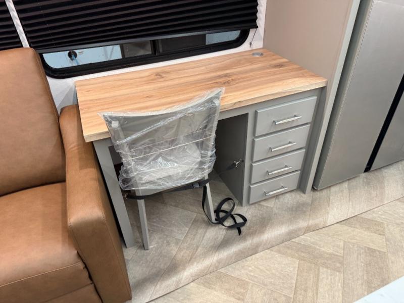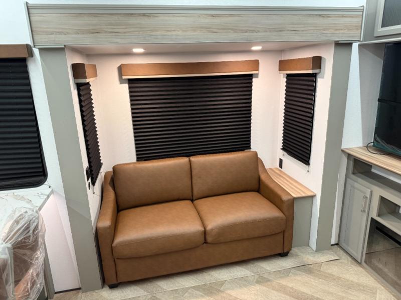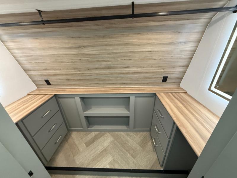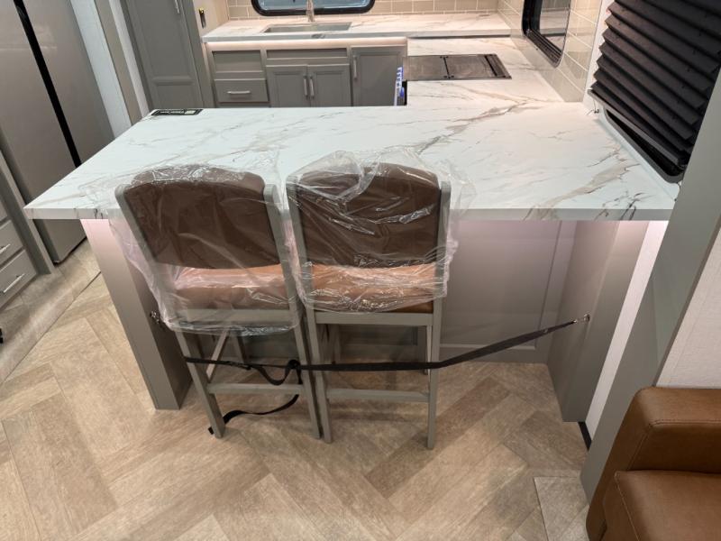 There is much to love about this fifth wheel! Starting with the front full bathroom which has a dual sink vanity for two to get ready at once and heading to the rear kitchen where you will have everything you need to prepare the best home cooked meals. There are also two bar stools at the bar top so guests can socialize with the cook. If you need to get a little work done while you're away, then you can easily get it done at the desk with chair next to the reclining theater seating and the 16 cu. ft. refrigerator for quick access to a snack break. The private bedroom has a king bed slide to lay your head on at night, and if you need an extra sleeping space then you can utilize the sofa slide too. Inside the half bathroom is a countertop with an area prepped for a washer and dryer to be added so you can enjoy clean clothes throughout your entire trip!