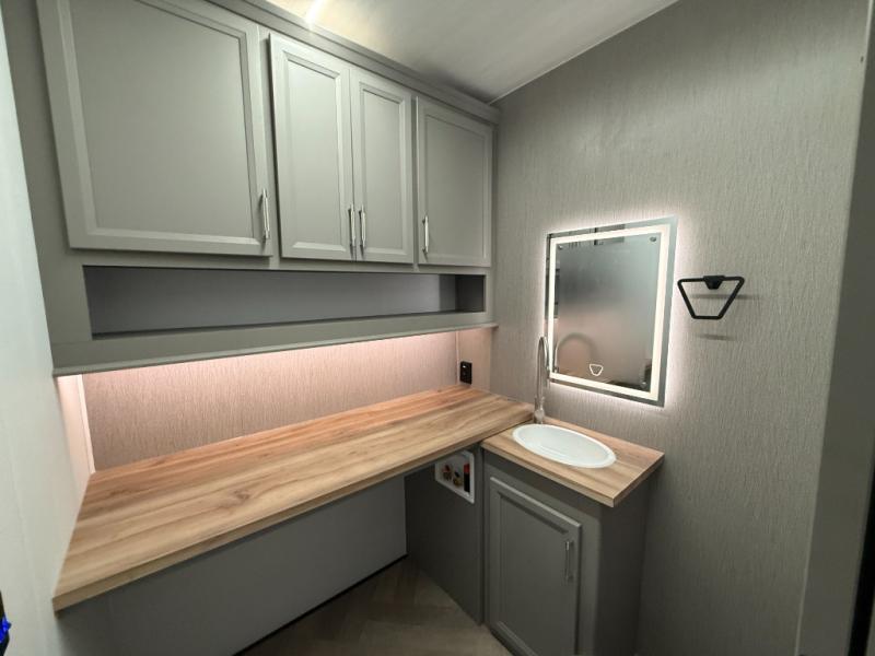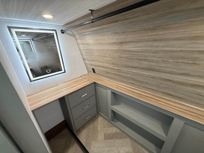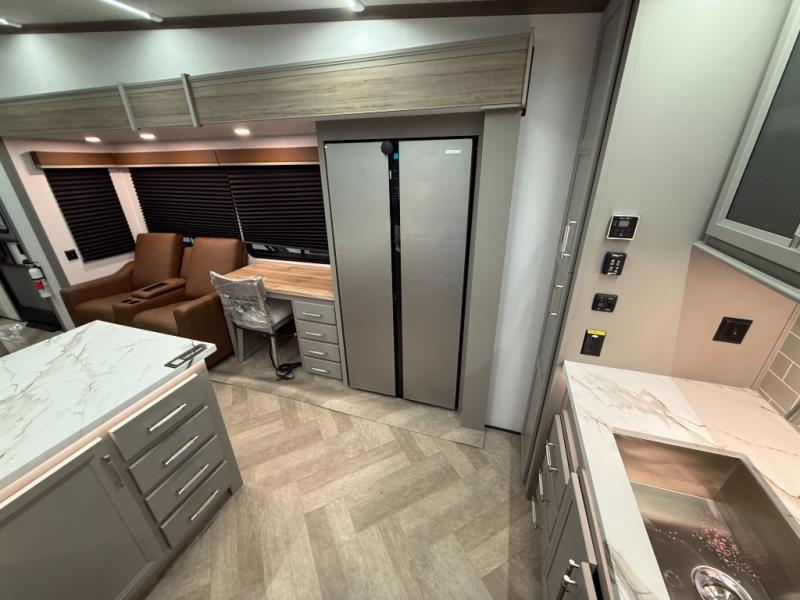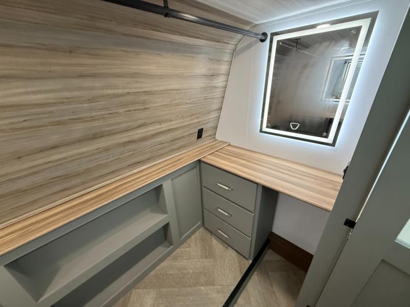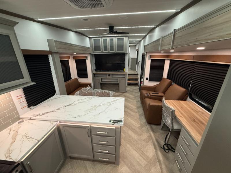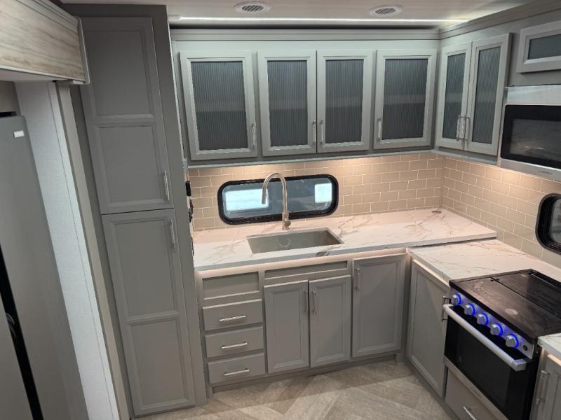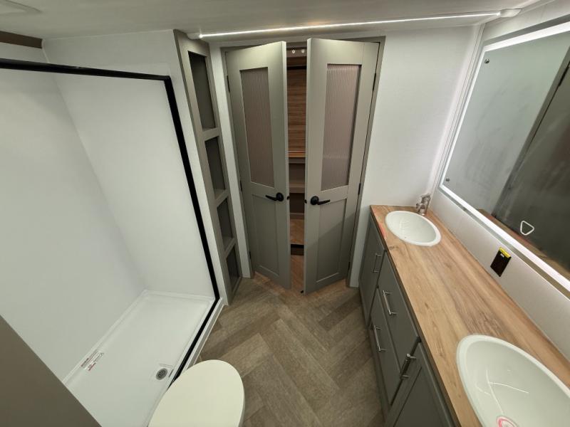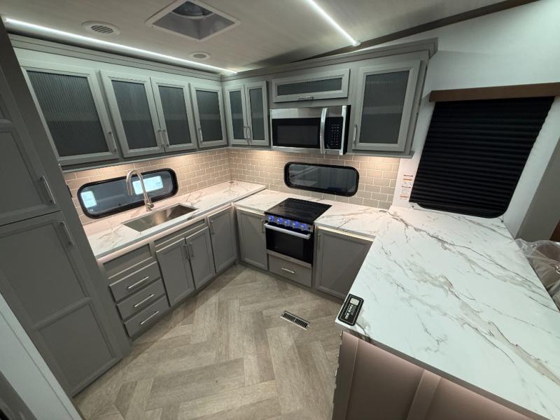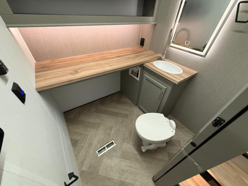 There is much to love about this fifth wheel! Starting with the front full bathroom which has a dual sink vanity for two to get ready at once and heading to the rear kitchen where you will have everything you need to prepare the best home cooked meals. There are also two bar stools at the bar top so guests can socialize with the cook. If you need to get a little work done while you're away, then you can easily get it done at the desk with chair next to the reclining theater seating and the 16 cu. ft. refrigerator for quick access to a snack break. The private bedroom has a king bed slide to lay your head on at night, and if you need an extra sleeping space then you can utilize the sofa slide too. Inside the half bathroom is a countertop with an area prepped for a washer and dryer to be added so you can enjoy clean clothes throughout your entire trip!