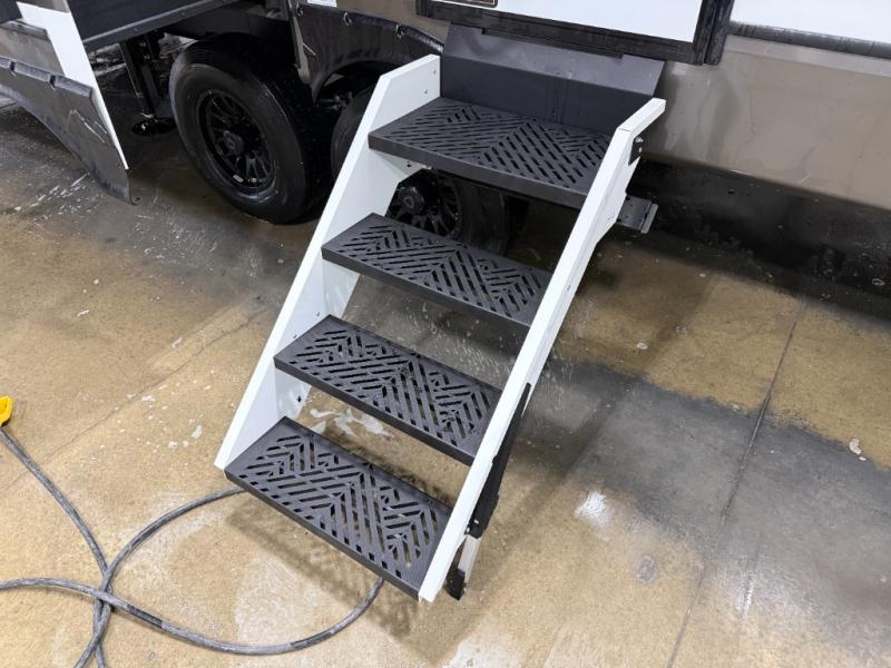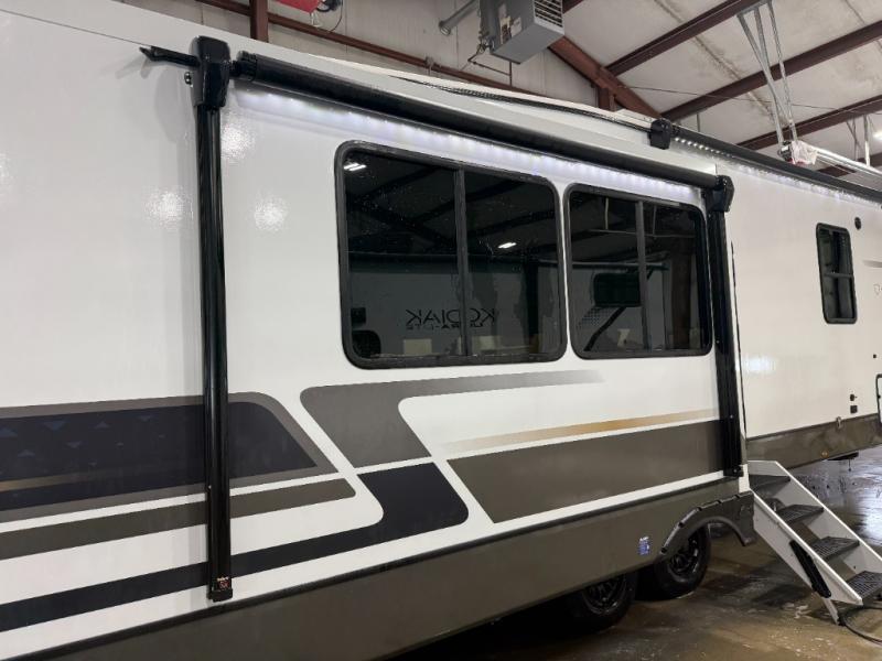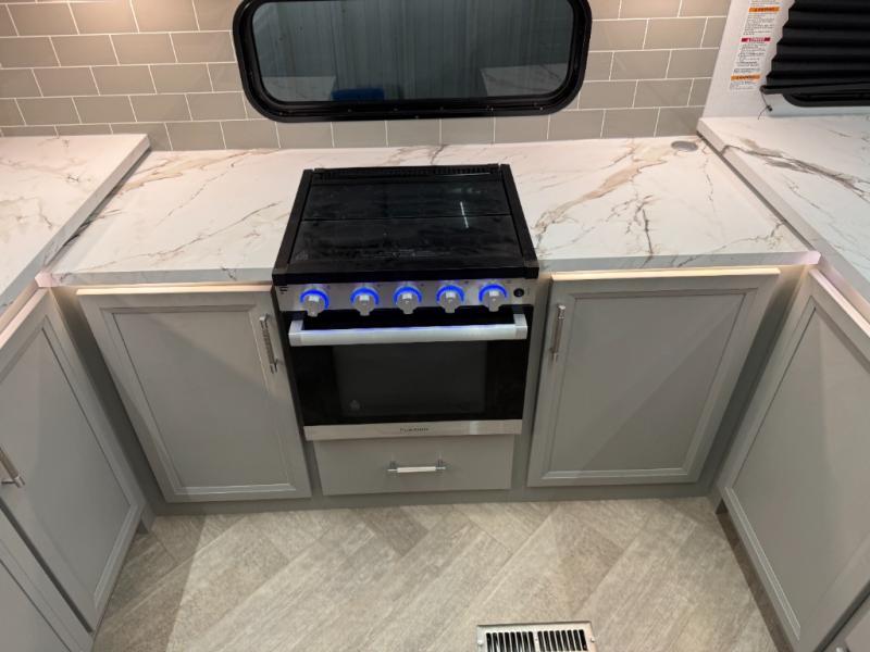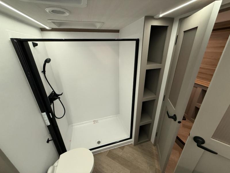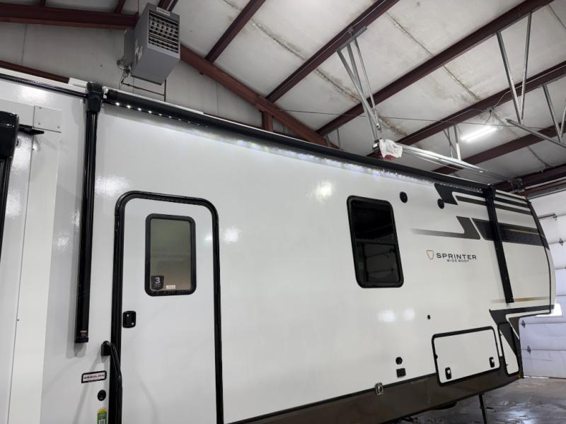 The Sprinter fifth wheels by Keystone feature spacious living areas, plenty of storage, and outstanding towability. Each unit is constructed with 2" thick double welded aluminum frame construction, a fully walkable roof and slide out roof, and dual layer insulation to help extend your camping season. The heated pass-through storage includes lockable slam latch baggage doors so you can easily pack your gear, and the one-touch 4-point leveling system features return hookup memory to have you set up in no-time. Head inside to find DynaSpan Marine Grade floor decking, Thomas Payne luxury collection furniture and residential style seamless marbled countertops to name a few comforts. The Sprinter also includes a Suburban tankless on-demand water heater, black out aluminum wheels, plus a 30k BTU furnace to ensure your comfort!