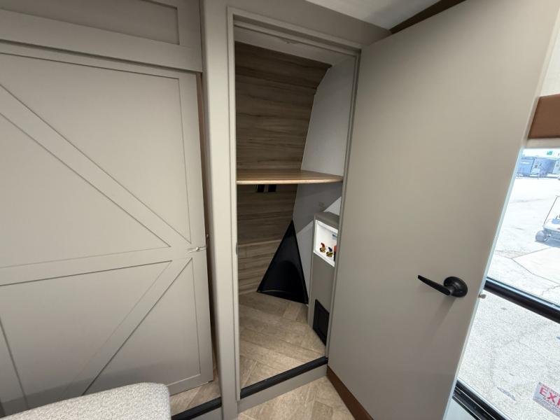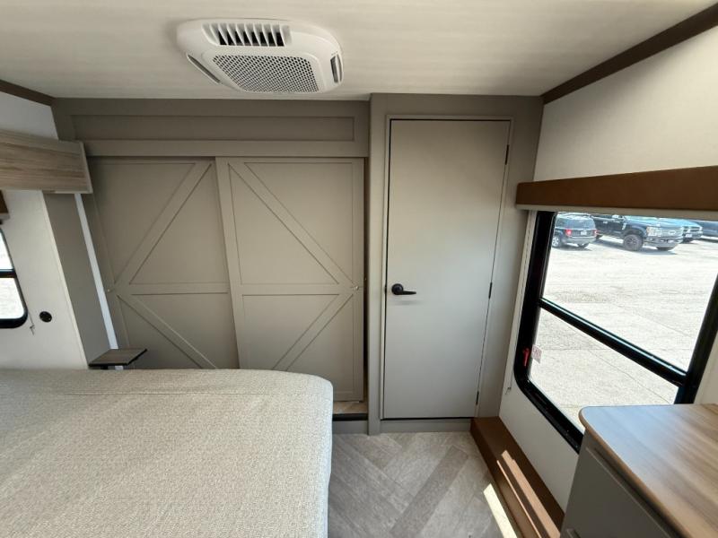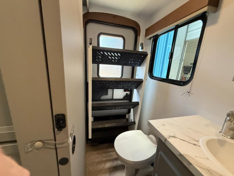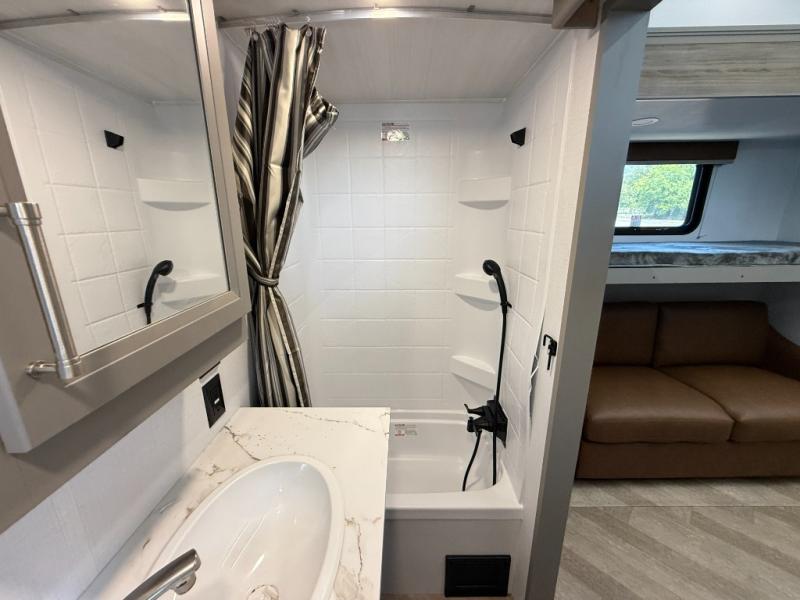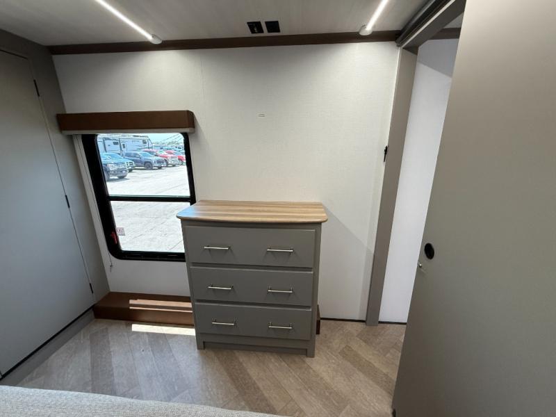 The Sprinter fifth wheels by Keystone feature spacious living areas, plenty of storage, and outstanding towability. Each unit is constructed with 2" aluminum framed and laminated sidewalls, a fully walkable roof, and dual layer insulation to help extend your camping season. The heated pass-through storage includes lockable slam latch baggage doors so you can easily pack your gear, and the one-touch 4-point leveling system features return hookup memory to have you set up in no-time. Head inside to find Congoleum vinyl flooring, Thomas Payne luxury collection furniture, residential style seamless marbled countertops, and an upgraded bedspread to name a few comforts. The Sprinter also includes a Girard tankless on-demand water heater, a central command center, plus a 30k BTU furnace and two A/C units to ensure your comfort!