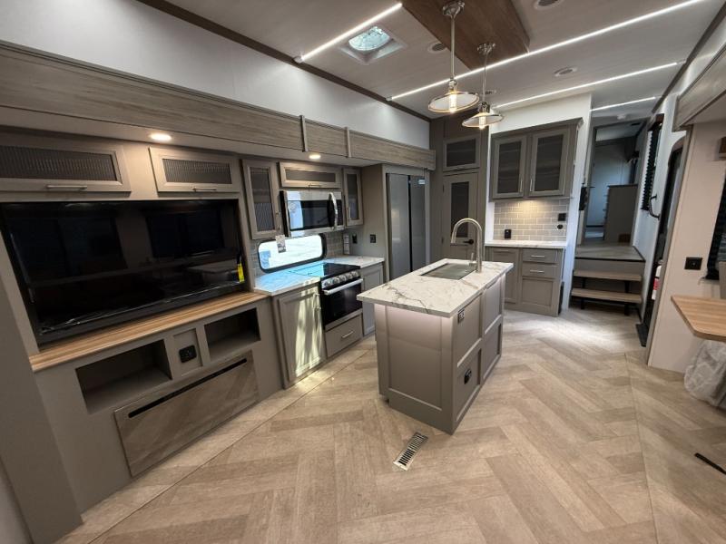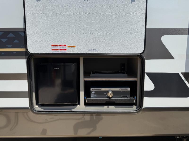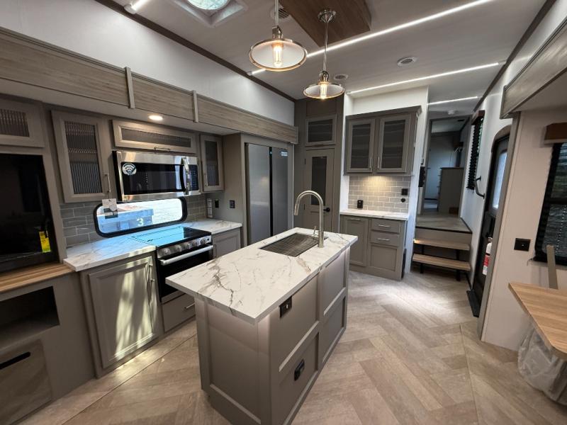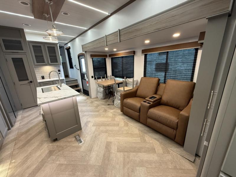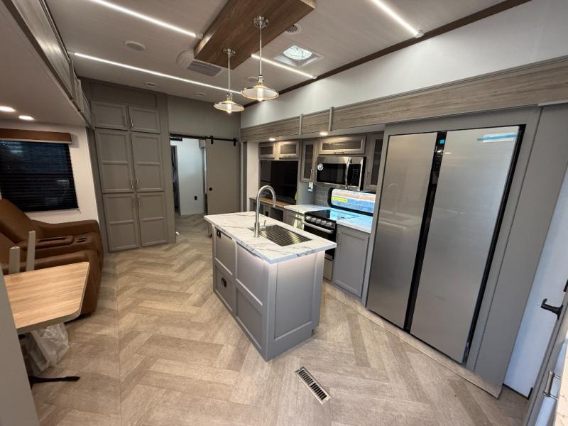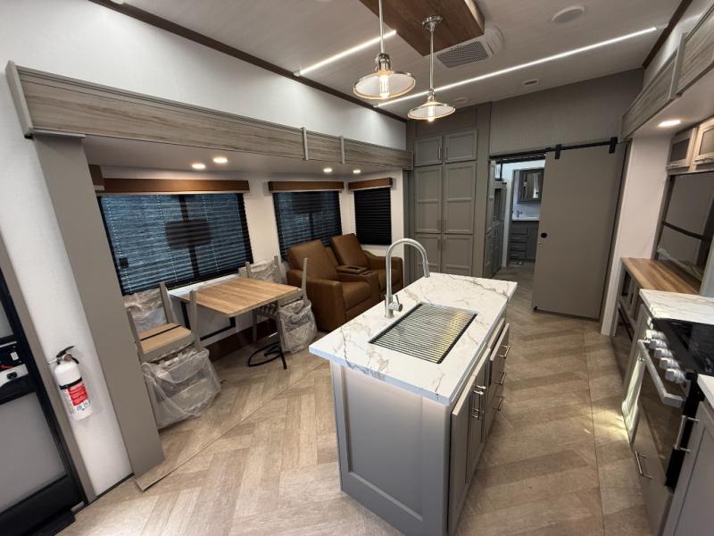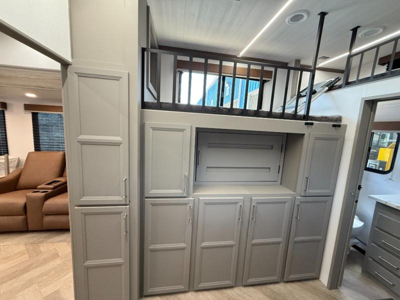 A great family bunkhouse fifth wheel featuring quad slides that really open this entire unit up to provide spacious living throughout. A booth dinette or optional free standing dinette is great for meals, and full reclining theater seating with massage, lights, and USB connectivity make movie night a real treat! The kids will love the rear bunkhouse with a separate bath and private entry for easy access when outside. There is even a loft area above for storage, so they can bring a few friends along as well. The kitchen has all of the features needed to allow you to cook and entertain when you want with a three burner range including a glass top, a 16 cu. ft. 12 volt refrigerator, pantry, hutch for dishes and things, plus a solid surface countertop on the center island that houses your sink. In the bedroom, a king bed slides out to offer more floor space to move about, plus you will find ample storage in the front wardrobe which has also been prepped for a washer and dryer if you choose to add. You can also add a TV in the bedroom since it has been prepped for one as well. And let's not forget the outside two burner cooktop and refrigerator!