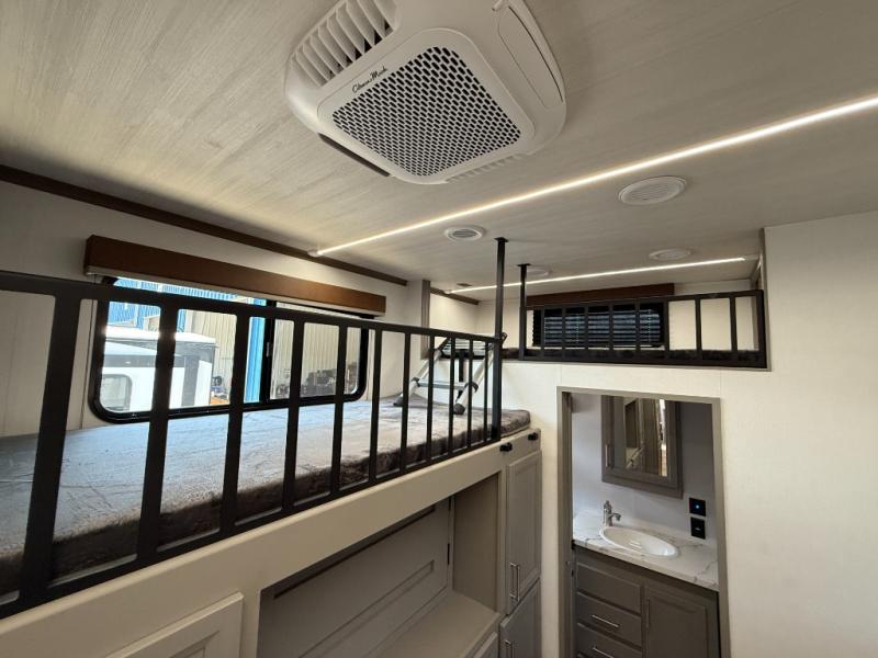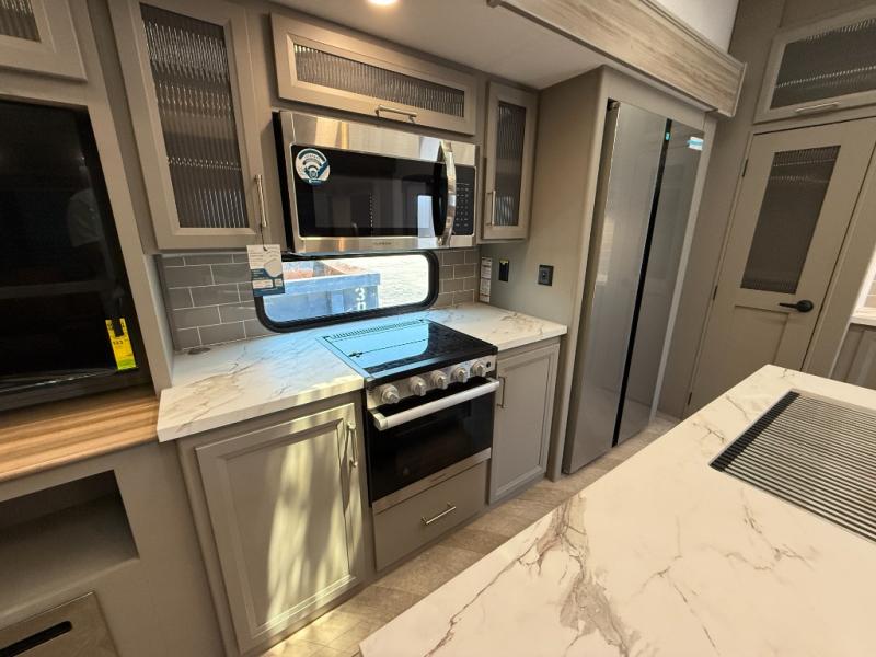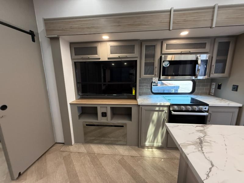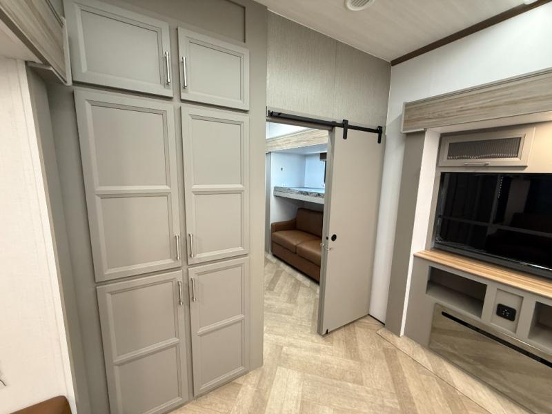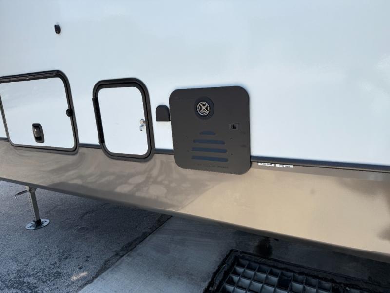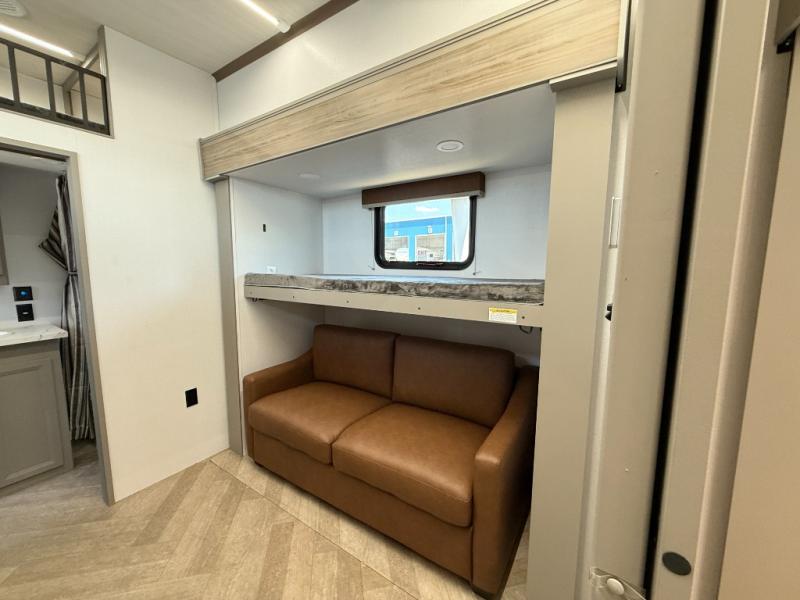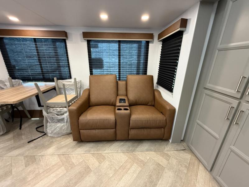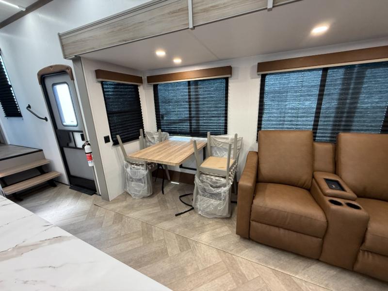A great family bunkhouse fifth wheel featuring quad slides that really open this entire unit up to provide spacious living throughout. A booth dinette or optional free standing dinette is great for meals, and full reclining theater seating with massage, lights, and USB connectivity make movie night a real treat! The kids will love the rear bunkhouse with a separate bath and private entry for easy access when outside. There is even a loft area above for storage, so they can bring a few friends along as well. The kitchen has all of the features needed to allow you to cook and entertain when you want with a three burner range including a glass top, a 16 cu. ft. 12 volt refrigerator, pantry, hutch for dishes and things, plus a solid surface countertop on the center island that houses your sink. In the bedroom, a king bed slides out to offer more floor space to move about, plus you will find ample storage in the front wardrobe which has also been prepped for a washer and dryer if you choose to add. You can also add a TV in the bedroom since it has been prepped for one as well. And let's not forget the outside two burner cooktop and refrigerator!
