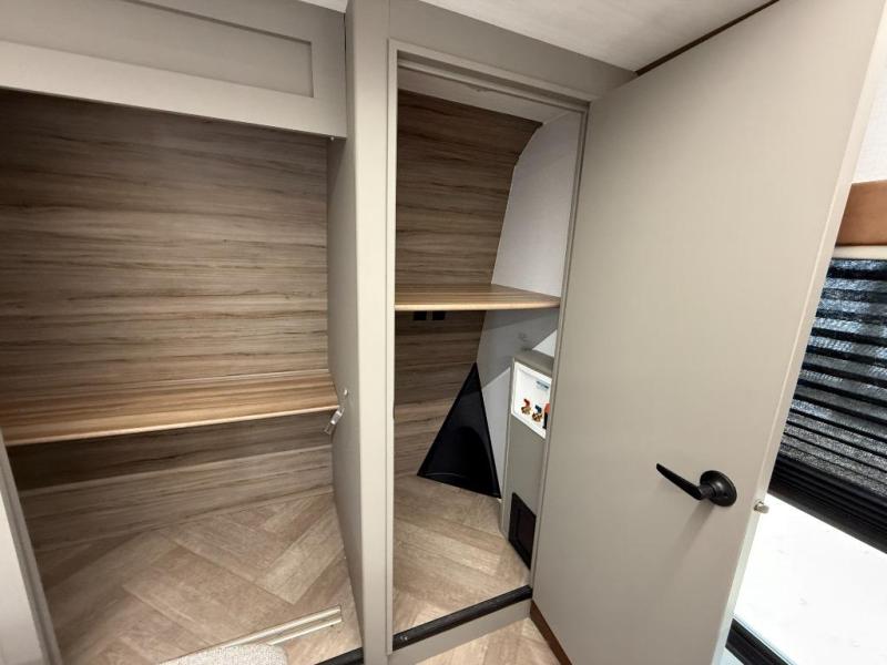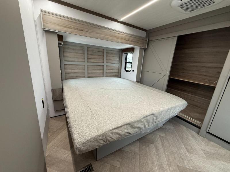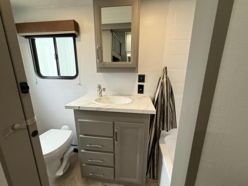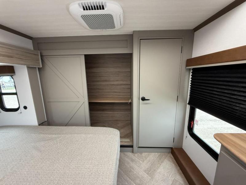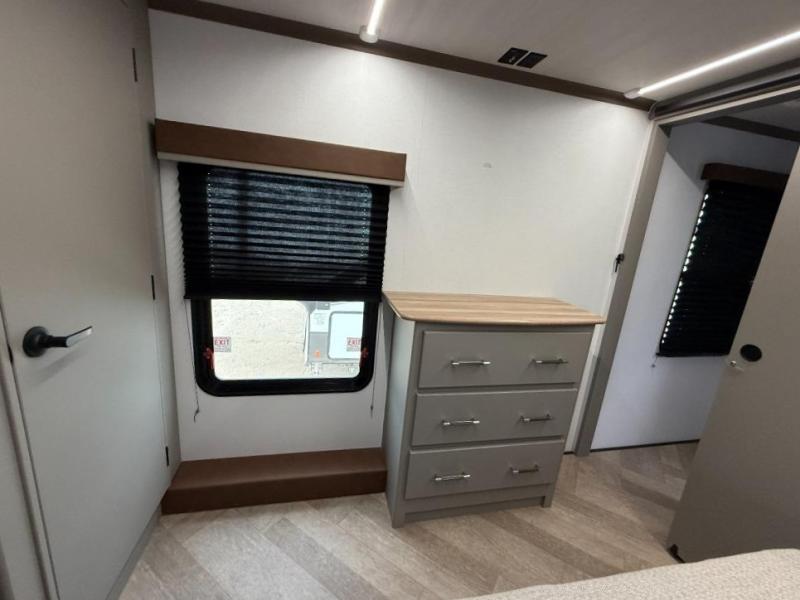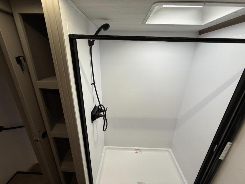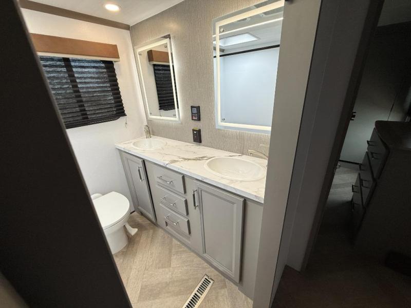 The Sprinter fifth wheels by Keystone feature spacious living areas, plenty of storage, and outstanding towability. Each unit is constructed with 2" aluminum framed and laminated sidewalls, a fully walkable roof, and dual layer insulation to help extend your camping season. The heated pass-through storage includes lockable slam latch baggage doors so you can easily pack your gear, and the one-touch 4-point leveling system features return hookup memory to have you set up in no-time. Head inside to find Congoleum vinyl flooring, Thomas Payne luxury collection furniture, residential style seamless marbled countertops, and an upgraded bedspread to name a few comforts. The Sprinter also includes a Girard tankless on-demand water heater, a central command center, plus a 30k BTU furnace and two A/C units to ensure your comfort!
