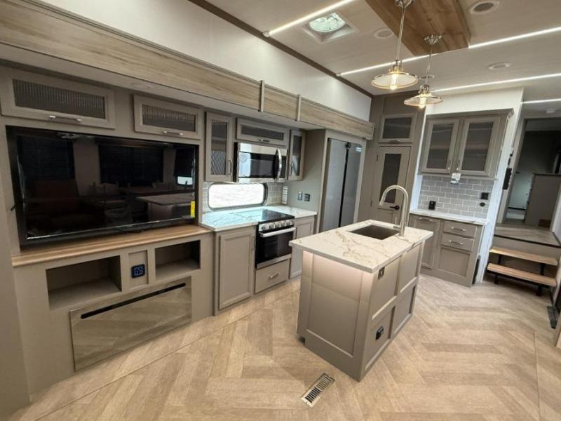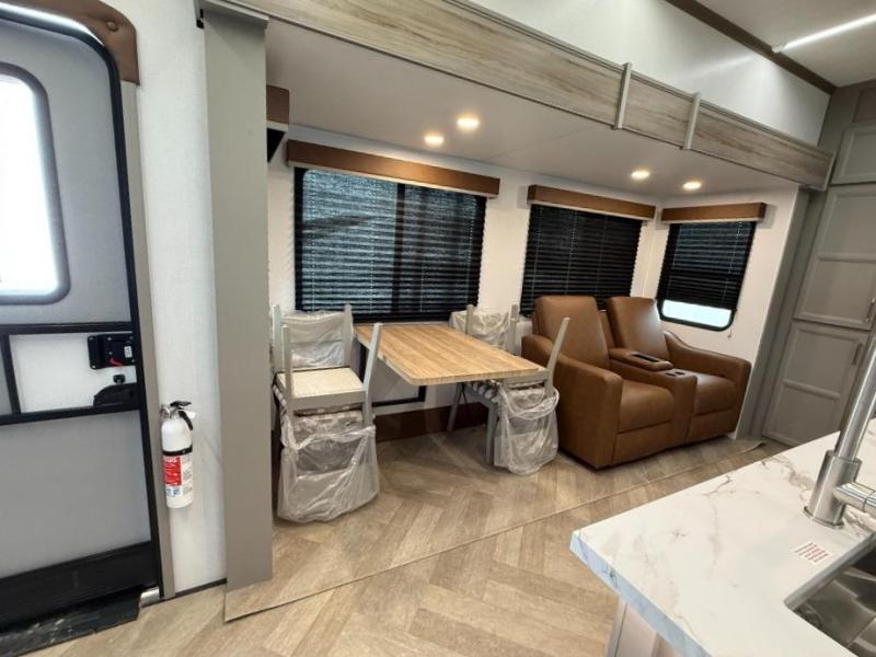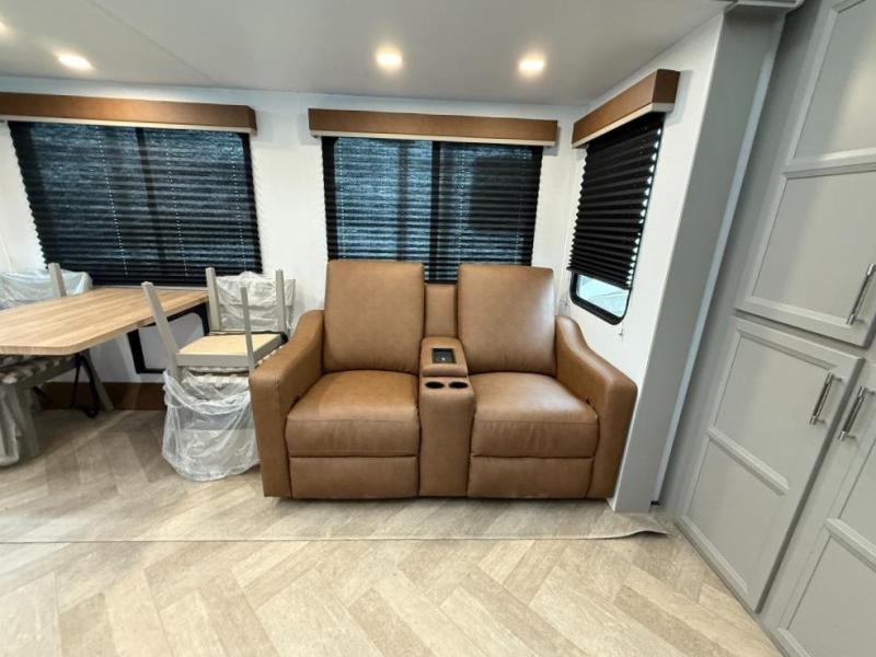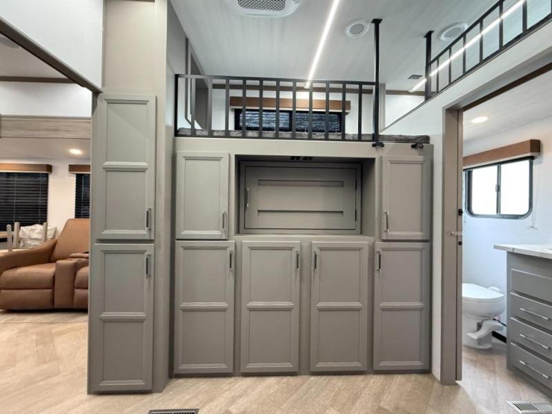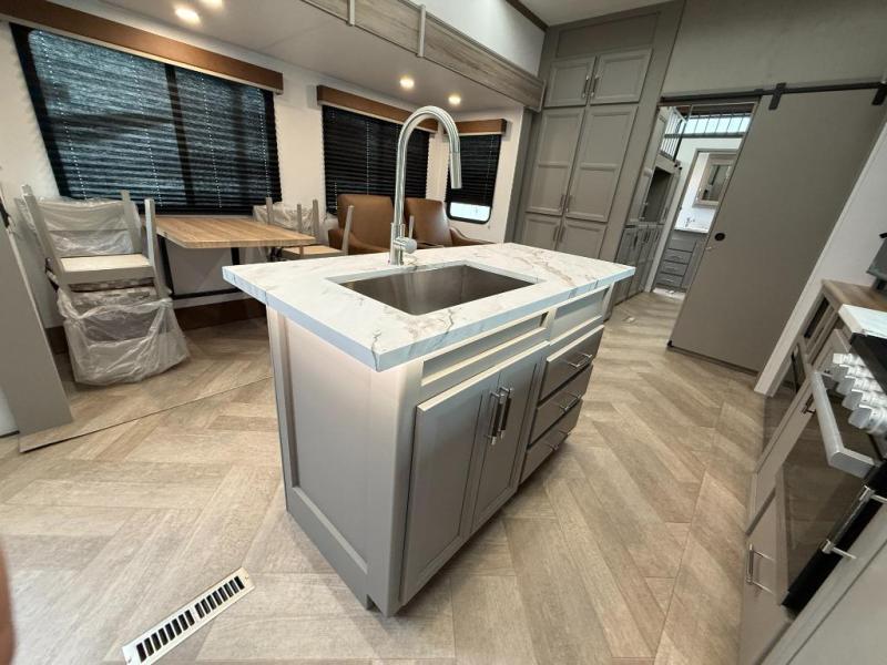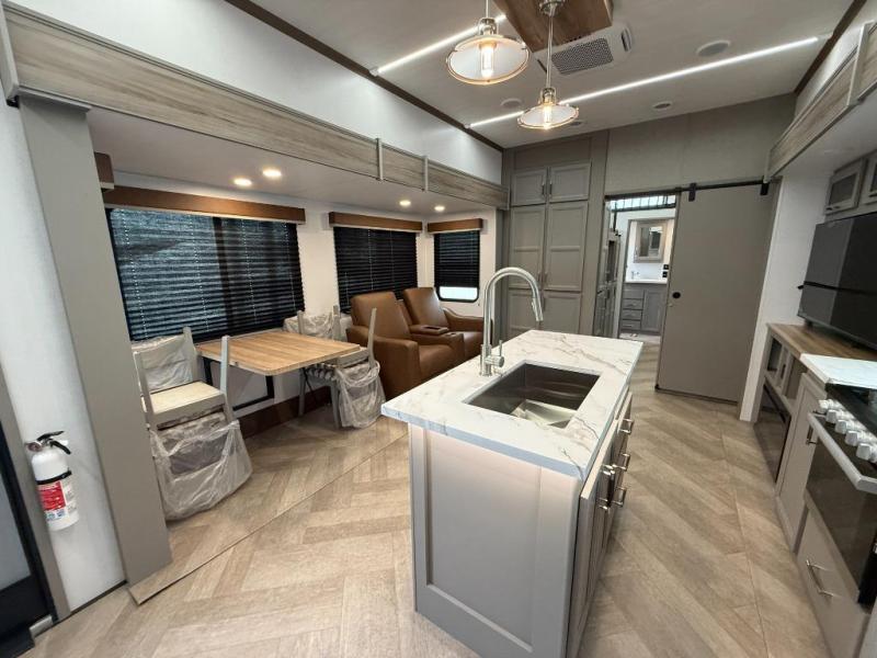 A great family bunkhouse fifth wheel featuring quad slides that really open this entire unit up to provide spacious living throughout. A booth dinette or optional free standing dinette is great for meals, and full reclining theater seating with massage, lights, and USB connectivity make movie night a real treat! The kids will love the rear bunkhouse with a separate bath and private entry for easy access when outside. There is even a loft area above for storage, so they can bring a few friends along as well. The kitchen has all of the features needed to allow you to cook and entertain when you want with a three burner range including a glass top, a 16 cu. ft. 12 volt refrigerator, pantry, hutch for dishes and things, plus a solid surface countertop on the center island that houses your sink. In the bedroom, a king bed slides out to offer more floor space to move about, plus you will find ample storage in the front wardrobe which has also been prepped for a washer and dryer if you choose to add. You can also add a TV in the bedroom since it has been prepped for one as well. And let's not forget the outside two burner cooktop and refrigerator!