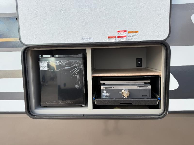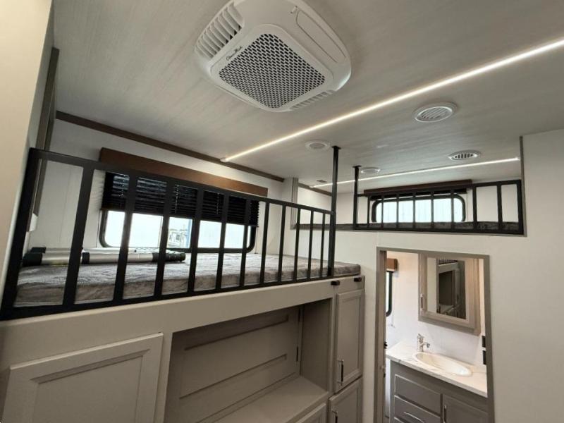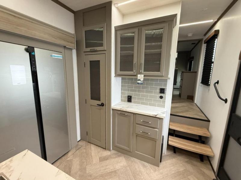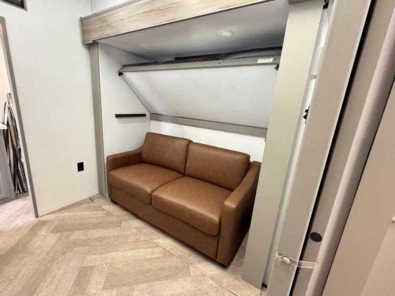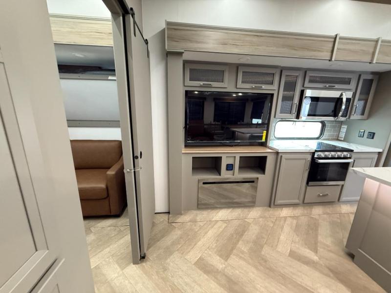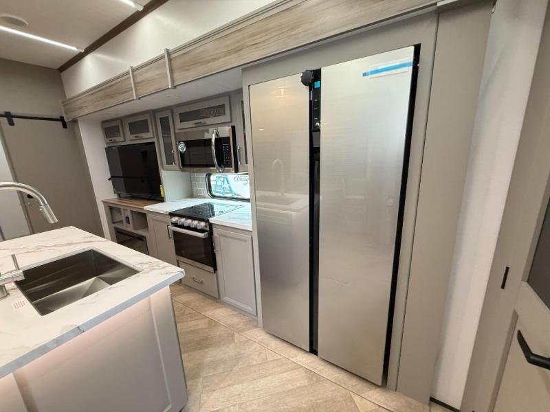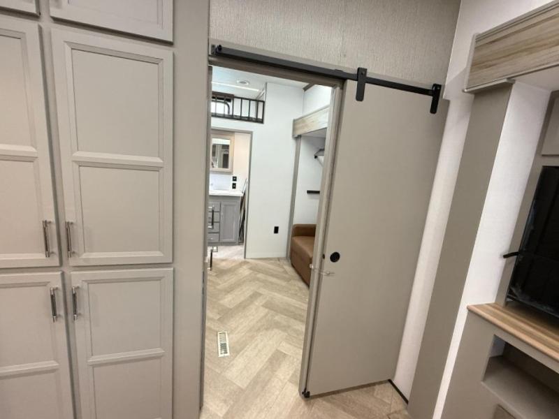 A great family bunkhouse fifth wheel featuring quad slides that really open this entire unit up to provide spacious living throughout. A booth dinette or optional free standing dinette is great for meals, and full reclining theater seating with massage, lights, and USB connectivity make movie night a real treat! The kids will love the rear bunkhouse with a separate bath and private entry for easy access when outside. There is even a loft area above for storage, so they can bring a few friends along as well. The kitchen has all of the features needed to allow you to cook and entertain when you want with a three burner range including a glass top, a 16 cu. ft. 12 volt refrigerator, pantry, hutch for dishes and things, plus a solid surface countertop on the center island that houses your sink. In the bedroom, a king bed slides out to offer more floor space to move about, plus you will find ample storage in the front wardrobe which has also been prepped for a washer and dryer if you choose to add. You can also add a TV in the bedroom since it has been prepped for one as well. And let's not forget the outside two burner cooktop and refrigerator!