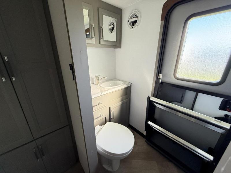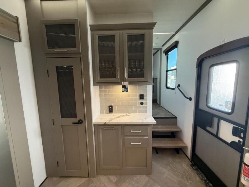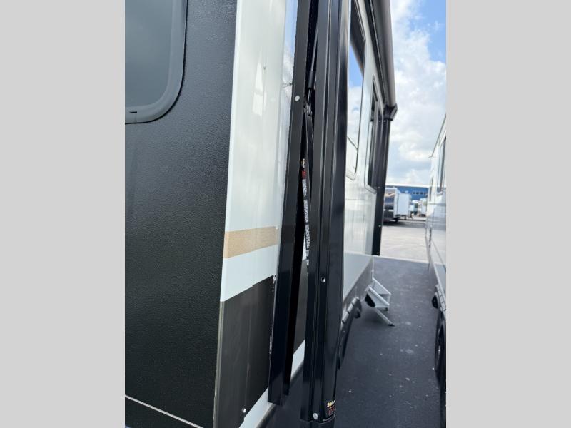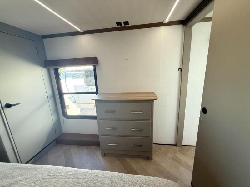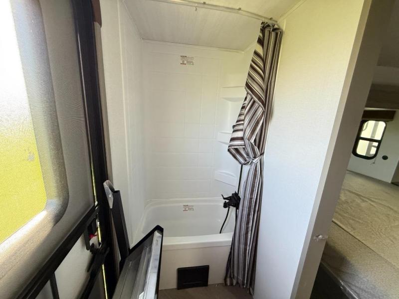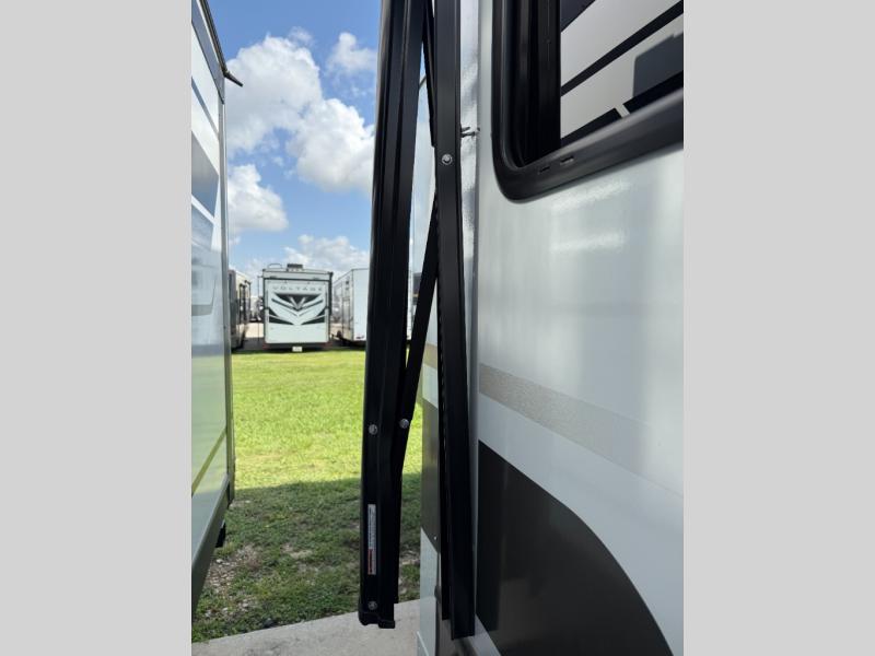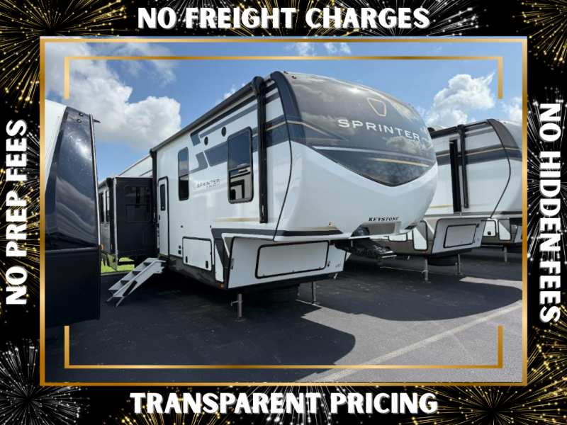 The Sprinter fifth wheels by Keystone feature spacious living areas, plenty of storage, and outstanding towability. Each unit is constructed with 2" aluminum framed and laminated sidewalls, a fully walkable roof, and dual layer insulation to help extend your camping season. The heated pass-through storage includes lockable slam latch baggage doors so you can easily pack your gear, and the one-touch 4-point leveling system features return hookup memory to have you set up in no-time. Head inside to find Congoleum vinyl flooring, Thomas Payne luxury collection furniture, residential style seamless marbled countertops, and an upgraded bedspread to name a few comforts. The Sprinter also includes a Girard tankless on-demand water heater, a central command center, plus a 30k BTU furnace and two A/C units to ensure your comfort!