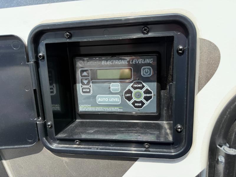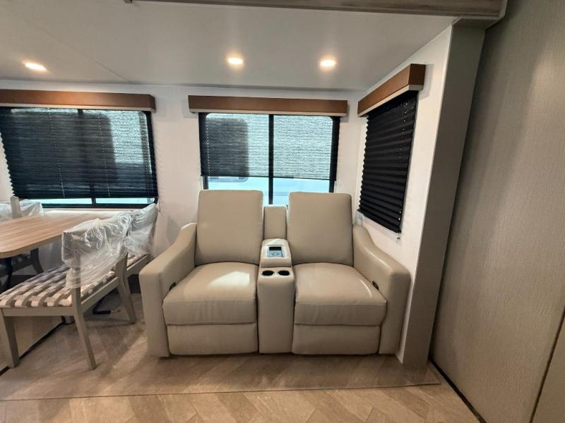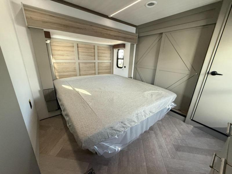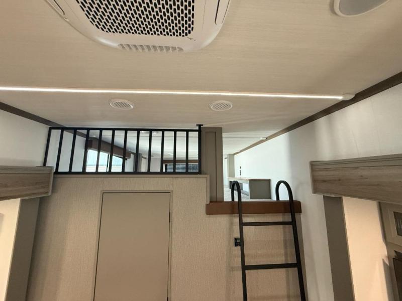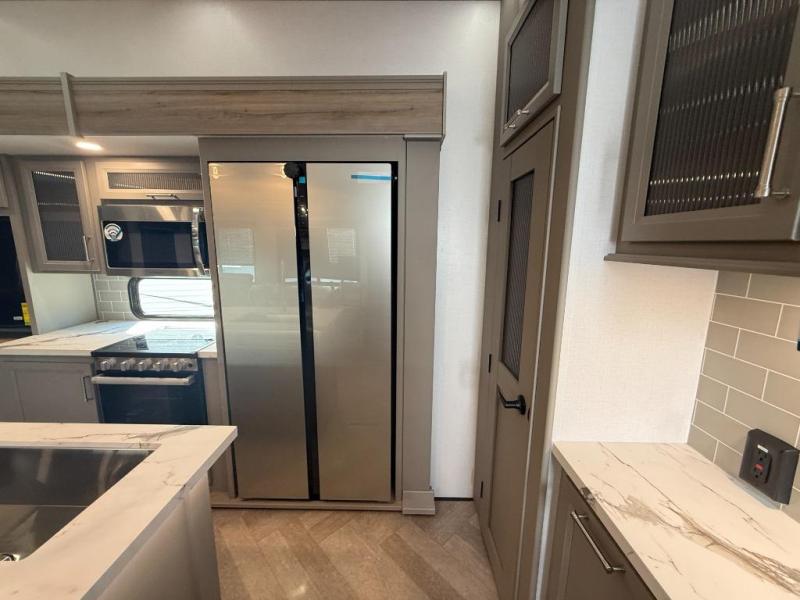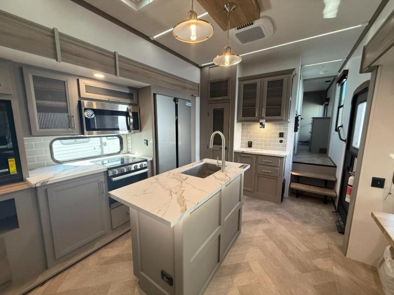 Two bedrooms and two full baths make this fifth wheel perfect for camping with friends and family! The front bedroom includes a king bed slide out with storage underneath, a wardrobe with a shelf, plus a closet with washer and dryer prep if you want to add these appliances. The master suite includes a second king bed slide out, dual wardrobes and a dresser, plus a full rear bath with one of the dual entry doors. There is also a loft area above this room with plenty of space, an entertainment/gaming center, and a ladder. Everyone can meet in the main living area to relax on the theater seating or dine at the booth dinette. And a full kitchen is complete with an island, pantry, 16 cu. ft. 12V refrigerator, and a hutch to name a few convenient features!