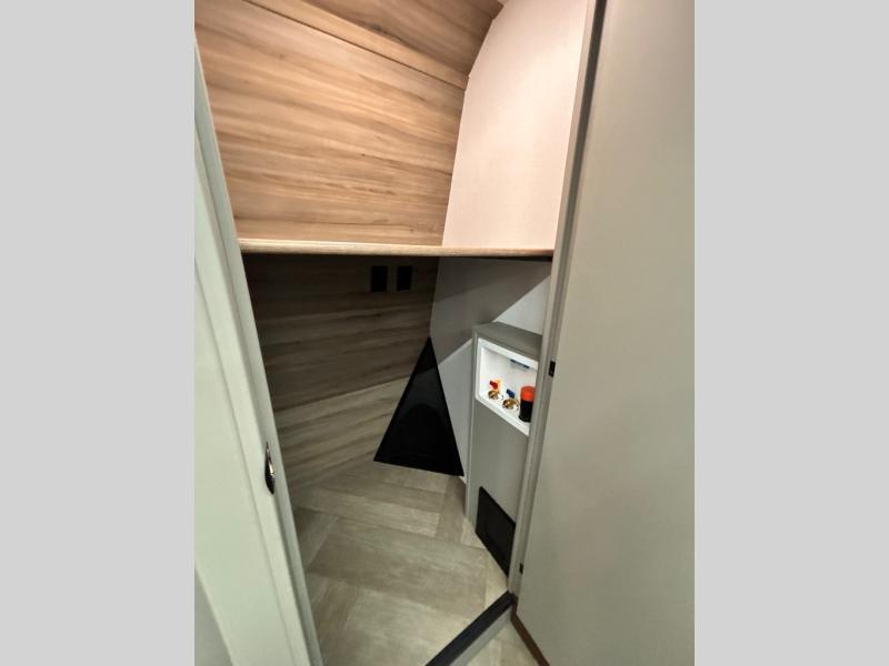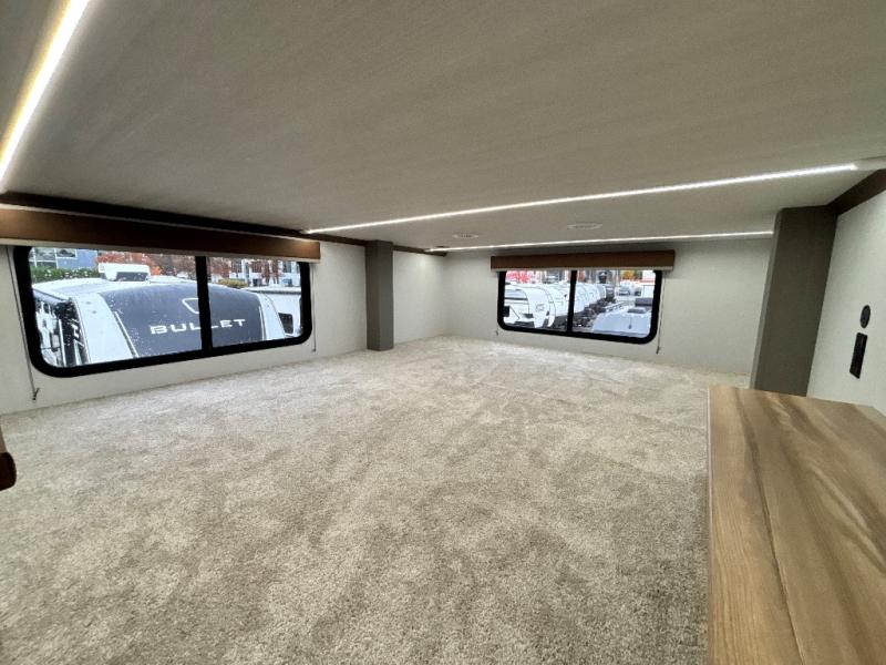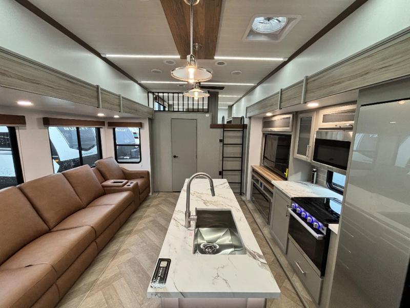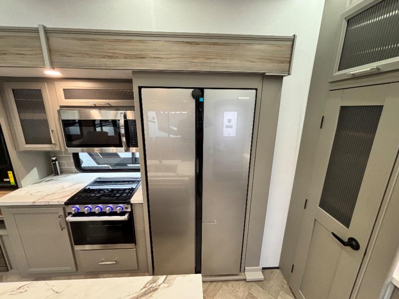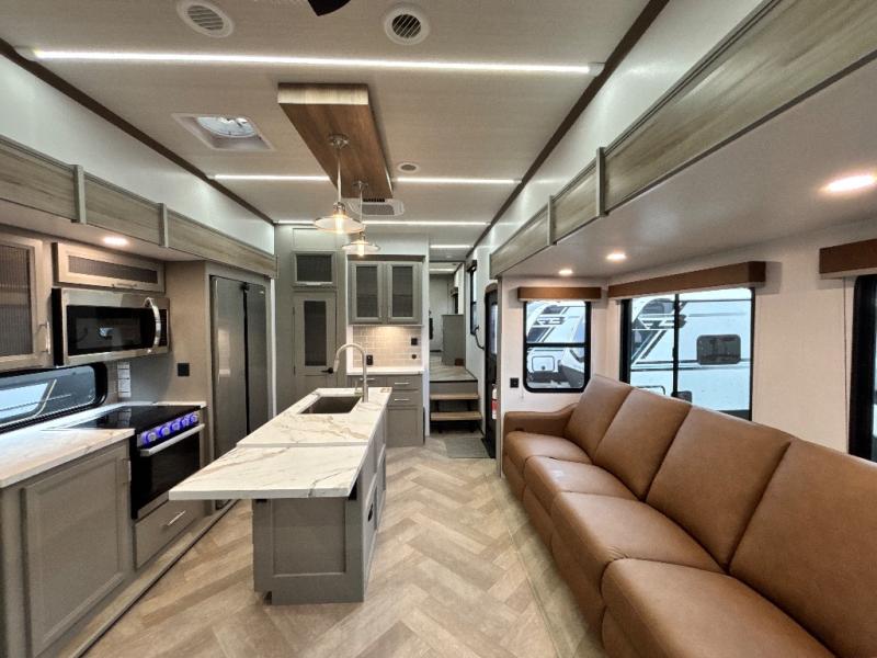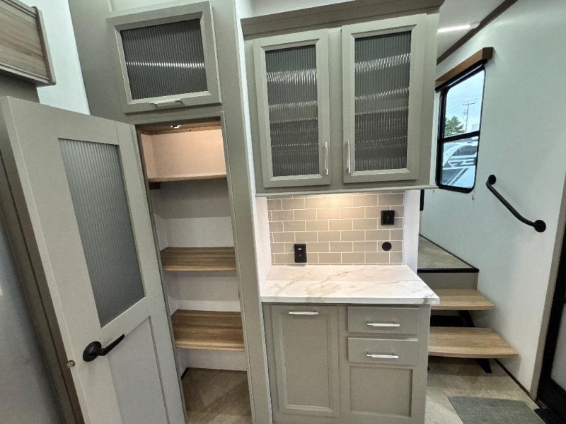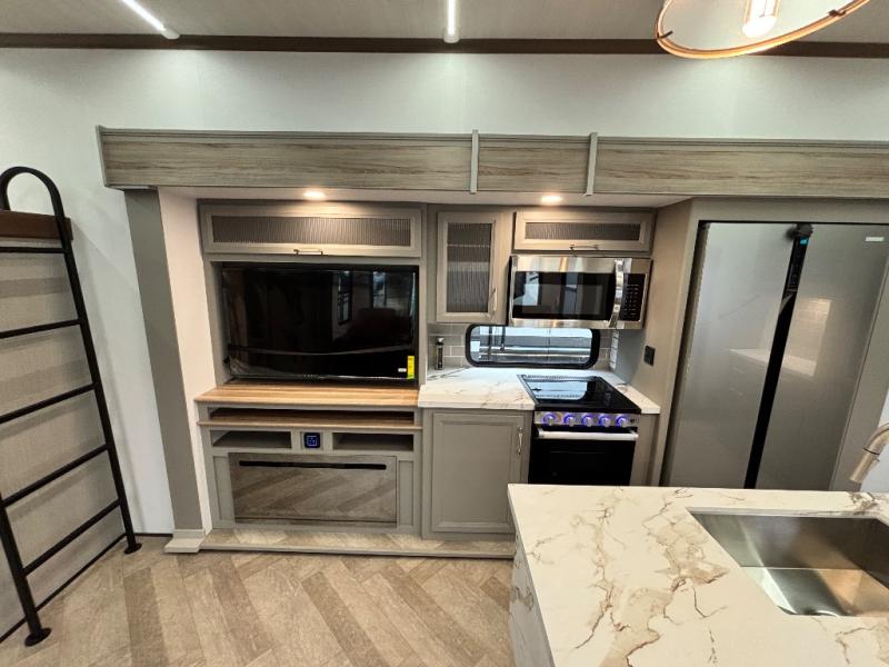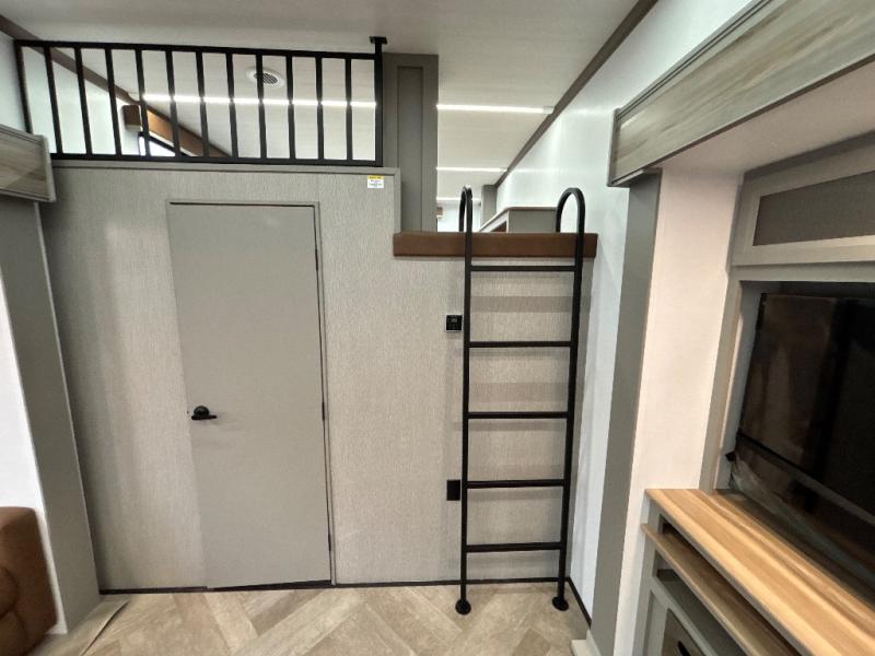 Two bedrooms and two full baths make this fifth wheel perfect for camping with friends and family! The front bedroom includes a king bed slide out with storage underneath, a wardrobe with a shelf, plus a closet with washer and dryer prep if you want to add these appliances. The master suite includes a second king bed slide out, dual wardrobes and a dresser, plus a full rear bath with one of the dual entry doors. There is also a loft area above this room with plenty of space, an entertainment/gaming center, and a ladder. Everyone can meet in the main living area to relax on the theater seating or dine at the booth dinette. And a full kitchen is complete with an island, pantry, 16 cu. ft. 12V refrigerator, and a hutch to name a few convenient features!