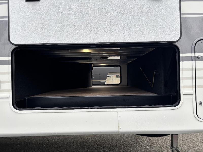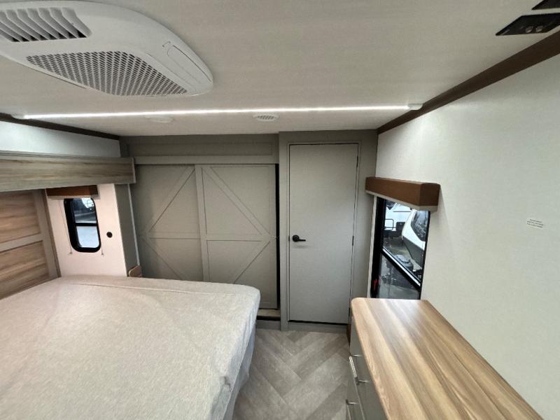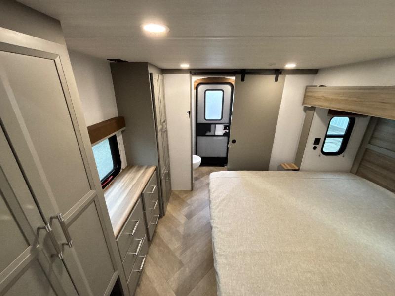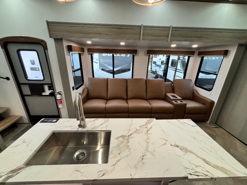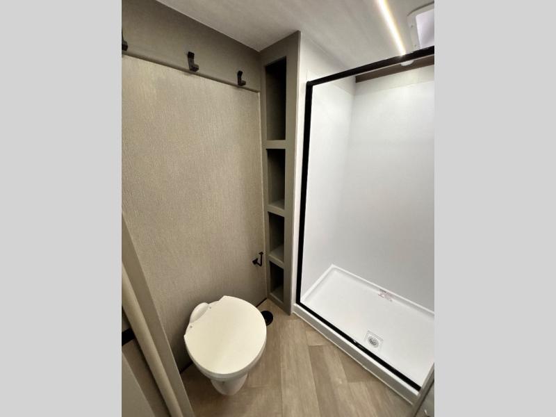 The Sprinter fifth wheels by Keystone feature spacious living areas, plenty of storage, and outstanding towability. Each unit is constructed with 2" aluminum framed and laminated sidewalls, a fully walkable roof, and dual layer insulation to help extend your camping season. The heated pass-through storage includes lockable slam latch baggage doors so you can easily pack your gear, and the one-touch 4-point leveling system features return hookup memory to have you set up in no-time. Head inside to find Congoleum vinyl flooring, Thomas Payne luxury collection furniture, residential style seamless marbled countertops, and an upgraded bedspread to name a few comforts. The Sprinter also includes a Girard tankless on-demand water heater, a central command center, plus a 30k BTU furnace and two A/C units to ensure your comfort!