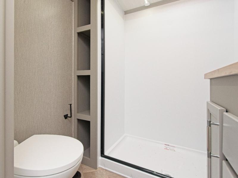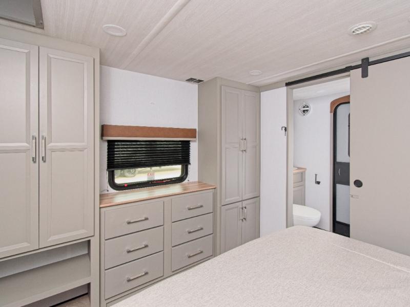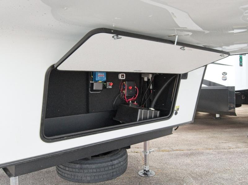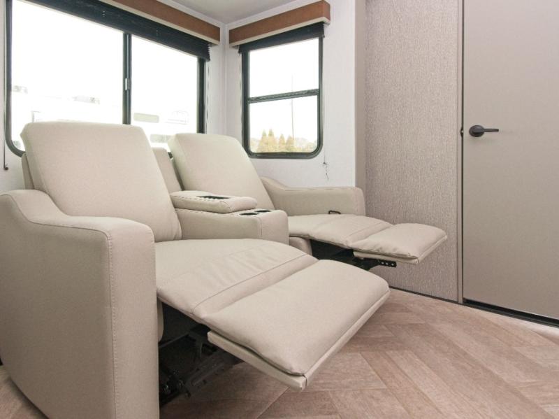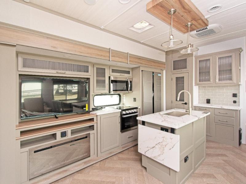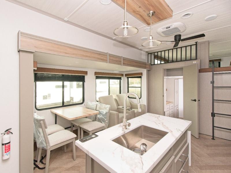 Two bedrooms and two full baths make this fifth wheel perfect for camping with friends and family! The front bedroom includes a king bed slide out with storage underneath, a wardrobe with a shelf, plus a closet with washer and dryer prep if you want to add these appliances. The master suite includes a second king bed slide out, dual wardrobes and a dresser, plus a full rear bath with one of the dual entry doors. There is also a loft area above this room with plenty of space, an entertainment/gaming center, and a ladder. Everyone can meet in the main living area to relax on the theater seating or dine at the booth dinette. And a full kitchen is complete with an island, pantry, 16 cu. ft. 12V refrigerator, and a hutch to name a few convenient features!