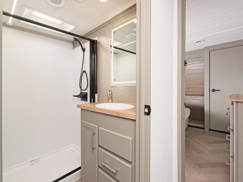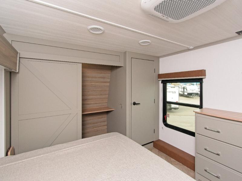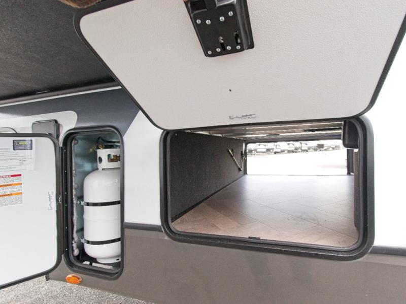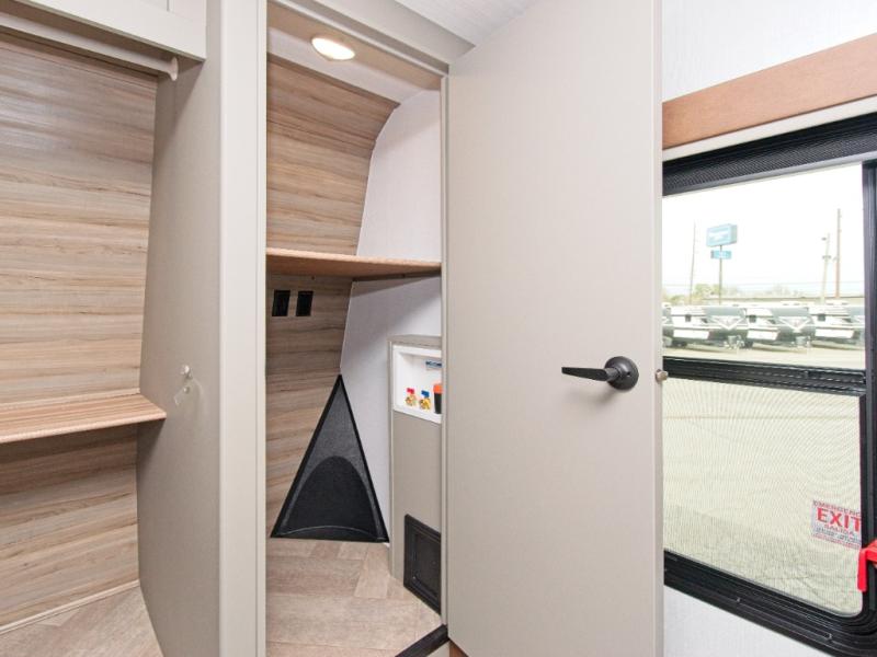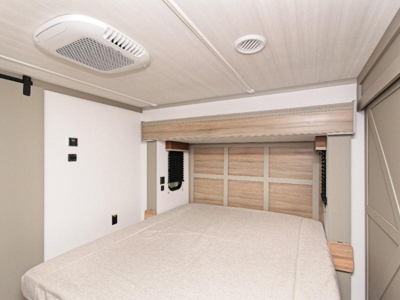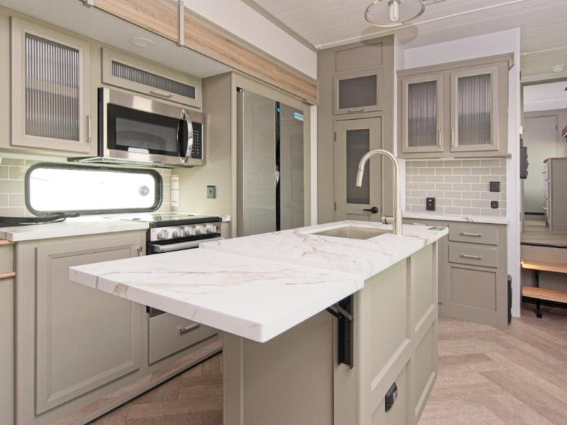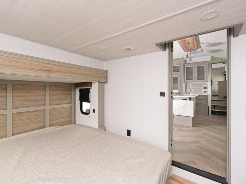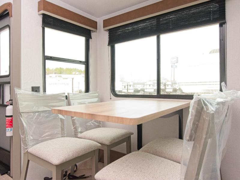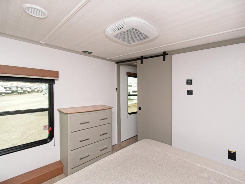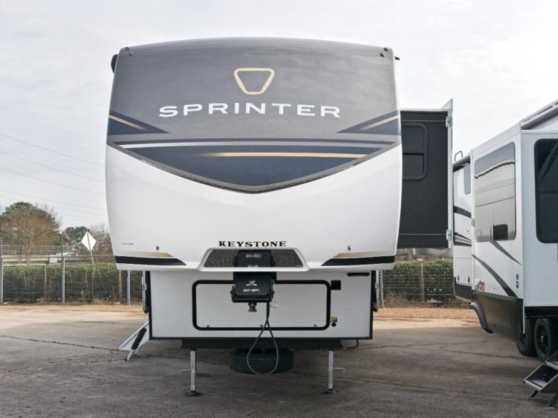 The Sprinter fifth wheels by Keystone feature spacious living areas, plenty of storage, and outstanding towability. Each unit is constructed with 2" aluminum framed and laminated sidewalls, a fully walkable roof, and dual layer insulation to help extend your camping season. The heated pass-through storage includes lockable slam latch baggage doors so you can easily pack your gear, and the one-touch 4-point leveling system features return hookup memory to have you set up in no-time. Head inside to find Congoleum vinyl flooring, Thomas Payne luxury collection furniture, residential style seamless marbled countertops, and an upgraded bedspread to name a few comforts. The Sprinter also includes a Girard tankless on-demand water heater, a central command center, plus a 30k BTU furnace and two A/C units to ensure your comfort!