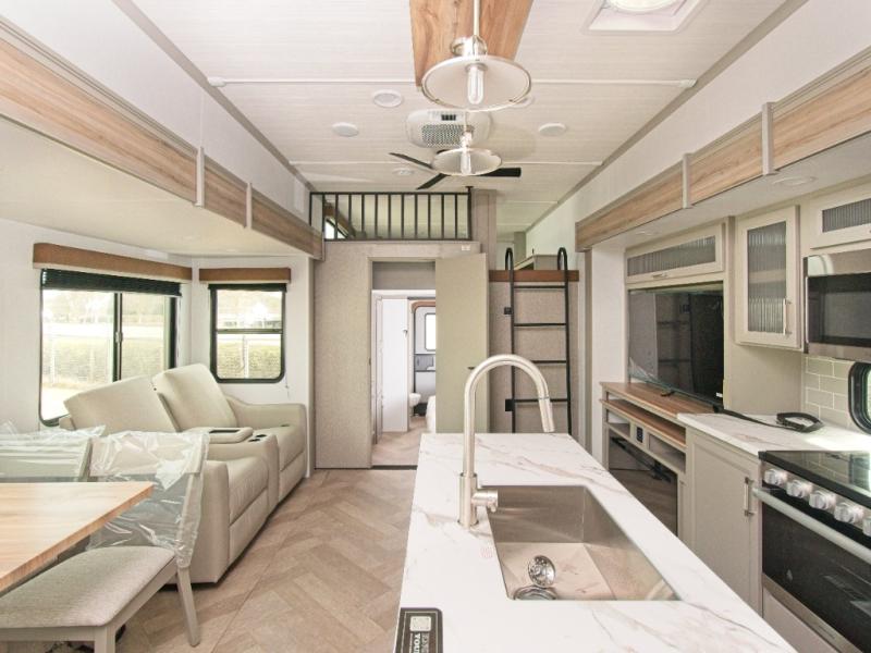 Discover the 2026 Keystone Sprinter 3920DSL luxury destination trailer featuring dual lofts, king suite, opposing slides, residential kitchen, washer/dryer prep, climate protection, solar prep, and nationwide delivery.