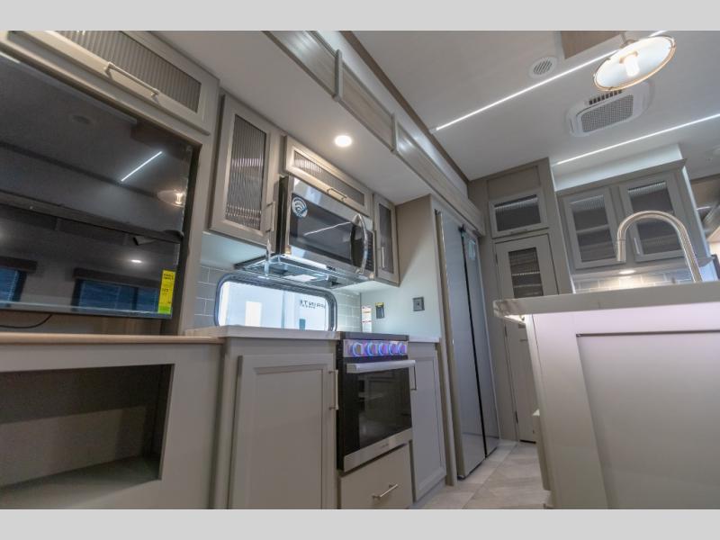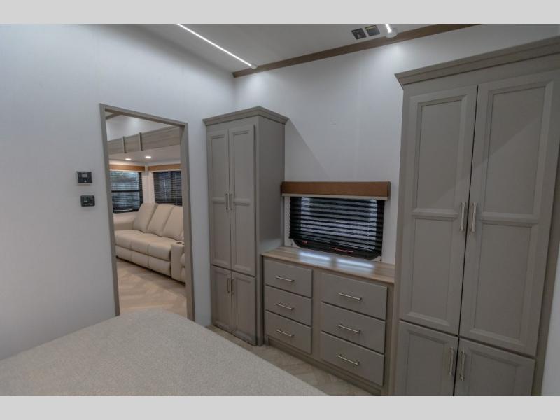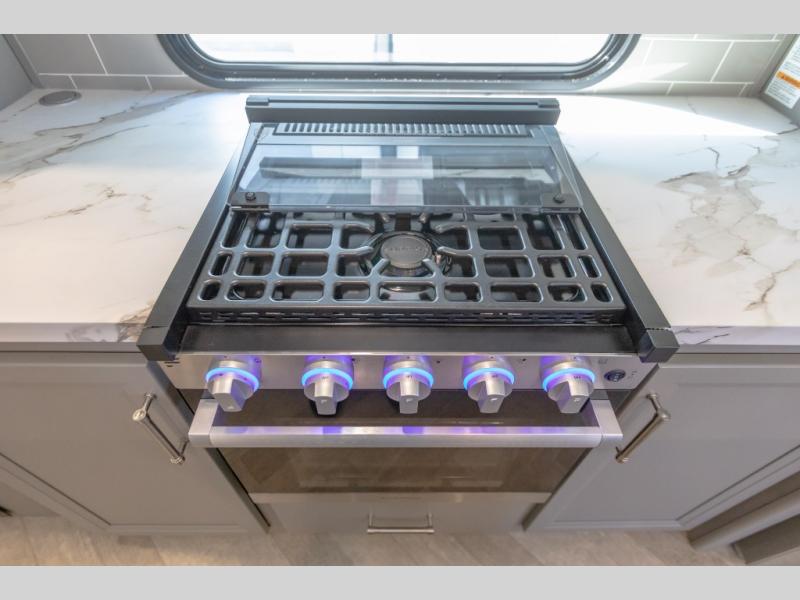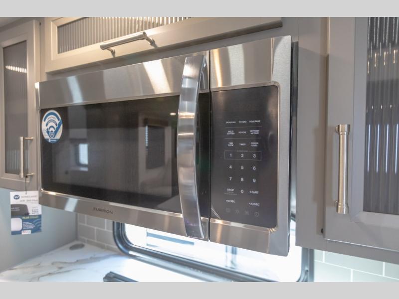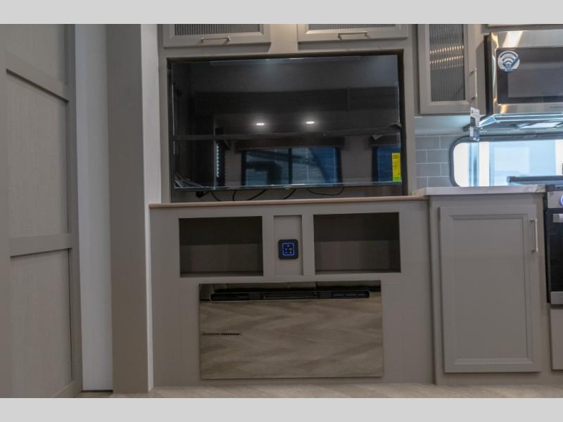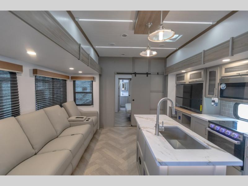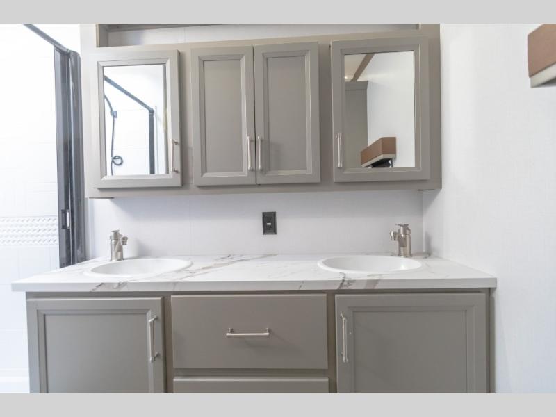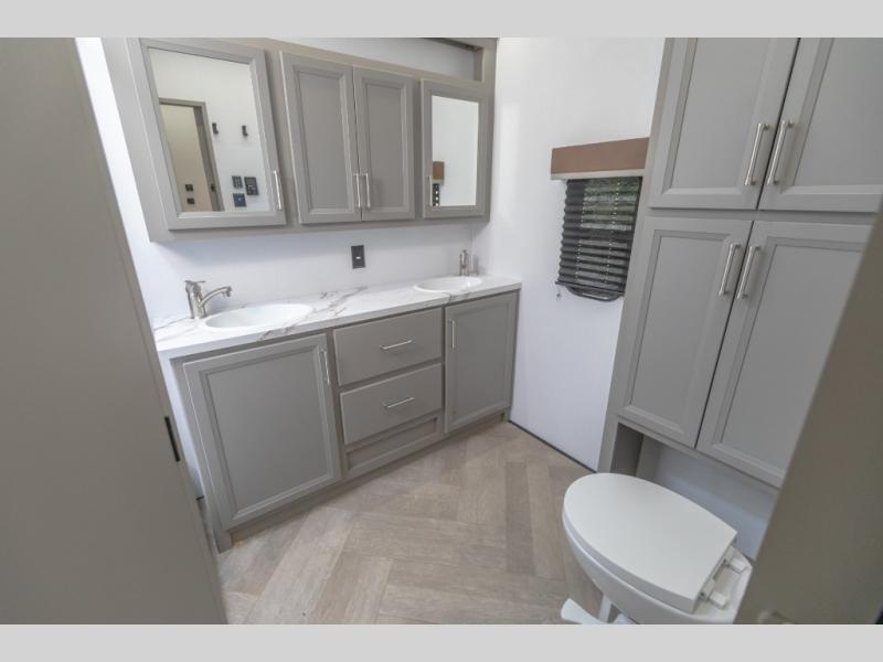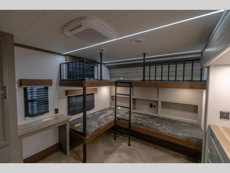 Pack your bags and head to your favorite state park in this four slide out fifth wheel. Up front, the bunkhouse suite includes two bunk beds, a desk, a slide out with a TV hookup, and a half bath for convenience. You'll have the master bedroom all to yourselves with a king bed slide out, plenty of storage, and a full rear bath with dual bath sinks so you both can get ready for bed at once. The chef of your group can make meals on the three burner gas range or in the stainless steel microwave, and food can be stored in the 12V refrigerator and pantry. A booth dinette provides a place to dine, or you can choose the optional free-standing dinette. And the full reclining theater seating across from the fireplace and 50" TV will make movie night cozy!