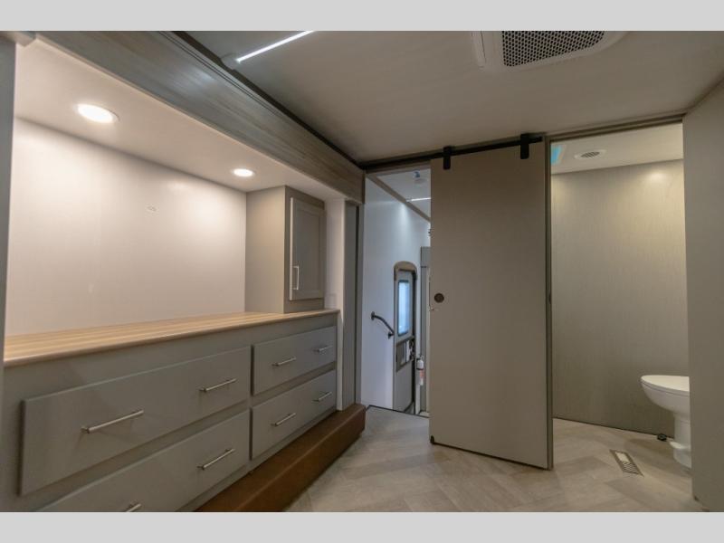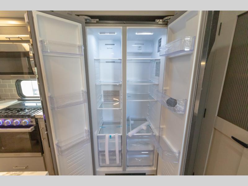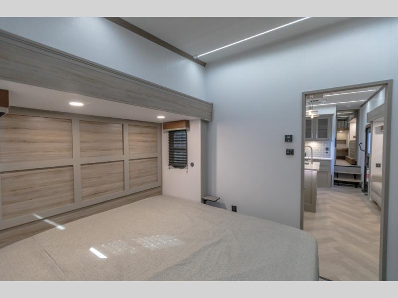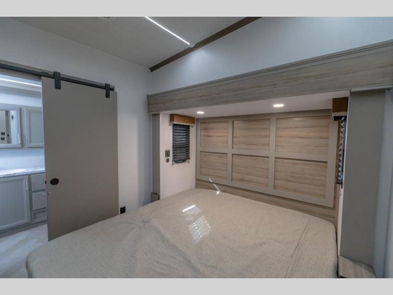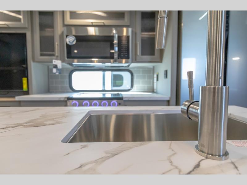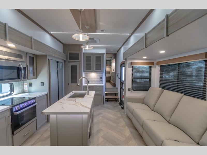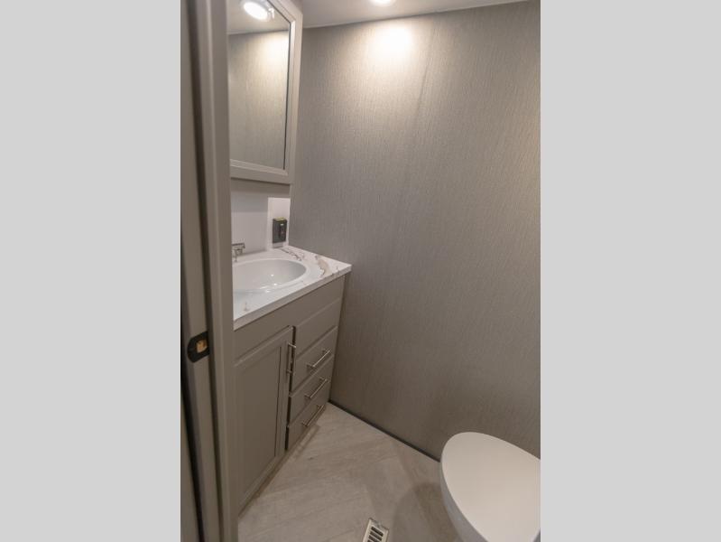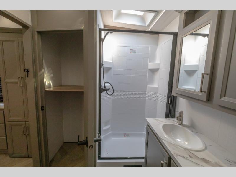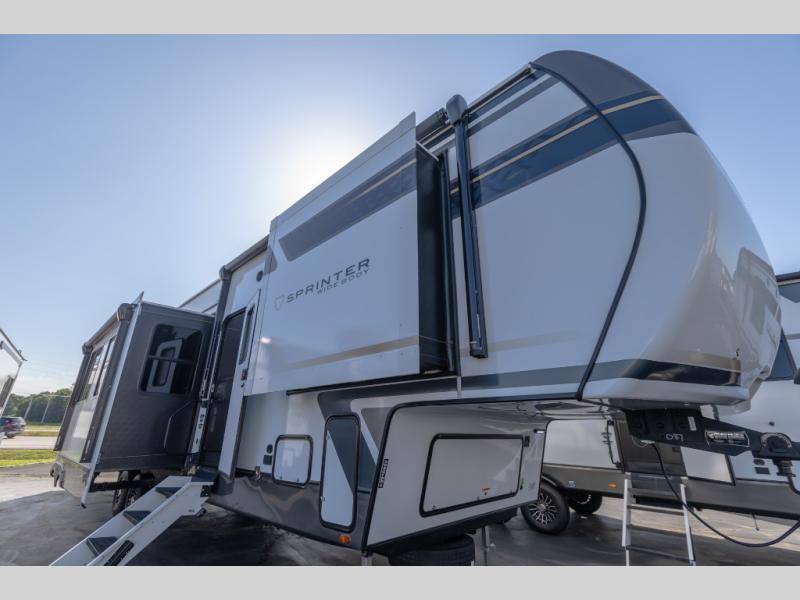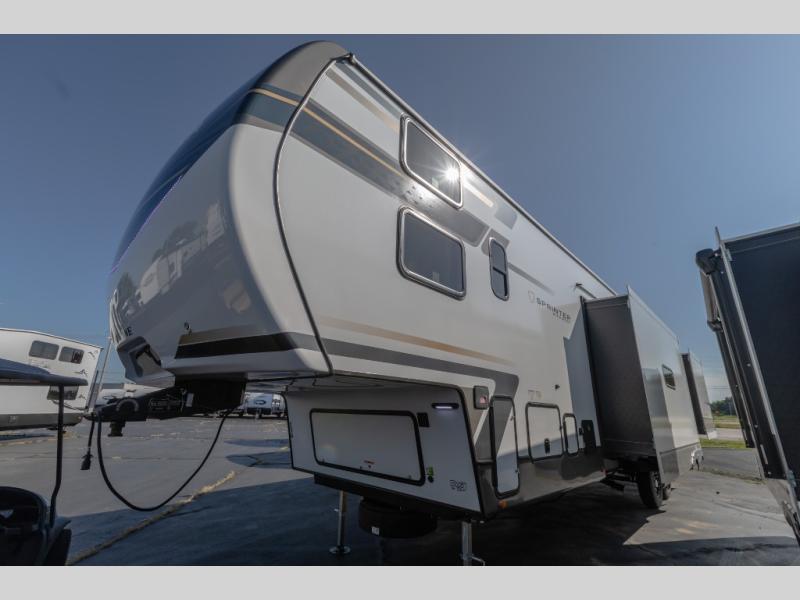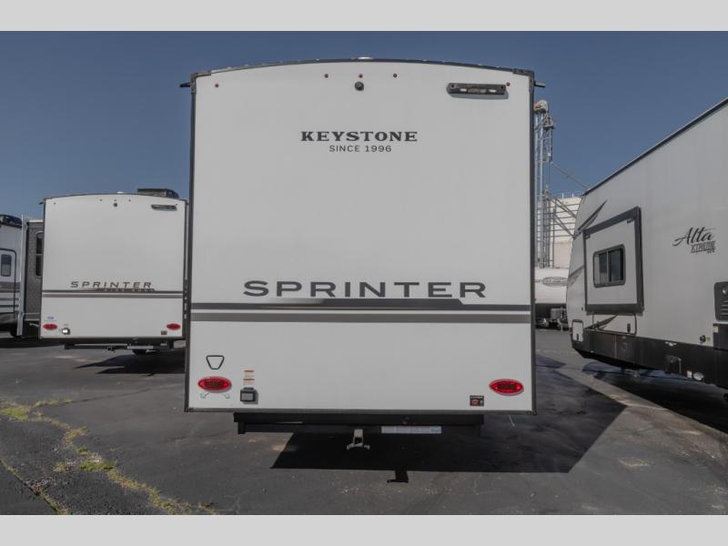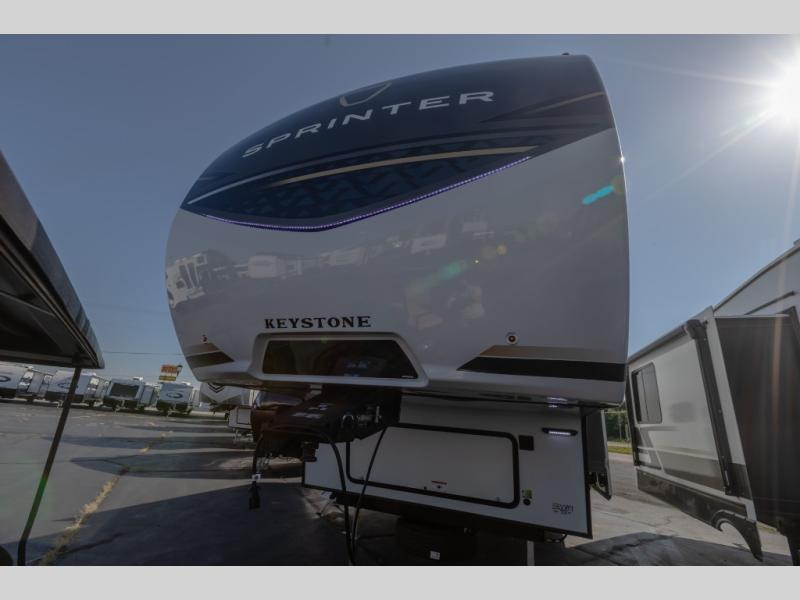 The Sprinter fifth wheels by Keystone feature spacious living areas, plenty of storage, and outstanding towability. Each unit is constructed with 2" aluminum framed and laminated sidewalls, a fully walkable roof, and dual layer insulation to help extend your camping season. The heated pass-through storage includes lockable slam latch baggage doors so you can easily pack your gear, and the one-touch 4-point leveling system features return hookup memory to have you set up in no-time. Head inside to find Congoleum vinyl flooring, Thomas Payne luxury collection furniture, residential style seamless marbled countertops, and an upgraded bedspread to name a few comforts. The Sprinter also includes a Girard tankless on-demand water heater, a central command center, plus a 30k BTU furnace and two A/C units to ensure your comfort!