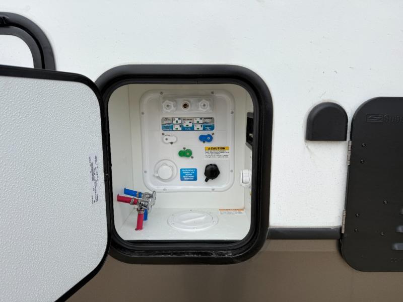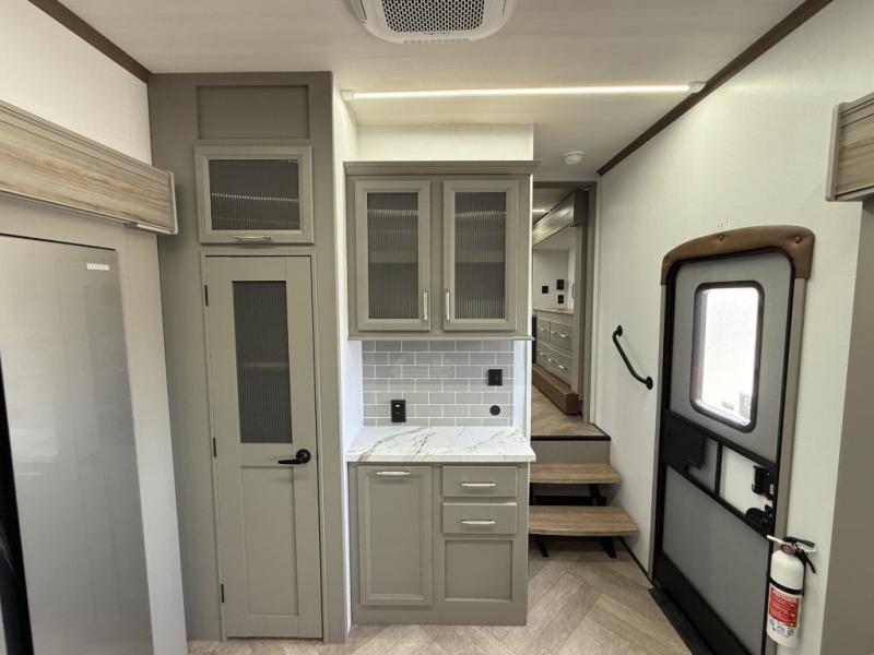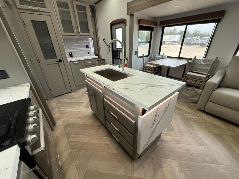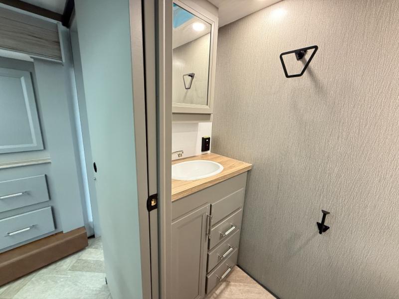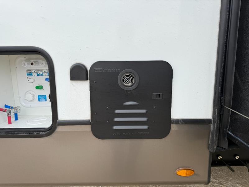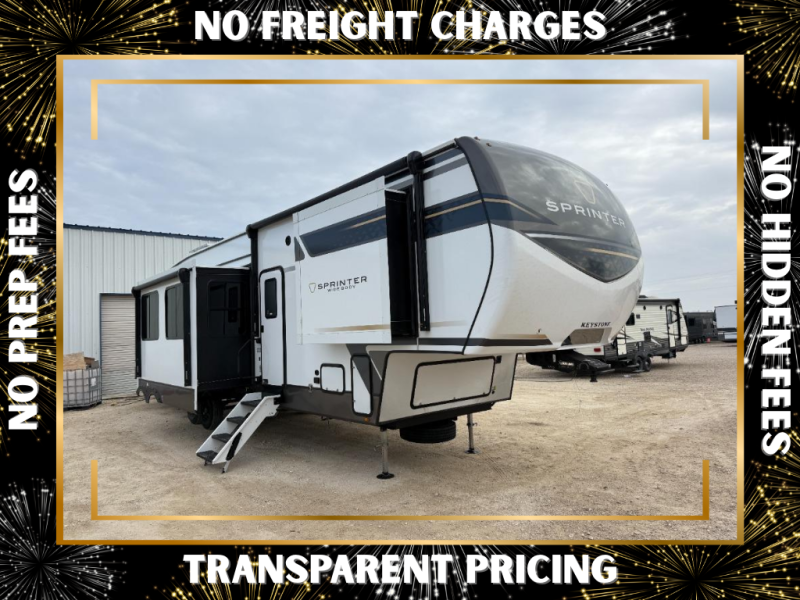 The Sprinter fifth wheels by Keystone feature spacious living areas, plenty of storage, and outstanding towability. Each unit is constructed with 2" aluminum framed and laminated sidewalls, a fully walkable roof, and dual layer insulation to help extend your camping season. The heated pass-through storage includes lockable slam latch baggage doors so you can easily pack your gear, and the one-touch 4-point leveling system features return hookup memory to have you set up in no-time. Head inside to find Congoleum vinyl flooring, Thomas Payne luxury collection furniture, residential style seamless marbled countertops, and an upgraded bedspread to name a few comforts. The Sprinter also includes a Girard tankless on-demand water heater, a central command center, plus a 30k BTU furnace and two A/C units to ensure your comfort!