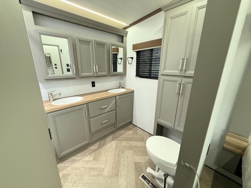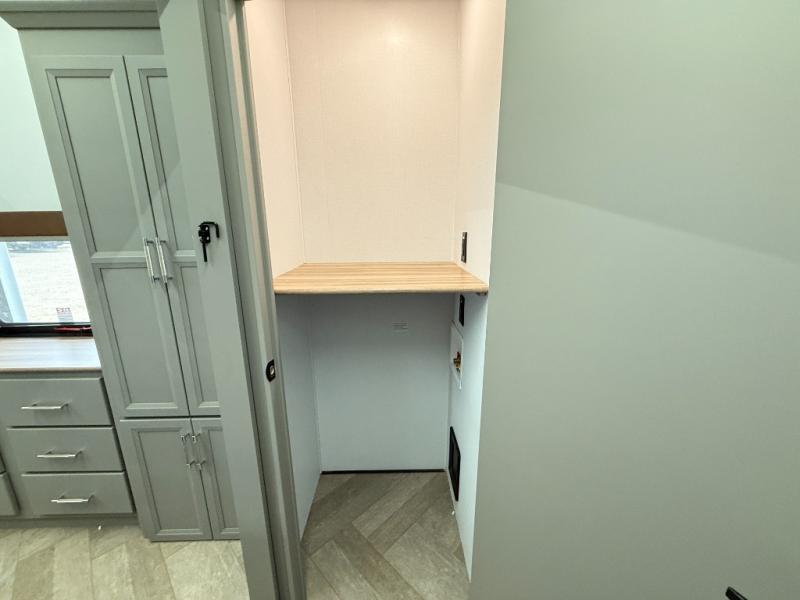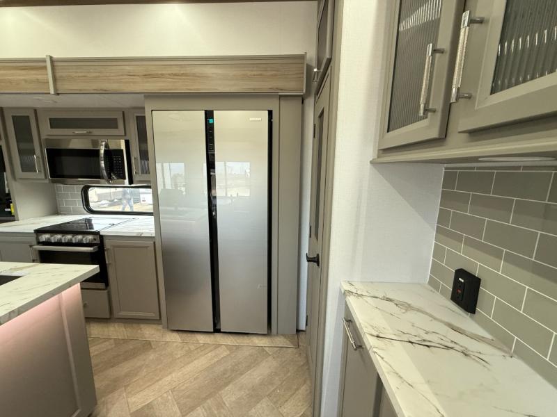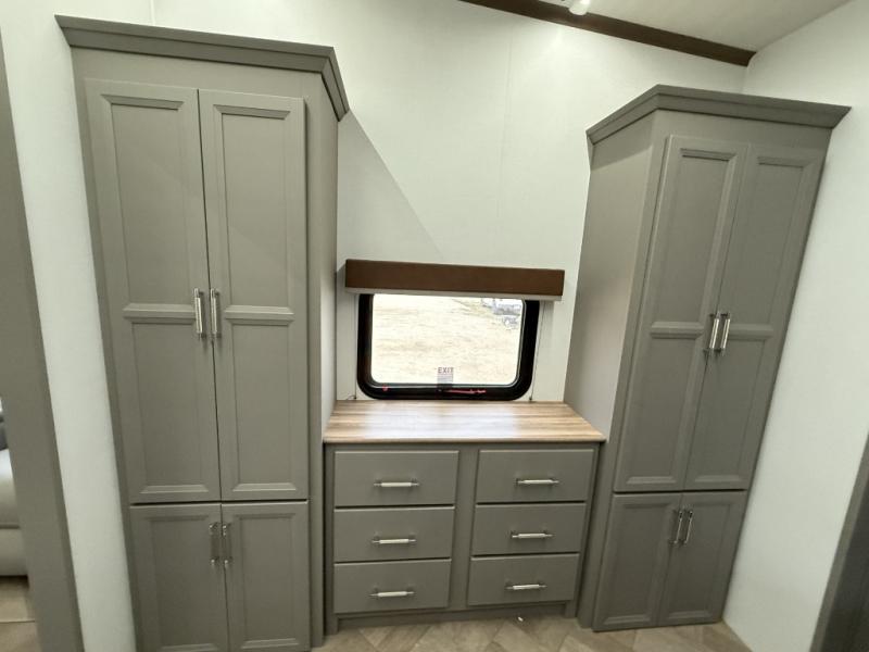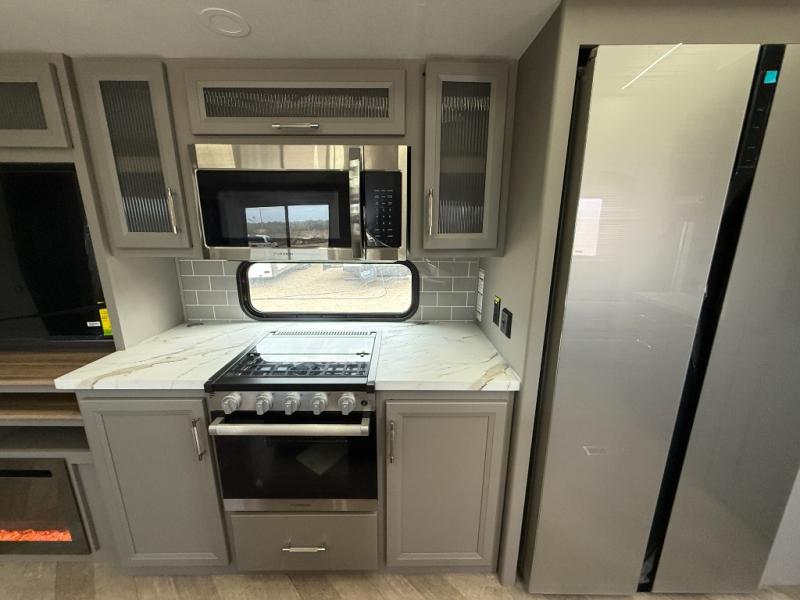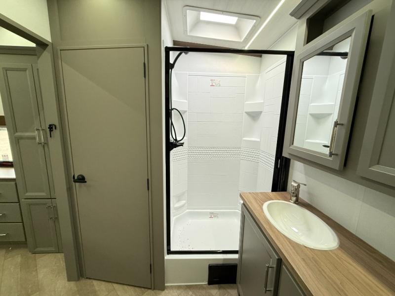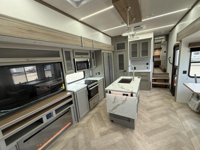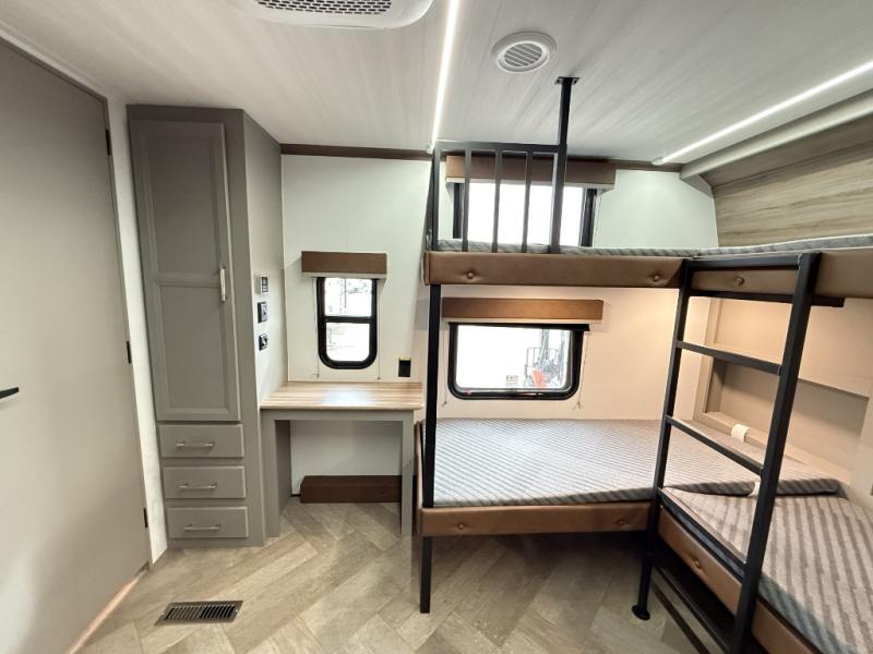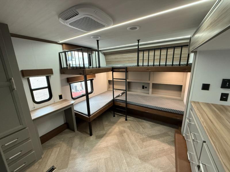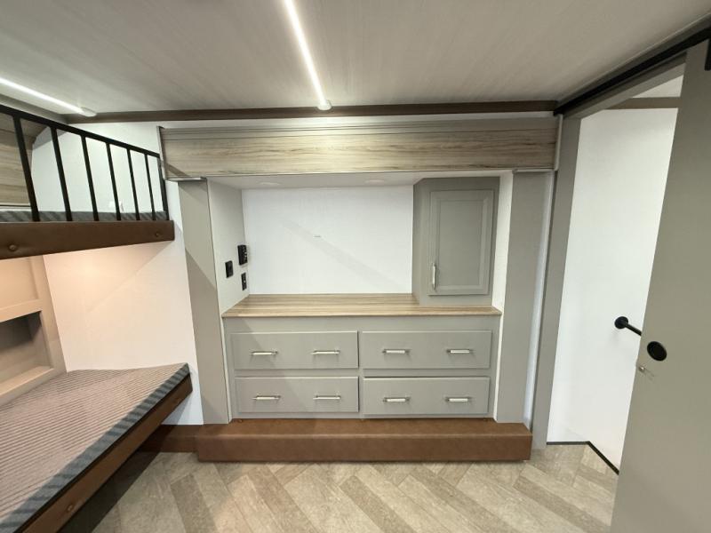 Pack your bags and head to your favorite state park in this four slide out fifth wheel. Up front, the bunkhouse suite includes two bunk beds, a desk, a slide out with a TV hookup, and a half bath for convenience. You'll have the master bedroom all to yourselves with a king bed slide out, plenty of storage, and a full rear bath with dual bath sinks so you both can get ready for bed at once. The chef of your group can make meals on the three burner gas range or in the stainless steel microwave, and food can be stored in the 12V refrigerator and pantry. A booth dinette provides a place to dine, or you can choose the optional free-standing dinette. And the full reclining theater seating across from the fireplace and 50" TV will make movie night cozy!