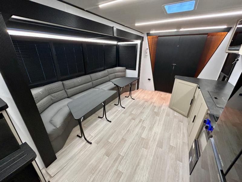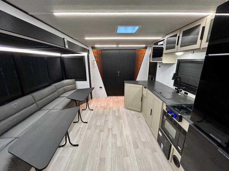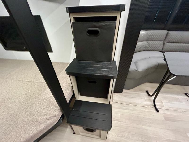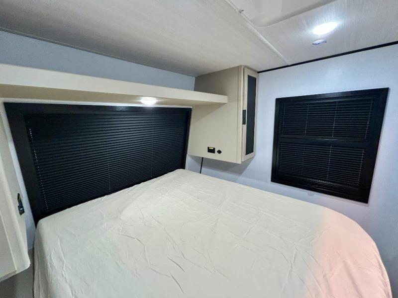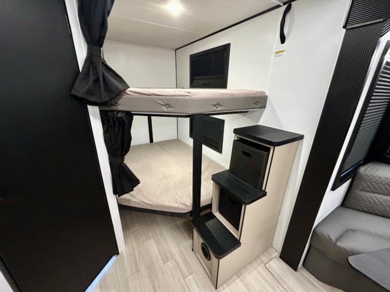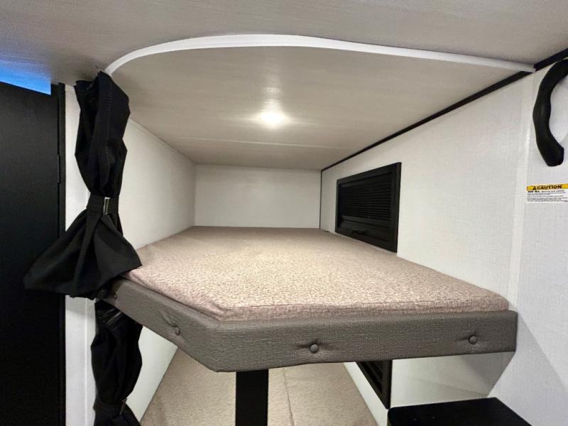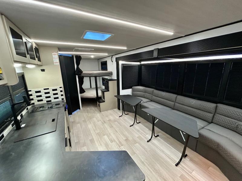 This trailer features double-size bunk beds, perfect for kids or adults, and a front bedroom with a queen bed, shelf, and wardrobes on each side. The living area is a hub of activity, with a super storage sofa that doubles as a comfortable seating area, and two tables that provide plenty of space for meals, games, or working on projects. The kitchen is well-equipped with a refrigerator, overhead cabinets, and a pantry ideal for storing your favorite seasonings. Plus, a 32" TV provides entertainment for the whole family, perfect for relaxing after a long day of exploring, and the full bathroom is a convenient and essential feature, providing a private space to freshen up after a long day.