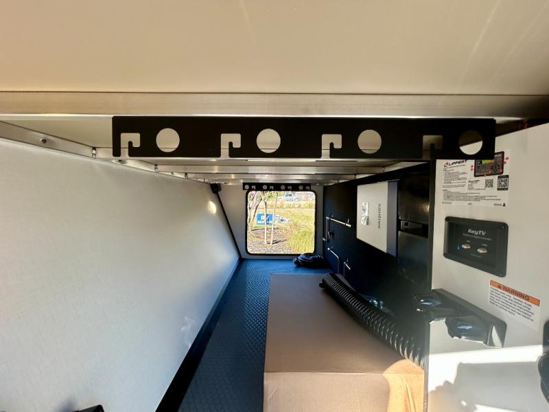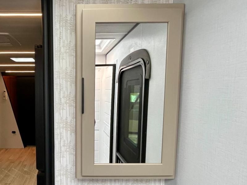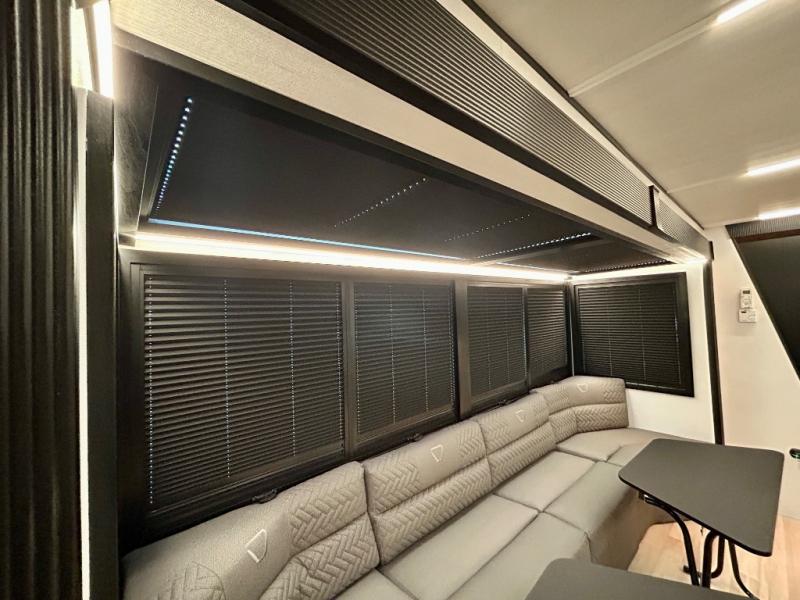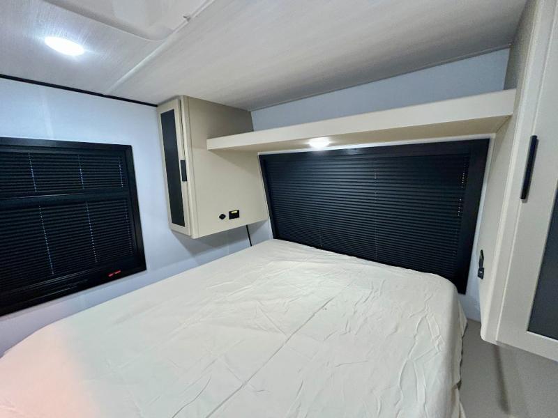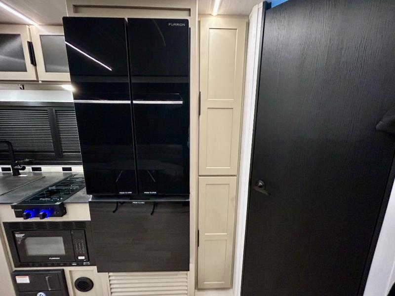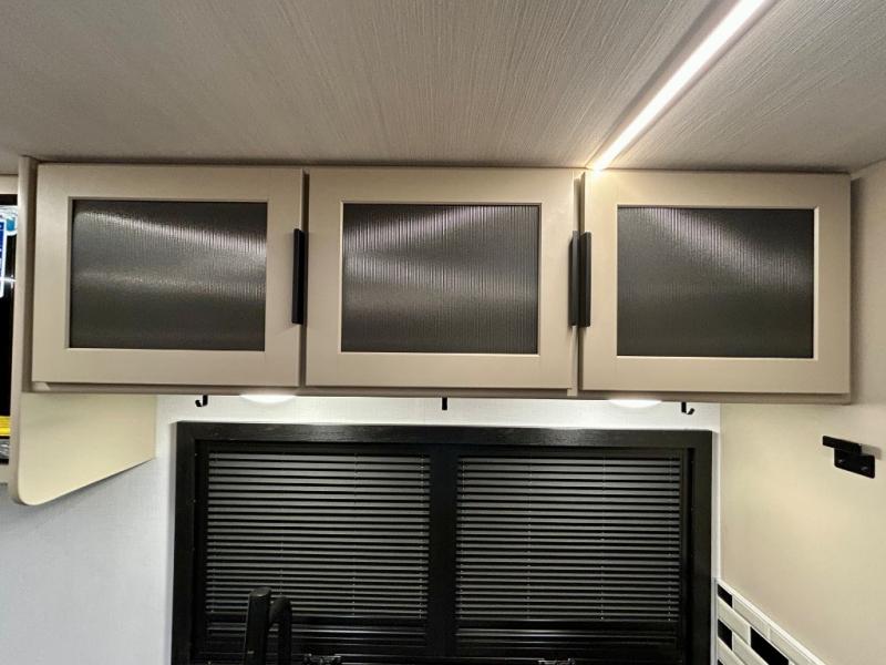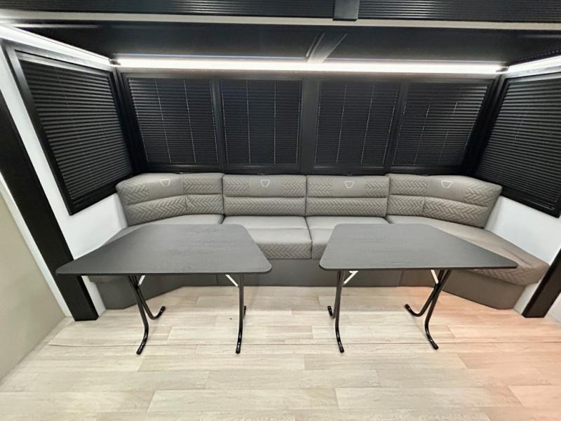 This trailer features double-size bunk beds, perfect for kids or adults, and a front bedroom with a queen bed, shelf, and wardrobes on each side. The living area is a hub of activity, with a super storage sofa that doubles as a comfortable seating area, and two tables that provide plenty of space for meals, games, or working on projects. The kitchen is well-equipped with a refrigerator, overhead cabinets, and a pantry ideal for storing your favorite seasonings. Plus, a 32" TV provides entertainment for the whole family, perfect for relaxing after a long day of exploring, and the full bathroom is a convenient and essential feature, providing a private space to freshen up after a long day.